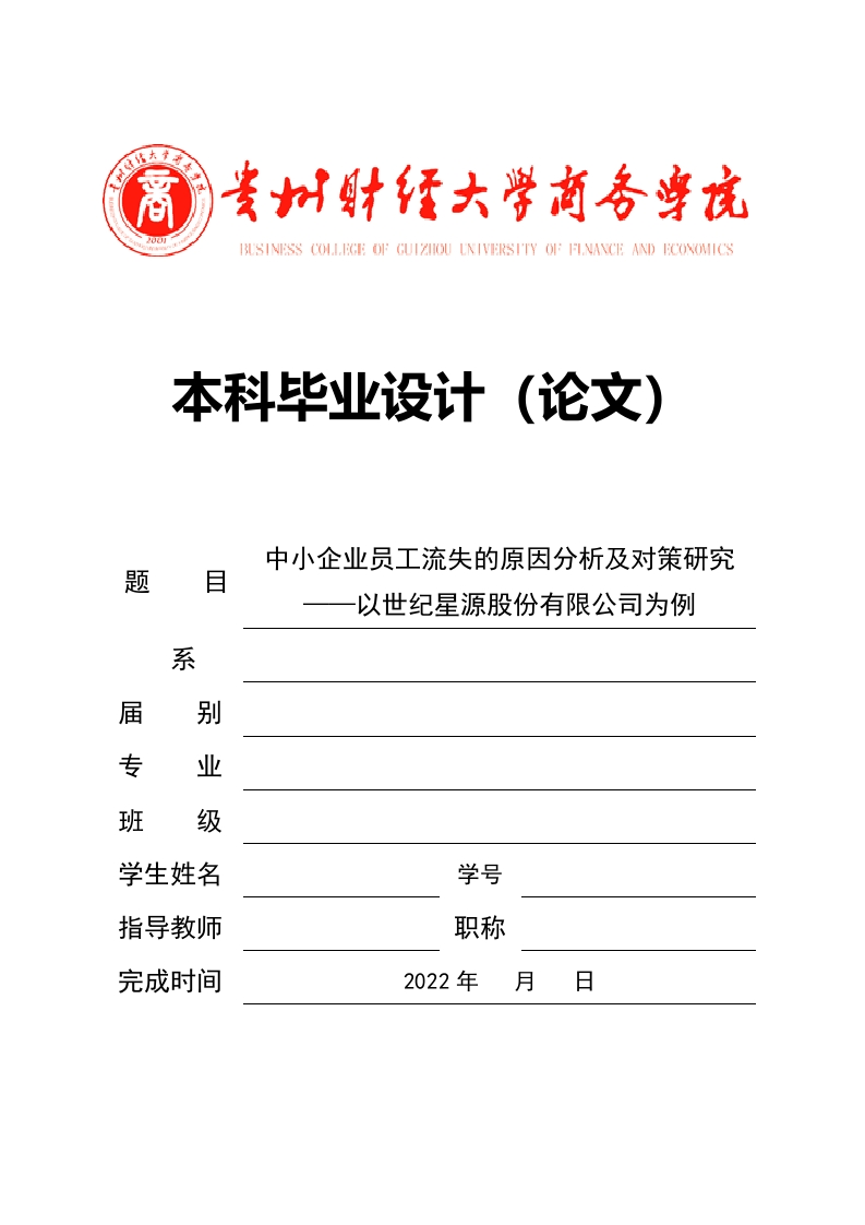 本科毕业设计(论文)中小企业员工流失的原因分析及对策研究题目以世纪星源股份有限公司为例系届别专业班级学生姓名学号指导教师职称完成时间2022年月日贵州财经大学商务学院本科毕业设计(论文)原创性声明本人郑重声明:本人所呈交的毕业设计(论文),是在指导老师的指导下独立进行研究所取得的成果。毕业设计(论文)中凡引用他人已经发表或未发表的成果、数据、观点等,均已明确注明出处。除文中已经注明引用的内容外,不包含任何其他个人或集体已经发表或撰写过的科研成果。对本文的研究成果做出重要贡献的个人和集体,均已在文中以明确方式标明。本声明的法律责任由本人承担。论文作者签名:日期:贵州财经大学商务学院本科毕业设计(论文)关于使用授权的声明本人在指导老师指导下所完成的毕业设计(论文)及相关的资料(包括图纸、试验记录、原始数据、实物照片、图片、录音带、设计手稿等),知识产权归属贵州财经大学商务学院。本人完全了解贵州财经大学商务学院有关保存、使用毕业设计(论文)的规定,本人授权贵州财经大学商务学院可以将本毕业设计(论文)的全部或部分内容编入有关数据库进行检索,可以采用任何复制手段保存和汇编本毕业设计(论文)。如果发表相关成果,一定征得指导教师同意,且第一署名单位为贵州财经大学商务学院。本人离校后使用毕业设计(论文)或与该论文直接相关的学术论文或成果时,第一署名单位仍然为贵州财经大学商务学院。论文作者签名:日期:指导教师签名:日期: