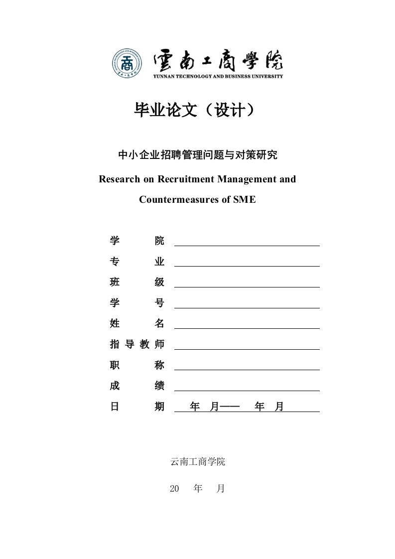 YUNNAN TECHNOLOGY AND BUSINESS UNIVERSITY毕业论文(设计)中小企业招聘管理问题与对策研究Research on Recruitment Management andCountermeasures of SME学院专业班级学号姓名指导教师职称成绩日期云南工商学院20年月云南工商学院毕业论文(设计)诚信声明本人声明,所呈交的论文(设计)是本人在导师的指导下独立完成的研究成果。除了文中特别加以标注引用的内容外,本论文(设计)不包含法律意义上已属于他人的任何形式的研究成果,也不包含本人已用于其他学位申请的论文(或成果。对本文的研究做出重要贡献的个人和集体,均已在文中以明确方式表明。本人完全意识到本声明的法律后果由本人承担。本毕业论文(设计)成果归云南工商学院所有。作者签名:(要求亲笔签字)日期:毕业论文中小企业招聘管理问题与对策研究Research on Recruitment Management andCountermeasures of SME