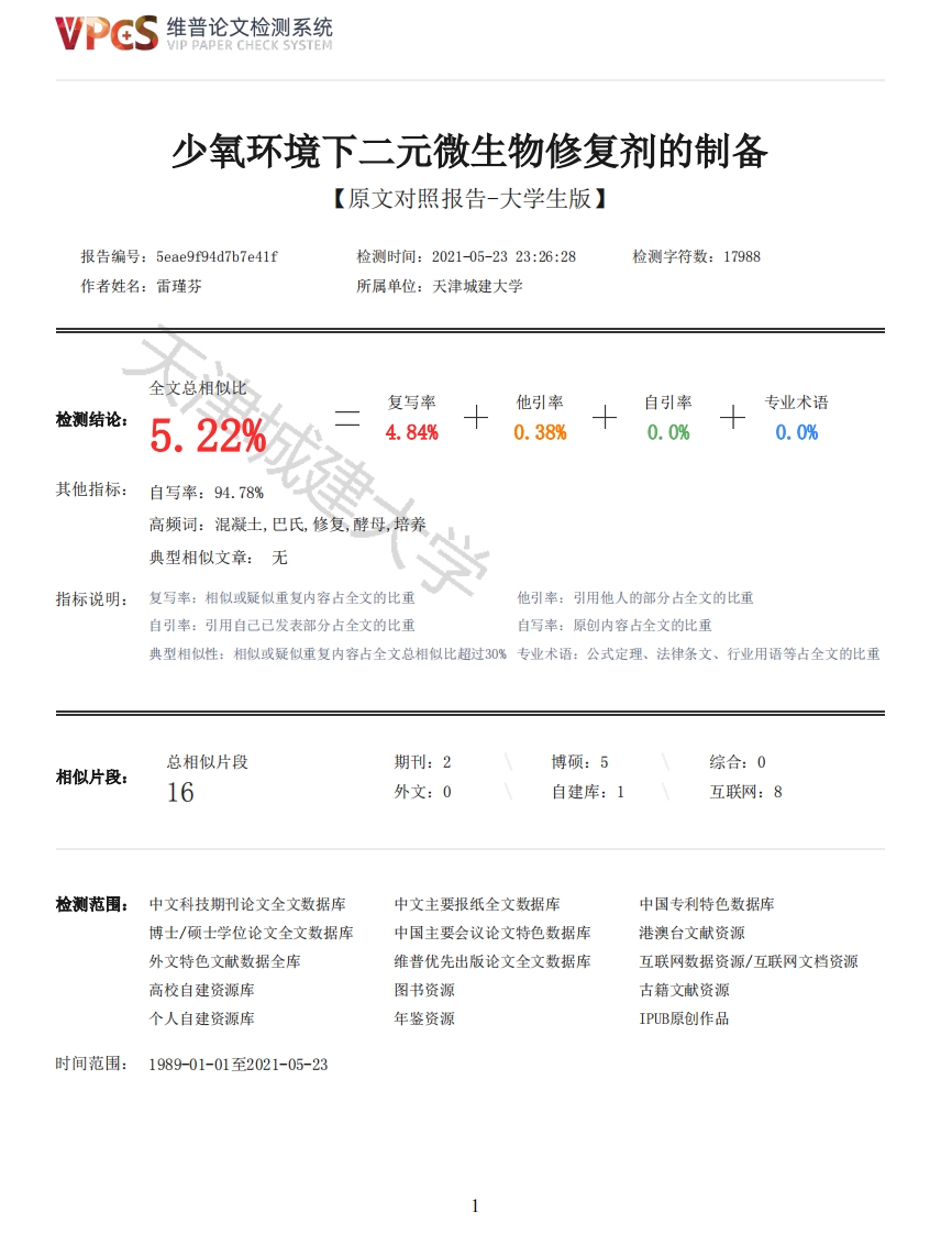 维普论文检测系统VIP PAPER CHECK SYSTEM少氧环境下二元微生物修复剂的制备【原文对照报告-大学生版】报告编号:5eae9f94d7b7e41f检测时间:2021-05-2323:26:28检测字符数:17988作者姓名:雷瑾芬所属单位:天津城建大学全文总相似比复写率他引率自引率专业术语检测结论:5.22%4.84%0.38%0.0%0.0%其他指标:自写率:94.78%高频词:混凝土,巴氏,修复,酵母,培养典型相似文章:无指标说明:复写率:相似或疑似重复内容占全文的比重他引率:引用他人的部分占全文的比重自引率:引用自己已发表部分占全文的比重自写率:原创内容占全文的比重典型相似性:相似或疑似重复内容占全文总相似比超过30%专业术语:公式定理、法律条文、行业用语等占全文的比重总相似片段期刊:2博硕:5综合:0相似片段:16外文:0自建库:1互联网:8检测范围:中文科技期刊论文全文数据库中文主要报纸全文数据库中国专利特色数据库博士/硕士学位论文全文数据库中国主要会议论文特色数据库港澳台文献资源外文特色文献数据全库维普优先出版论文全文数据库互联网数据资源/互联网文档资源高校自建资源库图书资源古籍文献资源个人自建资源库年鉴资源IPUB原创作品时间范围:1989-01-01至2021-05-23维普论文检测系统VIP PAPER CHECK SYSTEM原文对照颜色标注说明:■自写片段■复写片段(相似或疑似重复)口引用片段(引用)■专业术语(公式定理、法律条文、行业用语等)少氧环境下二元微生物修复剂的制备Preparation of Binary Microbial Self-healingAgent under Low Oxygen Environment学生姓名:雷瑾芬学生学号:1704030131专业名称:无机非金属材料工程指导教师:王雪平(讲师)材料科学与工程学院2021年5月独创性声明本人声明所呈交的毕业设计(论文)是本人在指导教师指导下进行的研究工作和取得的研究成果,除了文中特别加以引用标注之处外,论文中不包含其他人已经发表或撰写过的研究成果,没有伪造数据的行为。毕业设计(论文)作者签名:签字日期:年月日毕业设计(论文)版权使用授权书本毕业设计(论文)作者完全了解学校有关保留、使用论文的规定。同意学校保留并向有关管理部门或机构送交论文的复印件和电子版,允许论文被查阅和借阅。本人授权天津城建大学可以将本论文的全部或部分内容编入有关数据进行检索,可以采用影印、缩印或扫描等复制手段保存和汇编本论文。(保密的毕业设计(论文)在解密后适用本授权说明)毕业设计(论文)作者签名:指导教师签名:签字日期:年月日签字日期:年月日摘要混凝土的主要缺点是它的抗拉强度低,容易产生微裂缝,导致强度和耐久性低下。本文将巴氏芽孢杆菌和酵母菌作为菌A,菌B,测试了两者的耐碱性,利用平板划线法对两者进行耐碱性驯化,对比了驯化前后两者的生长繁殖规律,研究了不同pH下驯化后菌A菌B的矿化沉淀,确定了两菌的最佳H:用沉淀量来量化两菌的最佳混合方式和混合比例。研究结果表明:(1)巴氏芽孢杆菌的最高耐碱度为13,酵母菌的最高耐碱度为12:(2)少氧环境下,巴氏芽孢杆菌的最佳p12,沉淀量为1.93g:酵母菌的最佳p=11沉淀量为0.41g:(3)巴氏芽孢杆菌和酵母菌的最佳混合方式为预先混合后培养,最佳混合比例为8:2、6:4、5:5:(4)经XRD分析可知,沉淀物均为碳酸钙,主要是方解石和球霰石两种。关键词:少氧;微生物修复剂:混合方式:混合比例2维普论文检测系统VIP PAPER CHECK SYSTEMABSTRACTThe formation and development of cracks under tensile stress is a major weakness of concrete.These cracks also make concrete susceptible to harmful environment due to the invasion of harmfulcompounds.This paper introduces the preparation method of binary microbial remediation agent by usingmicrobial active bacteria-Bacillus Pastoris and yeast under low oxygen.Firstly,the alkalinetolerance of bacteria was domesticated by plate streaking method,and the precipitation experimentswere carried out with the domesticated bacteria at different pH values to obtain the optimal pH ofthe two bacteria.Then pre-culture mixed,pre-mixed after culture two ways and different mixingratio of precipitation experiments,the amount of precipitation to quantify the success of thepreparation of repair agent.Finally,the morphology of the precipitate was observed by scanningelectron microscopy.The results showed that 1 The highest alkali tolerance of Bacillus Pasteurella was 13,andthe highest alkali tolerance of yeast was 12.(2 )B.Pasteurella optimum pH 12,yeast optimum pH11.3 )The best mixing method and the best mixing ratio of Bacillus and yeast were pre-mixedculture and 8:2.(4 )The sediment produced is calcite and vaterite.Key words:Less oxygen:Microorganisms:Concrete:Repair目录第一章绪论11.1研究背景及意义11.2修复技术种类11.3微生物修复剂的研究进展2大学1.3.1微生物自修复材料的矿化方式21.3.2国外关于微生物修复混凝土的研究21.3.3国内关于微生物修复混凝土的研究31.4本论文的研究内容和技术路线4第二章实验52.1实验原材料52.2实验设备82.3实验方法及实验步骤92.3.1微生物耐碱性测试92.3.2微生物耐碱性1化102.3.3少氧环境下两种菌在不同H下的沉淀量102.3.4两种菌按比例预先培养后混合的沉淀量112.3.5两种菌按比例预先混合后培养的沉淀量112.3.7对比24小时内碱驯化前后两种菌的生长曲线12第三章结果与讨论133.1微生物耐碱性分析133.1.1巴氏芽孢杆菌的耐碱性133.1.2酵母菌的耐碱性133.2微生物耐碱性驯化分析143.2.1巴氏芽孢杆菌的耐碱性驯化143.2.2巴氏芽孢杆菌和酵母菌驯化后生长规律173.3两种菌的最佳pH分析及讨论183.3.1巴氏芽