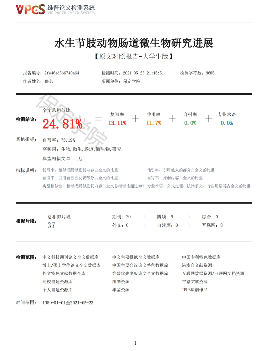 维普论文检测系统VIP PAPER CHECK SYSTEM水生节肢动物肠道微生物研究进展【原文对照报告-大学生版】报告编号:2fe46ed5b6740a64检测时间:2021-05-2321:15:51检测字符数:9685作者姓名:佚名所属单位:保定学院全文总相似比复写率他引率自引率专业术语检测结论:24.81%13.11%11.7%0.0%0.0%其他指标:自写率:75.19%高频词:生物,微生,肠道,微生物,研究典型相似文章:无指标说明:复写率:相似或疑似重复内容占全文的比重他引率:引用他人的部分占全文的比重自引率:引用自己已发表部分占全文的比重自写率:原创内容占全文的比重典型相似性:相似或疑似重复内容占全文总相似比超过30%专业术语:公式定理、法律条文、行业用语等占全文的比重总相似片段期刊:20博硕:9综合:0相似片段:37外文:0自建库:0互联网:8检测范围:中文科技期刊论文全文数据库中文主要报纸全文数据库中国专利特色数据库博士/硕士学位论文全文数据库中国主要会议论文特色数据库港澳台文献资源外文特色文献数据全库维普优先出版论文全文数据库互联网数据资源/互联网文档资源高校自建资源库图书资源古籍文献资源个人自建资源库年鉴资源IPUB原创作品时间范围:1989-01-01至2021-05-23VPCS维普论文检测系统VIP PAPER CHECK SYSTEM原文对照颜色标注说明:■自写片段■复写片段(相似或疑似重复)引用片段(引用)■专业术语(公式定理、法律条文、行业用语等)保定学院定学本科毕业论文(设计题目:水生节肢动物肠道微生物研究进展姓名赵景瑶学号1707034139院系生物化工与环境工程学院专业生物科学指导教师张保石2021年月日学位论文原创性声明本人所提交的学位论文“水生节肢动物肠道微生物研究进展”,是在导师的指导下,独立进行研究工作所取得的原创性成果。除文中已经注明引用的内容外,本论文不包含任何其他个人或集体已经发表或撰写过的研究成果。对本文的研究做出重要贡献的个人和集体,均已在文中标明。本声明的法律后果由本人承担。论文作者(签名):指导教师确认(签名):年月日年月日学位论文版权使用授权书本学位论文作者完全了解保定学院有权保留并向国家有关部门或机构送交学位论文的复印件和磁盘,允许论文被查阅和借阅。本人授权保定学院可以将学位论文的全部或部分内容编入有关数据库进行检索,可以采用影印、缩印或其它复制手段保存、汇编学位论文。保密的学位论文在年解密后适用本授权书。论文作者(签名):指导教师(签名):年月日年月摘要本文在简要回顾了肠道微生物与其宿主关系的基础上,重点介绍了水生节肢动物肠道微生物的类群、菌群功能及相关的研究方法等方面展示水生节肢动物微生物的最新研究进展。拓展了益生菌对水生节肢动物的作用及其自身免疫力在抵抗微生物肠道疾病的重要性为开展经济性的水产水生动物的健康生态养殖和有效防控肠道疾病发生提供科学依据。关键词:肠道微生物:有益菌:自身免疫力AbstractBased on a brief review of the relationship between intestinal microorganisms and their hosts,2维普论文检测系统VIP PAPER CHECK SYSTEMthis paper mainly introduces the latest research progress of aquatic arthropod microorganisms interms of the taxa,microbial function and related research methods.This study expanded the role ofprobiotics in aquatic arthropods and the importance of their own immunity in resisting microbialintestinal diseases,which provided a scientific basis for carrying out economic healthy ecologicalaquaculture of aquatic animals and effectively preventing and controlling intestinal diseases.Key words:intestinal microorganism;beneficial bacteria;auto-imunidade目录1引言12肠道微生物类群及体系22.1肠道微生物的主要类群22.2肠道微生物体系的建立23微生物菌群的功能33.1营养功能33.2辅助消化功能33.3自身免疫功能43.4屏障功能44微生物菌群的研究方法54.1传统分类鉴定方法54.2分子生物学方法5学院4.3数据统计与分析方法55结论与展望6参考文献7致谢9第1章引言据统计得知,节肢动物是目前可以得知的物种中最多的一门,通称之为节肢动物,其中含有人们都知晓的龙虾、螃蟹等。地球上有大概生活着120万种节肢动物,占整个世界现存类动物群系种数的80%。节肢亚目水生动物可以生活的自然环境非常广泛,大多数环境下都能发现它们的生存迹象,还发现有些物种可寄生在动物的体内外[1]。水生节肢动物的研究在生活中极为普遍,随着微生物个体鉴定检测技术和水生动物个体培养控制方法的科学研究不断发展,水生节肢亚目动物和肠道微生物的培养研究也已经进入了一个新的发展时期。在特定的动物菌群和肠道微生物菌群中生活着非常多的肠道微生物,经过一定的生物演变,肠道菌群微生物与宿主之间逐渐形成一个稳定的平衡生态体系,与动物宿主之间相互依赖、相互约束[2]。在漫长的生物进化过程中,肠道微生物生态平衡系统逐渐形成。肠道疾病菌群检测可直接参与观察宿主的营养、发病和自身免疫等正常生理代谢过程,其主要组成成分结构与宿主自身机体的正常生理及健康状况有着密切的相互联系。肠道中的微生物与不同宿主的相互关系因具有特定科学价值而一直备受各界关注,不同宿主肠道中的微生物具体结构和功能组成直接影响着不同宿主多种重要的生理化学活动,例如其主要营养和矿物质消化、加工、能量平衡、免疫系统功能和正常生长发育等[3]。近年来,包括贝类在内的关于有