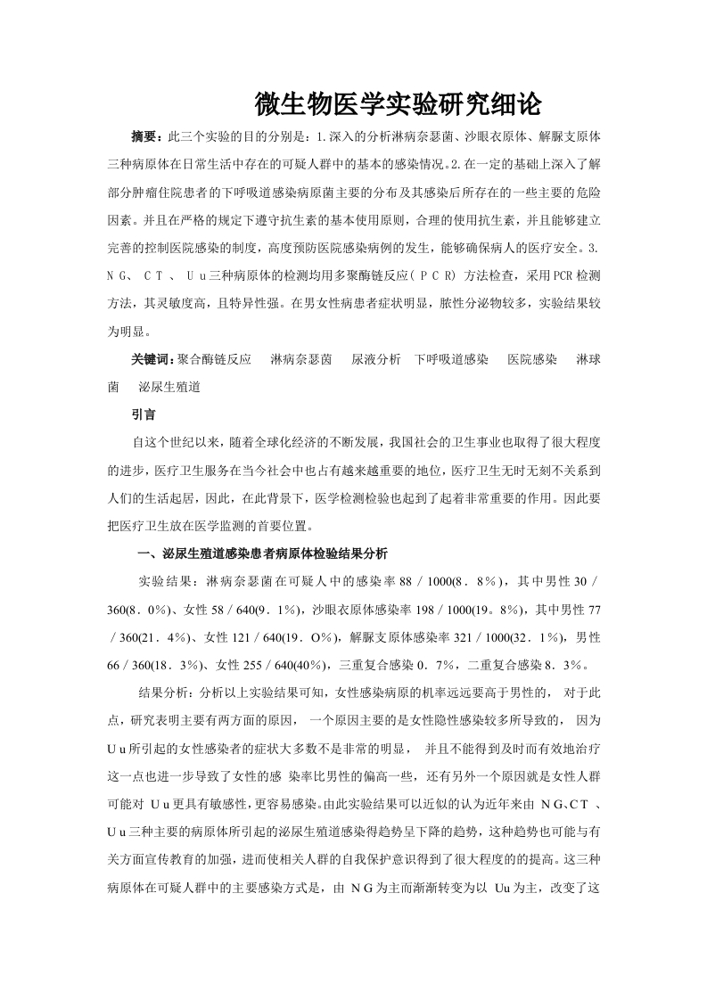 微生物医学实验研究细论摘要:此三个实验的目的分别是:1.深入的分析淋病奈瑟菌、沙眼衣原体、解脲支原体三种病原体在日常生活中存在的可疑人群中的基本的感染情况。2.在一定的基础上深入了解部分肿瘤住院患者的下呼吸道感染病原菌主要的分布及其感染后所存在的一些主要的危险因素。并且在严格的规定下遵守抗生素的基本使用原则,合理的使用抗生素,并且能够建立完善的控制医院感染的制度,高度预防医院感染病例的发生,能够确保病人的医疗安全。3.NG、CT、Uu三种病原体的检测均用多聚酶链反应(PCR)方法检查,采用PCR检测方法,其灵敏度高,且特异性强。在男女性病患者症状明显,脓性分泌物较多,实验结果较为明显。关键词:聚合酶链反应淋病奈瑟茵尿液分析下呼吸道感染医院感染淋球泌尿生殖道引言自这个世纪以来,随着全球化经济的不断发展,我国社会的卫生事业也取得了很大程度的进步,医疗卫生服务在当今社会中也占有越来越重要的地位,医疗卫生无时无刻不关系到人们的生活起居,因此,在此背景下,医学检测检验也起到了起着非常重要的作用。因此要把医疗卫生放在医学监测的首要位置。一、泌尿生殖道感染患者病原体检验结果分析实验结果:淋病奈瑟菌在可疑人中的感染率88/1000(8,8%),其中男性30/360(8.0%)、女性58/640(9.1%),沙眼衣原体感染率198/1000(19.8%),其中男性77/360(21.4%)、女性121/640(19.0%),解脲支原体感染率321/1000(32.1%),男性66/360(18.3%)、女性255/640(40%),三重复合感染0.7%,二重复合感染8.3%。结果分析:分析以上实验结果可知,女性感染病原的机率远远要高于男性的,对于此点,研究表明主要有两方面的原因,一个原因主要的是女性隐性感染较多所导致的,因为U山所引起的女性感染者的症状大多数不是非常的明显,并且不能得到及时而有效地治疗这一点也进一步导致了女性的感染率比男性的偏高一些,还有另外一个原因就是女性人群可能对U山更具有敏感性,更容易感染。由此实验结果可以近似的认为近年来由NG、CT、U山三种主要的病原体所引起的泌尿生殖道感染得趋势呈下降的趋势,这种趋势也可能与有关方面宣传教育的加强,进而使相关人群的自我保护意识得到了很大程度的的提高。这三种病原体在可疑人群中的主要感染方式是,由NG为主而渐渐转变为以Uu为主,改变了这种感染率。对于三种病原体的感染程度及感染率女性明显高于男性(尤其是U山),这一点必须要引起相关部门的临床医生的高度重视,由于U山的感染症状较轻,并且大多数是隐性感染,所以比较难发现。更重要的是U山又是引起男、女不孕不育的主要病原菌之一,所以必须引起足够程度的重视。其检测结果也存在着一部分的偏差,例如被检总量上的多少、所用检验方法的不同以及使用不同设备、试剂等客观因素,也会造成一定的偏差。因此认为还可能还与各地区人员流动情况、卫生宣教力度、高危人群自我保护意识的提高以及各地民俗民情等诸多社会因素有关进一步探讨。二、对96例病例下呼吸道医院感染患者病原菌的实验结果分析实验结果:呼吸道感染的病原菌种类以革兰阴性菌为主,其中肺炎克雷伯最多,其次是大肠埃希菌和铜绿假单胞菌,分别占13.2%和7.02%,革兰阴性球菌卡他布兰汉菌感染增多,占9.65%。真菌感染呈明显上升趋势,占28·9%。耐药性方面,细菌对抗生素的耐药率有增高趋势,尤其是对头孢类抗生素。结果分析:革兰阴性杆菌对先锋必/舒巴坦、菌必治较敏感:革兰阳性球菌敏感的主要原因是存在万古霉素。次试验结果主要是因为革兰阳性菌对万古霉素的耐药性相对比较稳定,然而,在实验过程中,万古霉素消耗量却增加了10倍,由此可以得到实验结论细菌的耐药性越来越高,根据这一结论,临床应根据药敏试验结果选择抗生素。但要注意的是,一般引起医院感染的危险因素总是有很多,而本次研究发现住院时间长,放、化疗治疗造成免疫力低下是造成肿瘤患者医院感染发病率高的主要原因。因此,为了尽量避免这一问题的出现。有关部门一定要加强肿瘤患者的护理,并每天都要做好环境的消毒工作,尽最大的能力减少肿瘤患者的院内感染的几率,为肿瘤患者营造一个良好的康复环境。三、淋病奈瑟菌检验结果分析检验结果:实验结果呈阳性的为患病,对400人进行检测,总阳性率为58.70%,其中男性200例标本检测出养性154例,女性200例标本检测出81例阳性,很显然男性高于女性。结果分析:次检测结果男性明显高于女性,主要可能与男性感染林病奈瑟茵后,尿道口红肿且有痒感,且在排尿的过程中有黄色脓性分泌物排出,在就医的过程中不易被误诊。而大多数女性被感染后,以为是自身的内分泌失调引起的白带异常分泌,不会有太多的注意。还有值得引起注意的是,在检测的人群中呈阳性的患者中绝大多数都会存在不卫生的性行为,这一点也可以说明,此类病也有可能是通过性传播。还有一些被污染过的物品传播等。淋病奈瑟茵患病率也存在着上升的趋势,这一现象也可能与淋病奈瑟茵的反抗药性逐渐增强有一定的关系。四、生活中需要注意整体护理的根本就是人性化护理,对患者要体现人文化、仁爱化、人情化、人性化的关心,护理人员要做到以病人为中心,将上班时间的大部分投入到病房中去,要与患者多进行沟通,要成为患者的“活病历”,做到共识所需。因为在治疗期间每位