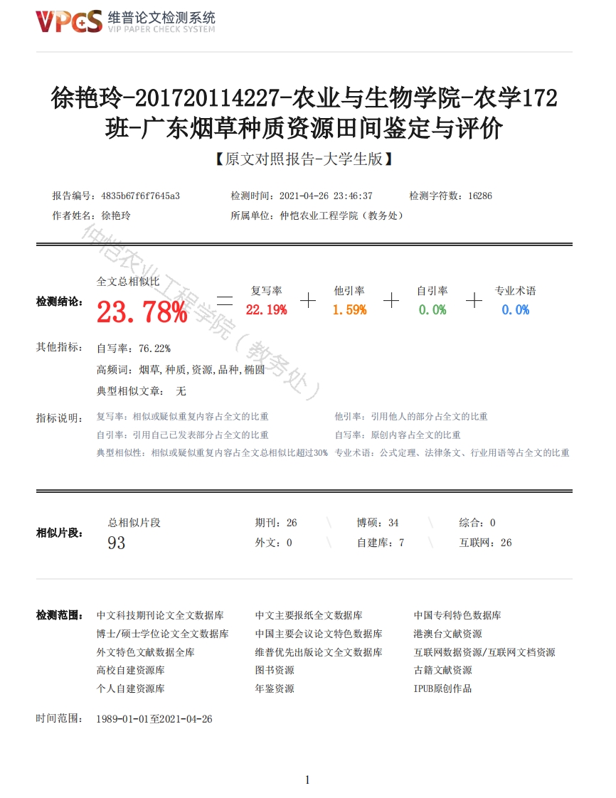 维普论文检测系统VIP PAPER CHECK SYSTEM徐艳玲-201720114227-农业与生物学院-农学172班-广东烟草种质资源田间鉴定与评价【原文对照报告-大学生版】报告编号:4835b67f6f7645a3检测时间:2021-04-2623:46:37检测字符数:16286作者姓名:徐艳玲所属单位:仲恺农业工程学院(教务处)全文总相似比复写率他引率自引率专业术语检测结论:23.78%22.19%1.59%0.0%0.0%其他指标:自写率:76.22%典型相似文章:无指标说明:复写率:相似或疑似重复内容占全文的比重他引率:引用他人的部分占全文的比重自引率:引用自己已发表部分占全文的比重自写率:原创内容占全文的比重典型相似性:相似或疑似重复内容占全文总相似比超过30%专业术语:公式定理、法律条文、行业用语等占全文的比重总相似片段期刊:26博硕:34综合:0相似片段:93外文:0自建库:7互联网:26检测范围:中文科技期刊论文全文数据库中文主要报纸全文数据库中国专利特色数据库博士/硕士学位论文全文数据库中国主要会议论文特色数据库港澳台文献资源外文特色文献数据全库维普优先出版论文全文数据库互联网数据资源/互联网文档资源高校自建资源库图书资源古籍文献资源个人自建资源库年鉴资源IPUB原创作品时间范围:1989-01-01至2021-04-26维普论文检测系统VIP PAPER CHECK SYSTEM原文对照颜色标注说明:■自写片段■复写片段(相似或疑似重复)口引用片段(引用)■专业术语(公式定理、法律条文、行业用语等)仲恺农业工程学院毕业论文姓名徐艳玲院(系)农业与生物学院专业班级农学172班学号201720114227指导教师刘鹏飞马柱文(校外)职称副教授高级农艺师论文答辩日期2021年月日仲恺农业工程学院教务处制Field Identification and Evaluation of main morphological characteristics of Tobacco GermplasmResources in Guangdong ProvinceXu YanlingCollege of Agriculture and BiologyZhongkai University of Agriculture and EngineeringGuangzhou,ChinaSupervisor:Associate professor Liu PengfeiSenior Agronomist Ma Zhuwen(Extramural tutor)学生承诺书本人郑重承诺:所呈交的毕业论文是本人在导师的指导下独立进行研究所取得的成果。除了文中已用特别标志加以标记的引述内容之外,本论文不含有任何其他个人或集体已经发表或撰写的研究成果。对本文研究做出过重要贡献的个人或集体,均已在文中已明确的方式标明。若在毕业论文的各项检查评比中被发现有抄袭,剽窃或其他的违规行为,本人愿按学校有关规定接受处理,并承担相应的法律责任。学生(签名):年月日摘要【目的】种质资源是经过长期自然演化和人工创造而形成的一种重要的自然资源,在漫长的生物进化过程中,种质资源不断得到充实和发展,积累了由自然选择和人工选择所引起的极其丰富的遗传变异,蕴藏着控制各种性状2维普论文检测系统VIP PAPER CHECK SYSTEM的基因,形成了各种优良的遗传性状及生物类型。【方法】以30份烟草种质作为试验材料,进行田间鉴定评价,每份种质选择5株具有代表性的烟株进行主要的农艺性状以及形态特征调查,并计算均值、极差、标准误及变异系数等,对数据进行分析比较。【结果】从形态特征上看,叶片主要为绿色和椭圆形,叶面较皱,叶尖为急尖,株型为塔型,叶片厚薄程度大多为中等,以主脉细为主,叶耳以小叶耳为主,叶缘大多是微波。在主要农艺性状方面具有丰富的遗传多样性,主要农艺性状CV在6.5%-24.0%之间,茎叶夹角的变异系数最大,为22.1%,变异系数最小的是花冠长度。【结论】种质间遗传多样性丰富。本研究认为CV099、ETWM10、Mcnaiy133、N15A、NC347、NC729、RG-8、RG12、RG-22、Ti442A(青枯病重要抗源)这十个种质表现优良,有一定利用潜力,育种者可根据需要选择相应的种质进行利用。关键词:种质资源农艺性状形态特征田间鉴定Abstract[objective Germplasm resources are a kind of important natural resources formed by long-termnatural evolution and artificial creation.in the long process of biological evolution,germplasmresources have been continuously enriched and developed.It has accumulated extremely rich geneticvariation caused by natural selection and artificial selection,contains genes that control varioustraits,and forms a variety of excellent genetic traits and biological types.[methods 30 tobaccogermplasms were used as experimental materials to identify and evaluate in the field.5representative tobacco plants were selected for the investigation of main agronomic andmorphological characteristics in each germplasm,and the mean value,range,standard error andcoefficient of variation were calculated,and the data were analyzed and compared.[results]Interms of morphological characteristics,the leaves were mainly green and oval,the leaf surface waswrinkled,the leaf tip was sharp,the plant type was tower type,the thickness of the leaf wasmedium,the main vein was thin,the auricle was mainly small auricle,and the leaf edge was mostlymicrowave.There is rich genetic diversity in the main agronomic characters,the CV of the mainagronomic characters is between 6.5%and 24.0%,the coefficient of variation of the angle betweenstems and leaves is 22.1%,and the lowest coefficient of variation is the Corolla length.[conclusion]There is rich genetic diversity among germplasm.In this study,it is concluded thatCV099,ETWM10,Mcnaiy 133,N15A,NC347,NC729,RG-8,RG12,RG-22 and Ti442A (important sources ofresistance to bacterial wilt)have good performance and have a certain potential for utilization.Breeders can select the corresponding germplasm according to their needs.Keywords:germplasm resources;agronomic characters;morphological characteristics;fieldidentification目录1前言