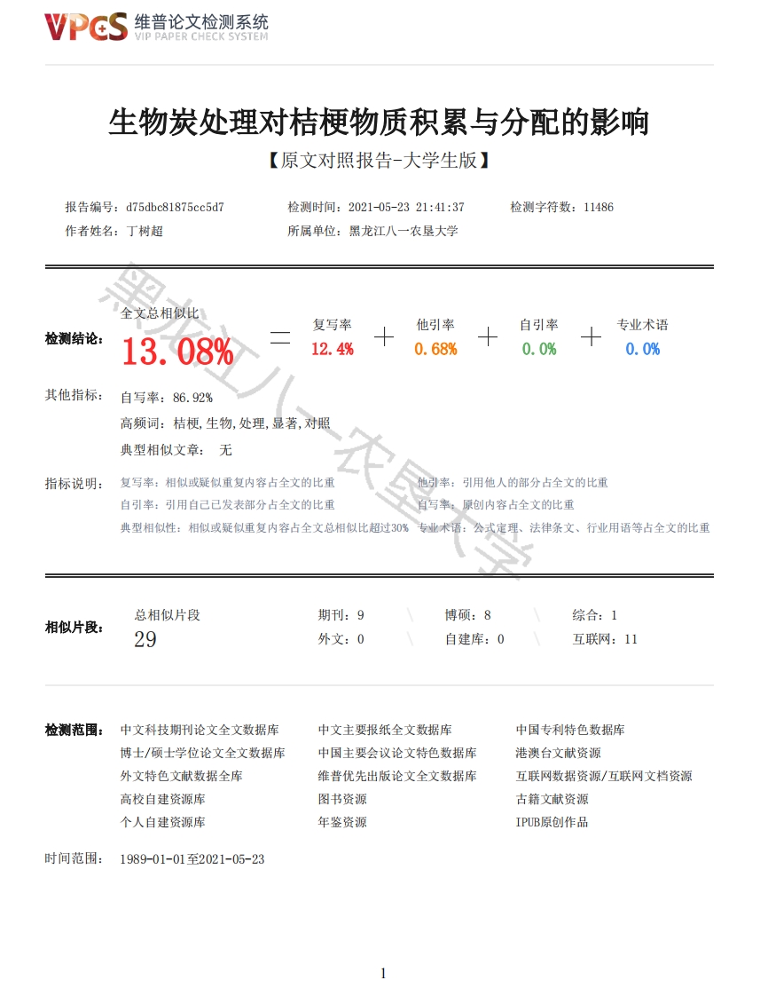 维普论文检测系统/IP PAPER CHECK SYSTEM生物炭处理对桔梗物质积累与分配的影响【原文对照报告-大学生版】报告编号:d75dbc81875cc5d7检测时间:2021-05-2321:41:37检测字符数:11486作者姓名:丁树超所属单位:黑龙江八一农垦大学全文总相似比复写率他引率自引率专业术语检测结论:13.08%12.4%0.68%0.0%0.0%其他指标:自写率:86.92%高频词:桔梗,生物,处理,显著,对照典型相似文章:无指标说明:复写率:相似或疑似重复内容占全文的比重引用他人的部分占全文的比重自引率:引用自己已发表部分占全文的比重自写率:原创内容占全文的比重典型相似性:相似或疑似重复内容占全文总相似比超过30%专业术语:公式定理、法律条文、行业用语等占全文的比重总相似片段期刊:9博硕:8综合:1相似片段:29外文:0自建库:0互联网:11检测范围:中文科技期刊论文全文数据库中文主要报纸全文数据库中国专利特色数据库博士/硕士学位论文全文数据库中国主要会议论文特色数据库港澳台文献资源外文特色文献数据全库维普优先出版论文全文数据库互联网数据资源/互联网文档资源高校自建资源库图书资源古籍文献资源个人自建资源库年鉴资源IPUB原创作品时间范围:1989-01-01至2021-05-23维普论文检测系统VIP PAPER CHECK SYSTEM原文对照颜色标注说明:■自写片段■复写片段(相似或疑似重复)口引用片段(引用)■专业术语(公式定理、法律条文、行业用语等)摘要桔梗(Platycodon grandiflorus)是我国传统的中药材和常见观赏花卉的同时也是东北地区重要的食材,甚至出口到韩国作外汇创收,具有较高的经济价值。但是因为经年的精耕细作和农药化肥的滥用,导致土壤肥力严重下降,从而导致桔梗的产量降低。生物炭是在缺氧条件下生物残体经过高温慢热解产生的一类稳定的、难熔的、富含碳素的、具有高度芳香化的固态物质。士壤经过生物炭处理后能显著的提升土壤肥力。本论文研究了用生物炭处理土壤后对一年生桔梗生长与干物质积累的影响。结果表明,运用生物炭处理栽培土壤后对于一年生桔梗的生长具有明显的促进效果。能显著的提高一年生桔梗的干物质积累量。从而提高桔梗的品质和产量,对桔梗的高产稳产提供了保障,对当地的农业经济发展,农民脱贫致富有着积极的意义。AbstractPlatycodon grandiflorum is not only a traditional Chinese medicinal material and commonornamental flowers in China,but also an important food material in Northeast China,and evenexported to Korea for foreign exchange income,which has high economic value.However,due to yearsof intensive farming and the abuse of pesticides and fertilizers,the soil fertility decreasedseriously,which led to the decrease of the yield of Platycodon grandiflorum.Biochar is a kind ofstable,refractory,carbon-rich and highly aromatic solid material produced by slow pyrolysis ofbiological residues under anoxic conditions.Biochar can significantly increase soil pH,change soiltexture and increase salt base exchange capacity,thus increasing soil CEC (anion and cationic ionexchange capacity)and promoting plant ion absorption.In this paper,the effects of biochartreatment on the growth and dry matter accumulation of Platycodon grandiflorum were studied.Theresults showed that biochar treatment had obvious effect on the growth of annual Platycodongrandiflorum.Among them,the application rate of 20 kg/667 was the best,which could effectivelyincrease the chlorophyll content of annual Platycodon grandiflorum and significantly increase thedry matter accumulation of annual Platycodon grandiflorum.So as to improve the quality and yield ofPlatycodon grandiflorum,provide a guarantee for the high and stable yield of Platycodongrandiflorum,and have a positive significance for the development of local agricultural economy andfarmers to get rid of poverty and become rich.Key words:Platycodon grandiflorum;biochar:substance accumulation;substance distribution前言桔梗(Platycodon grandiflorus)别名铃铛花、明叶菜、僧帽花。前些年热播的韩剧《大长今》片头曲《桔梗谣》便是歌颂的这种可爱的植物。桔梗是桔梗科桔梗属的多年生草本植物,高度在二十到一百二十厘米之间,其表面无被毛,也几乎没有分枝,只在最上部有一点分支。叶序为互生或轮生,叶柄极短,有的品种叶柄甚至退化消失,叶形一般为卵形。花顶生,花序为总状花序排列,颜色多为白色、紫色、或蓝色。于每年的七到九月份开花,2维普论文检测系统VIP PAPER CHECK SYSTEM之后结出蒴果呈球状或者圆锥形,长一到两厘米直径约一厘米。桔梗喜凉爽,喜阳光,可抵御东北冬季严寒的气候。可栽培在海拔一千一百米以下的地区,于富含磷钾肥的夹砂土生长较好,在我国东北地区有着大规模的种植。桔梗可直播也可育苗移栽,但更推荐采用育苗移栽的方式进行种植。一年生桔梗在栽培过程中育苗移栽的主要优势体现在幼苗茎秆粗壮,后期长势较好幼苗期对不利环境的抵抗能力更强可有效的提高一年生桔梗的存活率。并且直播的方式对土地的抵用率低下,出苗不齐等情况并不利于田间管理。现阶段我国生物炭处理栽培土壤的技术已经相对成熟。生物炭是在缺氧条件下生物残体经过高温慢热解产生的一类稳定的、难熔的、富含碳素的、具有高度芳香化的固态物质。常见的生物炭有玉米秸秆炭,花生壳炭,玉米芯炭等。生物炭具有独特的稳定性可以将二氧化碳捕捉并且封存于地下几千年不会改变,达到很好的碳封存效果,对延缓温室效应有着积极的作用。生物炭在农业上的应用最为广泛,在农业上的