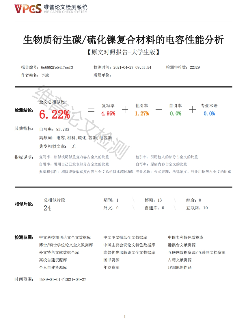维普论文检测系统/IP PAPER CHECK SYSTEM生物质衍生碳/硫化镍复合材料的电容性能分析【原文对照报告-大学生版】报告编号:6c6882fe5417ccf3检测时间:2021-04-2709:51:54检测字符数:22329作者姓名:李旗所属单位:全文总相似比复写率他引率自引率专业术语检测结论:6.22%4.95%1.27%0.0%0.0%其他指标:自写率:93.78%高频词:电容,材料,硫化,容器,电容器典型相似文章:无指标说明:复写率:相似或疑似重复内容占全文的比重他引率:引用他人的部分占全文的比重自引率:引用自己已发表部分占全文的比重自写率:原创内容占全文的比重典型相似性:相似或疑似重复内容占全文总相似比超过30%专业术语:公式定理、法律条文、行业用语等占全文的比重总相似片段期刊:1博硕:13综合:0相似片段:24外文:0自建库:0互联网:10检测范围:中文科技期刊论文全文数据库中文主要报纸全文数据库中国专利特色数据库博士/硕士学位论文全文数据库中国主要会议论文特色数据库港澳台文献资源外文特色文献数据全库维普优先出版论文全文数据库互联网数据资源/互联网文档资源高校自建资源库图书资源古籍文献资源个人自建资源库年鉴资源IPUB原创作品时间范围:1989-01-01至2021-04-27维普论文检测系统VIP PAPER CHECK SYSTEM原文对照颜色标注说明:■自写片段■复写片段(相似或疑似重复)引用片段(引用)■专业术语(公式定理、法律条文、行业用语等)山西大学毕业设计题目生物质衍生碳/硫化镍复合材料的电容性能研究学院电力与建筑学院专业新能源科学与工程班级新能源1701班检测姓名李旗指导教师郭聪秀下达日期2020年1月7日设计时间自2021年3月1日至2021年4月29日目录摘要IAbstractI第一章绪论11.1选题的背景与意义11.2超级电容器简介21.2.1双电层电容器41.2.2法拉第赝电容器51.3超级电容器的电极材料61.3.1碳材料61.3.2导电聚合物71.3.3金属氧化物71.3.4金属硫化物71.3.5生物衍生谈/硫化镍复合材料91.4本论文主要研究内容10第二章实验材料与研究方法122.1实验试剂与材料122.2实验仪器122.3实验流程132.3.1实验流程132.3.2电化学性能测试142维普论文检测系统VIP PAPER CHECK SYSTEM2.4本章小结17第三章结果与讨论183.1简介183.2数据分析183.2.1硫化镍与氧化镍CV图数据分析183.2.2硫化镍与氧化镍恒流充放电(GCD)曲线图数据分析203.2.3硫化镍循环稳定性分析223.2.4计算硫化镍在不同电流密度下的电容233.3本章小结24第四章结论与展望254.1总结254.2展望25参考文献26致谢29生物质衍生碳/硫化镍复合材料的电容性能研究李旗专业:新能源科学与工程指导教师:郭聪秀摘要:当今世界能源缺乏、土地污染严重,“绿水青山才是金山银山”的理念得到许多人的认可,新型绿色环保的储能装置成为解决这种现状的途径之一。循环电池和旧式电容器存在缺陷,为此设计出了一种新的储能装置,它是一种结合老式电容器和普通电池的工作原理提出的超级电容器,具有超高的功率密度、充电和放电时间短等优点,不过能量密度低、制作材料存在缺陷成为阻止超级电容器飞速发展的重要因素。最近一段时期,科学家们努力的方向是超级电容器的组成部件电极材料和电解质。在众多电极材料中拥有多种化学计量数之比的过渡金属硫化物,由于其来源广泛、成本低,成为超级电容器的理想电极材料。但硫化物导电性能差(与碳材料或金属材料相比)以及循环稳定性差等特点需要被改善,所以通过改变NSx表面结构或者将其与导电性好的材料合成复合材料等方法来改善其缺点。本文以生物质为前躯体制备出硫化镍/多孔炭复合材料。通过电化学工作站来评价硫化镍复合材料的电化学性能,实验表明复合材料具有导电性能好、储存能量多和循环利用率高的特点。本文主要简述了超级电容器的工作机制,描述了其电极材料的分类、研究方法等方面的内容:详细介绍了硫化镍材料的优缺点、制备方法、实验所用到的试剂仪器设备及对硫化镍材料的电容性能测试、分析以及展望。关键词:生物质衍生碳:电极材料:氧化镍:电化学工作站Capacitive properties of biomass derived carbon Nickel Sulfide CompositesAbstract:Abstract:Nowadays,the concept of "green water and green mountain is Jinshan Yinshan"has been recognized by many people.The new green and environmental energy storage device has becomeone of the ways to solve this situation.The circulating battery and the old capacitor have defects.Therefore,a new energy storage device is designed.It is a super capacitor which combines theworking principle of the old-fashioned capacitor and the ordinary battery.It has the advantages ofsuper high power density,short charging and discharge time.However,the low energy density and thedefects in the material have become the important factors to prevent the rapid development of thesuper capacitor.In recent years,scientists have been working on electrode materials andelectrolytes,components of supercapacitors.Among the many electrode materials,transition metalsulfide with the ratio of stoichiometric number has become an ideal electrode material for supercapacitor because of its wide source and low cost.However,the characteristics of sulfide poorconductivity (compared with carbon or metal materials)and poor cyclic stability need to beimproved.So the disadvantages of sulfide are improved by changing the surface structure of NiSx orsynthesizing composite materials with materials with good conductivity.In this paper,nickel sulfide porous carbon composites were prepared from biomass.Theelectrochemical performance of nickel sulfide composi