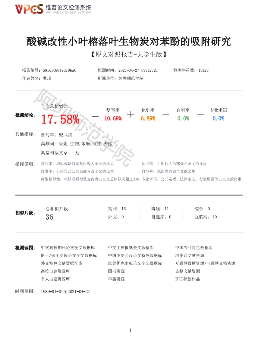 维普论文检测系统/IP PAPER CHECK SYSTEM酸碱改性小叶榕落叶生物炭对苯酚的吸附研究【原文对照报告-大学生版】报告编号:b91cf08047d19ba6检测时间:2021-04-2709:12:21检测字符数:10128作者姓名:曹琪所属单位:阿坝师范学院全文总相似比复写率他引率自引率专业术语检测结论:17.58%10.69%6.89%0.0%0.0%其他指标:自写率:82.42%高频词:吸附,生物,苯酚,改性,去除典型相似文章:无指标说明:复写率:相似或疑似重复内容占全文的比重他引率:引用他人的部分占全文的比重自引率:引用自己已发表部分占全文的比重自写率:原创内容占全文的比重典型相似性:相似或疑似重复内容占全文总相似比超过30%专业术语:公式定理、法律条文、行业用语等占全文的比重总相似片段期刊:15博硕:11综合:0相似片段:36外文:0自建库:0互联网:10检测范围:中文科技期刊论文全文数据库中文主要报纸全文数据库中国专利特色数据库博士/硕士学位论文全文数据库中国主要会议论文特色数据库港澳台文献资源外文特色文献数据全库维普优先出版论文全文数据库互联网数据资源/互联网文档资源高校自建资源库图书资源古籍文献资源个人自建资源库年鉴资源IPUB原创作品时间范围:1989-01-01至2021-04-27维普论文检测系统VIP PAPER CHECK SYSTEM原文对照颜色标注说明:■自写片段■复写片段(相似或疑似重复)口引用片段(引用)■专业术语(公式定理、法律条文、行业用语等)A BA TEACHERS UNIVERSITY本科毕业论文(设计)题目酸碱改性小叶榕落叶生物炭对苯酚的吸附研究二级学院资源与环境学院专业年级化学(本)2017-01班学生姓名曹琪学号20177462指导教师何红艳职称助教完成时间:2021年月日阿坝师范学院本科毕业论文原创性声明本人郑重声明:所呈交的毕业论文,是本人在指导教师的的指导下,独立进行研究工作所取得的成果。除文中已经注明引用的内容外,本论文不含任何其他个人或集体已经发表或撰写过的作品或成果。对本文的研究做出重要贡献的个人和集体,均已在文中以明确方式标明。本人完全意识到本声明的法律结果由本人承担。毕业论文作者签名:日期:年月日关于论文使用授权的声明毕业论文作者完全了解阿坝师范学院有关保留和使用毕业论文的规定,即:本科生在校学习期间论文工作的知识产权单位属阿坝师范学院。学校有权保留并向国家有关部门或机构送交论文的复印件和电子版,允许毕业论文被查阅和借阅:学校可以公布论文的全部或部分内容,可以采用影印、缩印或其它复制手段保存、汇编毕业论文。保密的毕业论文在解密后遵守此规定。本人签名:日期:指导教师签名:日期:目录2维普论文检测系统VIP PAPER CHECK SYSTEM前言21材料与方法31.1材料、药品与仪器31.2实验方法31.2.1材料预处理31.2.2溶液的配制41.2.3标准曲线的绘制41.2.2改性方法41.2.4正交实验41.2.4吸附实验51.2.5pH对吸附的影响51.2.6吸附剂投加量对吸附的影响51.2.7吸附时间对吸附的影响62结果与分析62.1标准曲线62.2正交实验结果及分析62.3醋酸体积分数的影响72.4碳酸钠浓度的影响92.5改性时间的影响92.6pH对去除率的影响分析102.7吸附剂投加量对去除率的影响分析112.8吸附时间对去除率的影响分析123结论12参考文献13致谢14酸碱改性小叶榕落叶生物炭对苯酚的吸附研究化学曹琪何红艳助教摘要:以小叶榕落叶为原材料,在温度为450℃的条件下制备原始的小叶榕落叶生物炭,对其进行酸碱改性,设计L9(34)正交实验,探究改性的最佳条件。实验结果表明:在醋酸体积分数为30%,碳酸钠浓度1.5mo1九,水浴时间为2时,小叶榕落叶生物炭吸附苯酚的效果最佳。改变H、吸附剂投加量以及吸附时间,探究这三个条件对改性生物炭吸附苯酚的效果的影响。结果显示,在pH为3,吸附剂投加量为100mg,吸附时间为30mi时,改性生物炭的吸附效果最好,对苯酚的去除率可达96.69%。关键词:生物炭;酸碱改性:吸附Study on Adsorption of Phenol by Acid-base Modified Ficus benjamina Deciduous BiocharChemistry Cao QiTeaching Assistant He HongyanAbstract:With the deciduous leaves of Ficus benjamina as the raw material,the original Ficusbenjamina deciduous biochar was prepared at a temperature of 450 C,and the acid-base modificationwas carried out.The orthogonal experiment of L9 (34)was designed to explore the best conditionsfor modification.The experimental results show that:when the sodium carbonate concentration is 1.5mol/L,the acetic acid volume fraction is 30%,and the water bath time is 2 h,the phenol adsorptioneffect of Ficus benjamina deciduous biochar is the best.Change the pH,the dosage of adsorbent and3