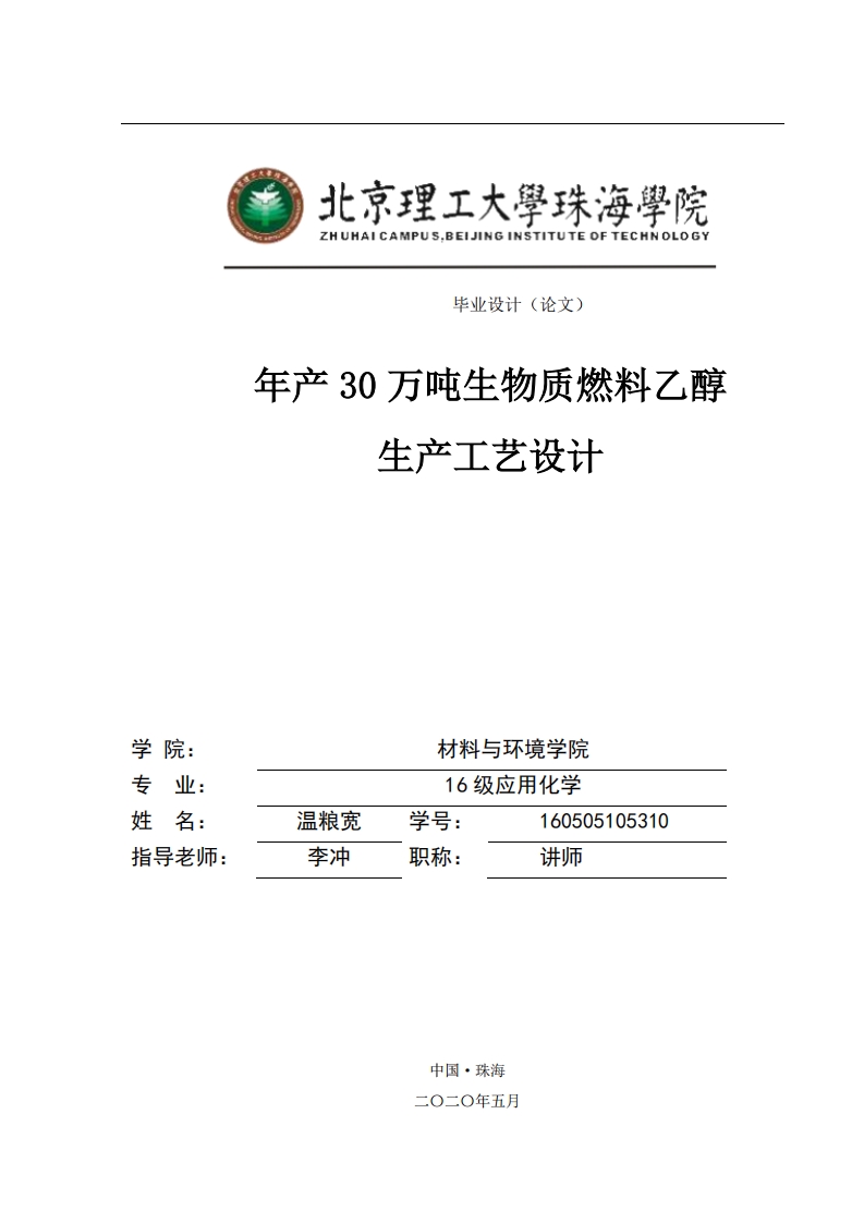 北京理工大學珠海學院ZHUHAICAMPUS.BEIJING INSTITUTE OF TECHNOLOGY毕业设计(论文)年产30万吨生物质燃料乙醇生产工艺设计学院:材料与环境学院专业:16级应用化学姓名:温粮宽学号:160505105310指导老师:李冲职称:讲师中国·珠海北京理工大学珠海学院2020届本科生毕业设计诚信承诺书本人郑重承诺:本人承诺呈交的毕业设计《年产30万吨生物质燃料乙醇生产工艺设计》是在指导教师的指导下,独立开展研究取得的成果,文中引用他人的观点和材料,均在文后按顺序列出其参考文献,设计使用的数据真实可靠。本人签名:日期:年月日北京理工大学珠海学院2020届本科生毕业设计年产30万吨生物质燃料乙醇生产工艺设计摘要我国纤维素生物质原料十分丰富,可满足大量的燃料乙醇原料生产需求。纤维乙醇的生产可以替代传统粮食作物生产的燃料乙醇,减少生产原料与人争粮的问题。本设计以生产纤维素燃料乙醇为目标,以纤维素生物质原料为生物质,利用高效率的预处理技术和高效的酶菌株,为纤维乙醇的生产提高经济效益。其中,高产乙醇微生物菌种的选育是发酵环节的重点。连续酶解生产纤维乙醇是本设计高端的清洁能源技术,水解糖化与乙醇发酵同时间进行(SSF),并且可以替代传统的粮食乙醇生产技术。同时,本设计实现了开发废弃物高值化和资源化利用,降低了生产成本和排放,也是设计的亮点之一。依据物质平衡和物料衡算的结果,进行基本设备选型,绘制工艺流程图和厂房布局图。关键词:燃料乙醇,纤维素乙醇生产,连续酶解,同步糖化发酵3