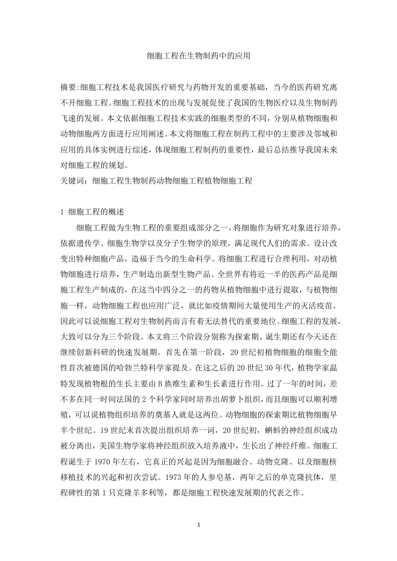 细胞工程在生物制药中的应用摘要:细胞工程技术是我国医疗研究与药物开发的重要基础,当今的医药研究离不开细胞工程。细胞工程技术的出现与发展促使了我国的生物医疗以及生物制药飞速的发展。本文依据细胞工程技术实践的细胞类型的不同,分别从植物细胞和动物细胞两方面进行应用阐述。本文将细胞工程在制药工程中的主要涉及邻域和应用的具体实例进行综述,体现细胞工程制药的重要性,最后总结推导我国未来对细胞工程的规划。关键词:细胞工程生物制药动物细胞工程植物细胞工程1细胞工程的概述细胞工程做为生物工程的重要组成部分之一,将细胞作为研究对象进行培养,依据遗传学、细胞生物学以及分子生物学的原理,满足现代人们的需求。设计改变出特种细胞产品,造福于当今的生命科学。将细胞工程进行合理利用,对动植物细胞进行培养,生产制造出新型生物产品。全世界有将近一半的医药产品是细胞工程生产制成的,在这当中四分之一的药物从植物细胞中进行提取,与植物细胞一样,动物细胞工程也应用广泛,就比如疫情期间大量使用生产的灭活疫苗。因此可以说细胞工程对生物制药而言有着无法替代的重要地位。细胞工程的发展,大致可以分为三个阶段。本文将三个阶段分别称为探索期、诞生期还有今天还在继续创新科研的快速发展期。首先在第一阶段,20世纪初植物细胞的细胞全能性首次被德国的哈勃兰特科学家提及。在这之后的20世纪30年代,植物学家温特发现植物根的生长主要由B族维生素和生长素进行作用。过了一年的时间,差不多在同一时间法国的2个科学家同时培养出胡萝卜组织,而且细胞可以顺利增殖,可以说植物组织培养的奠基人就是这两位。动物细胞的探索期比植物细胞早半个世纪。19世纪末首次提出组织培养一词,20世纪初,蝌蚪的神经组织成功被分离出,美国生物学家将神经组织放入培养液中,生长出了神经纤维。细胞工程诞生于1970年左右,它真正的兴起是因为细胞融合、动物克隆、以及细胞核移植技术的兴起和初次尝试。1973年的人参皂基,两年之后的单克隆抗体,里程碑性的第1只克隆羊多利等,都是细胞工程快速发展期的代表之作。y2植物细胞工程生物制药2.1主要涉及领域2.1.1植物细胞培养植物细胞培养技术是根据20世纪德国哈巴兰特提出的细胞全能性,将植物的离体组织进行离体培养,通过分离、培养、再生实现植物的大规模繁殖并且培养出无病毒植株。细胞培养技术使得植株仅需很小的面积就可以在无菌条件下快速生长,非常方便人为控制,并且不受气候季节影响。有人统计过,利用植物细胞培养繁殖出的植物与从培养中分离出的次级代谢产物,加起来多达1000多种,甚至有些药物的有利药物代谢物比原有植物含量更高,例如典型的公认抗癌药物紫杉醇,就是从豆杉细胞中培养出的。对于烧伤痔疮有奇效的紫草宁,是从紫草细胞中提取分离而来。植物细胞培养技术能够造福于植物自身代谢产物的大规模生产。2.2应用实例2.2.1人参根细胞中生产人参皂苷人参为五加科人参,属于珍贵的草本植物,它的根可以作为药,是中外闻名的名贵药材,被称为药中之王。科学家们研究发现人参中的有效成分为人参皂苷,人参多糖等,可以延缓衰老,补元气,护脾护肝。但由于人参生长周期长,人参皂苷含量仅占人参根干重量的二十分之一,植物细胞工程人参组织培养就显的十分重要。而且细胞工程不仅可以节约土地资源,而且还能够保护生态环境,减少破坏。近年来我国主要用细胞液体悬浮对人参组织培养。首先将人参根置于培养基上,生长出适宜悬浮培养的材料,得到生长蓬勃,颜色淡,质地蓬松的组织,然后继续培养。根据研究表明最佳的培养周期为1个月,加入相同浓度的氨态氮源和硝态氮源,磷酸盐以每毫升170mg进行调配对于培养而言是最佳的。在细胞的生长初期给予少量的糖生长后期适当添加糖,合理控制pH,添加必须的生长素和激动素。作为我们的邻国,韩日两国已经实现了产业化,但是我国人参组织培养的技术还有待改善和进一步的研究,存在诸多的问题,无法大规模的进行生产应用,期待该项技术争取早日为社会和经济发展作出贡献。2.2.2紫草细胞培养紫草又称紫丹,是紫草科紫草属植物,属于多年生草木植物。紫草的根部有一种叫紫草素的物质,可以活血抗炎,清热解毒,治疗烫伤疮疡,同时也是一种高级色素。紫草深受市场欢迎,但是由于紫草大部分属于野生植物,产量稀少,资源严重缺乏,并且一些无良厂家或者个人大规模的肆意采挖,严重导致紫草资源匮乏。紫草的人工培植和化学合成工艺均不能满足需求,存活率不高,并且生产成本高昂。随着细胞工程的诞生,科学家就想到了将植物组织培养技术运用于生产紫草,成功解决这个疑难问题。1974年塔巴塔开创了用细胞工程培养紫草细胞的先河,不到10年的时间他通过悬浮培养获取到紫草素衍生物。紫草细胞的培养包含3种方法,分别为细胞悬浮培养,固定化培养还有双液相培养。研究最全面的是细胞悬浮培养。细胞悬浮培养分为两部分,第1部分对细胞进行培养,第2步进行色素合成。在细胞生长期间目的产物形成,转入培养基的15至25天内合成最明显。近年来固定化培养方法也在进一步研究,固定化培养法是把B5培养基作为基础的培养基,以此减缓细胞生长速度,从而增加紫草色素