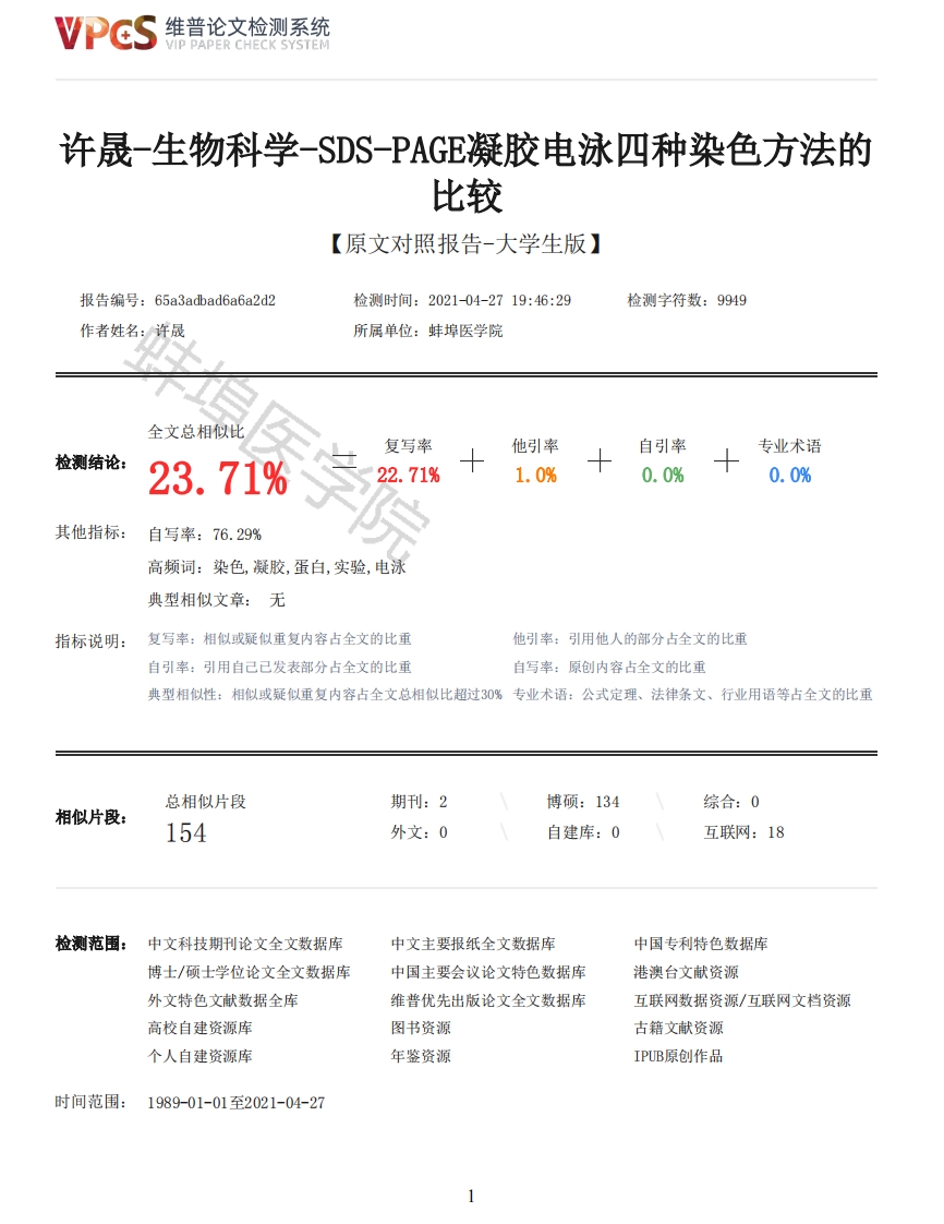 维普论文检测系统VIP PAPER CHECK SYSTEM许晟-生物科学-SDS-PAGE凝胶电泳四种染色方法的比较【原文对照报告-大学生版】报告编号:65a3 adbade6a6a2d2检测时间:2021-04-2719:46:29检测字符数:9949作者姓名:许晟所属单位:蚌埠医学院全文总相似比复写率他引率自引率专业术语检测结论:23.71%22.71%1.0%0.0%0.0%其他指标:自写率:76.29%高频词:染色,凝胶,蛋白,实验,电泳典型相似文章:无指标说明:复写率:相似或疑似重复内容占全文的比重他引率:引用他人的部分占全文的比重自引率:引用自己已发表部分占全文的比重自写率:原创内容占全文的比重典型相似性:相似或疑似重复内容占全文总相似比超过30%专业术语:公式定理、法律条文、行业用语等占全文的比重总相似片段期刊:2博硕:134综合:0相似片段:154外文:0自建库:0互联网:18检测范围:中文科技期刊论文全文数据库中文主要报纸全文数据库中国专利特色数据库博士/硕士学位论文全文数据库中国主要会议论文特色数据库港澳台文献资源外文特色文献数据全库维普优先出版论文全文数据库互联网数据资源/互联网文档资源高校自建资源库图书资源古籍文献资源个人自建资源库年鉴资源IPUB原创作品时间范围:1989-01-01至2021-04-27维普论文检测系统VIP PAPER CHECK SYSTEM原文对照颜色标注说明:■自写片段■复写片段(相似或疑似重复)引用片段(引用)■专业术语(公式定理、法律条文、行业用语等)蚌埠医学院毕业论文姓名:许晟专业:生物科学年级:2017学号:11710910090指导教师:李睿蚌埠医学院教务处制年月日目录一、中文摘要、关键词3二、英文摘要、关键词3三、论文正文前言41.材料与方法62.结果123.讨论184.结论185.致谢196.参考文献20四种SDS-PAGE凝胶电泳染色方法的比较摘要目的:将四种SDS-PAGE凝胶电泳染色方法进行比较,分别是考马斯亮蓝染色,考马斯亮蓝机染,银染,KCL染色,从而寻找出一种简易,经济,可重复实验性高和高灵敏度的染色方法。方法:使用相同的凝胶,样品,MARKER,IgG,BSA进行电泳,分别染色,从凝胶染色时间,背景颜色,灵敏度及实验成本的角度对四种SDS-PAGE凝胶电泳快速染色脱色进行研究比较,并对其各自的优缺点进行分析比较。结果:这些染色方法在灵敏度、显色速度和经济价值方面仍有很大的差异。KCL染色不仅染色效果差,而且不稳定。几十分钟后,染色带会变浅,不能满足实验要求。虽然机染法可以快速脱色,同时确保一定的灵敏度,但单次实验成本太高,无法用于一般实验。考马斯亮蓝染色法和银染法虽然染色灵敏度高,但是耗费大量的时间,并且2维普论文检测系统VIP PAPER CHECK SYSTEM实验材料价格比较昂贵。相较于银染法和考马斯亮蓝染色法和KCL染色法,机染法易操作,用时短,能够快速得到染色结果,并且还能保证灵敏度,对于需要批量生产凝胶检测或是大批量检测蛋白样品的用户来说性价比很高。结论:机染法简易又快捷,重复试验性高,又能够保持较高灵敏度,可以应用在临床检测中,并且还有改进空间。关键词:SDS-PAGE:考马斯亮蓝:银染:KCL染色Comparison of four SDS-PAGE electrophoresis methodsABSTRACTObeject:To compare four SDS-PAGE gel electrophoresis staining methods,Coomassie brilliantblue,Coomassie brilliant blue,Silver dye,KCL staining,To find a simple,Economy,repeatableexperimental high and highly sensitive staining methods.Methods:Using the same gel,Sample,MARKER,IgG,BSA electrophoresis,Separate staining,Fromgel staining time,Background color,Four kinds of SDS-PAGE gel electrophoresis were studied andcompared in terms of sensitivity and experimental cost,and their respective advantages anddisadvantages are analyzed.Results:There are still significant differences in the sensitivity,color rendering speed andeconomic value of these staining methods.KCL dyeing is not only poor,And unstable.In a fewminutes,The stain will be shallow,Can not meet the experimental requirements.Although the dyeingmethod can quickly decolorize,While ensuring sensitivity,But the cost of a single experiment istoo high,Can not be used in general experiments.Coomassie brilliant blue staining and silverstaining although high staining sensitivity,But it takes a lot of time,And the experimentalmaterials are expensive.Compared with silver staining and Coomassie brilliant blue staining and KCLstaining,Machine dyeing is easy to operate,Short time,Can get the dyeing result quickly,And italso guarantees sensitivity,For users who need mass production of gel detection or mass detectionof protein samples,the cost performance is very high.Conclusion:Machine dyeing method is simple and fast,High repetition,Can also maintain highsensitivity,Can be used in clinical testing,And there is room for improvement.Key words:SDS-PAGE;Coomassie brilliant blue;silver KCL dyeing前言十二烷基疏酸钠-聚丙烯酰胺凝胶电泳(sodium dodecyl sulphate-polyacrylamide gel electrophoresis,SDSPAGE),简称SDS电泳[1],主要用于蛋白质亚基分子量测定。SDS-PAGE凝胶电泳是定量、比较和识别蛋白质的常用方法。具有经济、速度、重复的特点。它可以根据蛋白质的分子量来分离。在现在的蛋白染色方法中,考马斯亮蓝染色法是最为常用的[2],虽然这种方法染色时间较长,但是其染色效果好,又比较简便,且银染法染色虽然灵敏度很高[3],但是实验试剂盒价格较高,实验操作步骤繁杂,实验时间较长,需要投入大量金钱和精力。所以在本实验中选择进行固定和染色,再脱色的方法,但由于条件有限,并没有使用加热等方法加快加速。但是考马斯亮蓝染色法染色时间长,虽然可以加快染色和脱色速度,但是实验操作