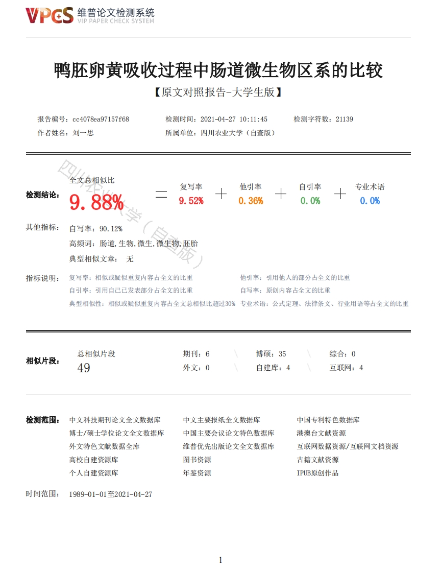 维普论文检测系统/IP PAPER CHECK SYSTEM鸭胚卵黄吸收过程中肠道微生物区系的比较【原文对照报告-大学生版】报告编号:cc4078ea97157f68检测时间:2021-04-2710:11:45检测字符数:21139作者姓名:刘一思所属单位:四川农业大学(自查版)全文总相似比复写率他引率自引率专业术语检测结论:9.88%9.52%0.36%0.0%0.0%其他指标:自写率:90.12%高频词:肠道,生物,微生,微生物,胚胎典型相似文章:无指标说明:复写率:相似或疑似重复内容占全文的比重他引率:引用他人的部分占全文的比重自引率:引用自己已发表部分占全文的比重自写率:原创内容占全文的比重典型相似性:相似或疑似重复内容占全文总相似比超过30%专业术语:公式定理、法律条文、行业用语等占全文的比重总相似片段期刊:6博硕:35综合:0相似片段:49外文:0自建库:4互联网:4检测范围:中文科技期刊论文全文数据库中文主要报纸全文数据库中国专利特色数据库博士/硕士学位论文全文数据库中国主要会议论文特色数据库港澳台文献资源外文特色文献数据全库维普优先出版论文全文数据库互联网数据资源/互联网文档资源高校自建资源库图书资源古籍文献资源个人自建资源库年鉴资源IPUB原创作品时间范围:1989-01-01至2021-04-27维普论文检测系统VIP PAPER CHECK SYSTEM原文对照颜色标注说明:■自写片段■复写片段(相似或疑似重复)口引用片段(引用)■专业术语(公式定理、法律条文、行业用语等)四川农业大学本科毕业论文(设计(2021届)农业大学题目:鸭胚卵黄吸收过程中肠道微生物区系的比较学院:动物科技学院专业:动物科学学生姓名:刘一思学号:201704838导师:刘贺贺职称:副教授完成日期:年月日目录摘要1Abstractl前言21材料和方法51.1试验材料51.2试验方法61.2.1盲肠组织切片制作与观察61.2.2DNA提取和16 S rRNA测序61.2.3肠道微生物多样性分析72结果与分析72.1肠道吸收卵黄前后形态观察72.2肠道微生物群概况82.3鸭胚胎期微生物功能注释92.4鸭不同胚胎发育肠道微生物的差异比较123讨论与结论14参考文献16致谢21附录22鸭胚卵黄吸收过程中肠道微生物区系的比较2维普论文检测系统VIP PAPER CHECK SYSTEM动物科学刘一思导师:刘贺贺摘要:鸟类作为卵生动物,其胚胎时期的肠道发育更加密闭,因而具有较丰富的微生物定植。实验旨在探究鸭胚胎肠道中是否已有微生物定植及其变化情况。本研究观察16、22胚龄和出壳第一天的鸭肠道切片,并通过对整个肠道的16 S rRNA测序进行微生物物种多样性分析。结果表明:随鸭胚肠道的发育,有以Proteobacteria(61.6%81.9%)为主的23个门和276个属的微生物,功能主要以新陈代谢(44.77%)和遗传信息处理(20.84%)为主。在胚胎期,主要富集了Lac tobacillus等5种菌属;在出壳后,主要富集了Romboutsia等3种菌属。由此得出结论,鸭胚胎已有肠道微生物定植,且随着卵黄的吸收及肠道发育,不同阶段定植微生物的丰度和多样性也随之发生变化。本研究为深入探究鸭肠道微生物提供参考,对禽类胚胎相关研究提供基础。关键词:肠道微生物:定植:16 S rRNA:鸭:胚胎The Early Microbial Colonization in Duck Embryos Revealed by Comparing Gut Microbiota DuringEmbryonic Yolk Absorption ProcessAnimal Science Liu Yi-siDirected by Liu He-heAbstract:As oviparous animals,avian can obtain nutrients through foraging after hatching.Therefore,the improvement of embryonic intestine function is of great significance to avian.Therefore,we suspected that the types and functions of gut microbiota may change at early and latestages of yolk absorption.Herein,we take duck as a model to investigate the colonization andchanges about species and functions of gut microbiota during the yolk absorption process in avian.Through histological observations,we observed the number of intestinal villus protrusions graduallyincreased with the development of duck embryos,which supporting the development of duck embryosintestine before and after yolk absorption.We thus performed 16S rRNA sequencing of duck embryosintestine at different stages.The microbial classifications revealed that 23 phyla,276 genera,and200 species were present in the 16-day (E16),22-day (E22)embryos and the 1-day (D1)ducklings.Thefunctions were mainly about metabolism (44.77%)and genetic information processing (20.84%).At theembryonic stage,intestinal microorganisms were mainly enriched with Lactobacillus,Blautia andFaecalibacterium.After hatching,the intestinal microorganisms were mainly enriched with Romboutsiaand Mesorhizobium.Our results demonstrated that,during duck embryo stages,gut microbiota havebeen colonized at different developmental stages of the duck embryos and change with yolk absorptionand intestine development.This study provides a reference for further research on duck gutmicrobiota and provides a basis for related research on avian embryos.Key words:gut microbiota:colonization:16S rRNA;duck:embryo前言肠道微生物在机体中的数量是体细胞数量的数倍,其在维特稳态、调节宿主的免疫系统以及影响宿主的发有和生理过程中发挥积极作用[1-3]。肠道菌群通过调节机体代谢与免疫间的平衡,经不同途径作用于多种组织器官进而影响早期发育[4]。肠道微生物群作为一个整体,广泛影响宿主对肠道及全身各处疾病的生理和病理反应,并且可以作为一个重要的内分泌器官,通过多种途径参与调控宿主能量、血糖和炎症[5],部分肠道核心菌群能够参与宿主必须氨基酸、能量、辅因子和维生素的代谢[1]。肠道微生物的多样性与畜禽健康与生产也有着密切关联,例如,断奶仔猪会由于肠道菌群失调而引起腹泻[6],禽流感病毒可