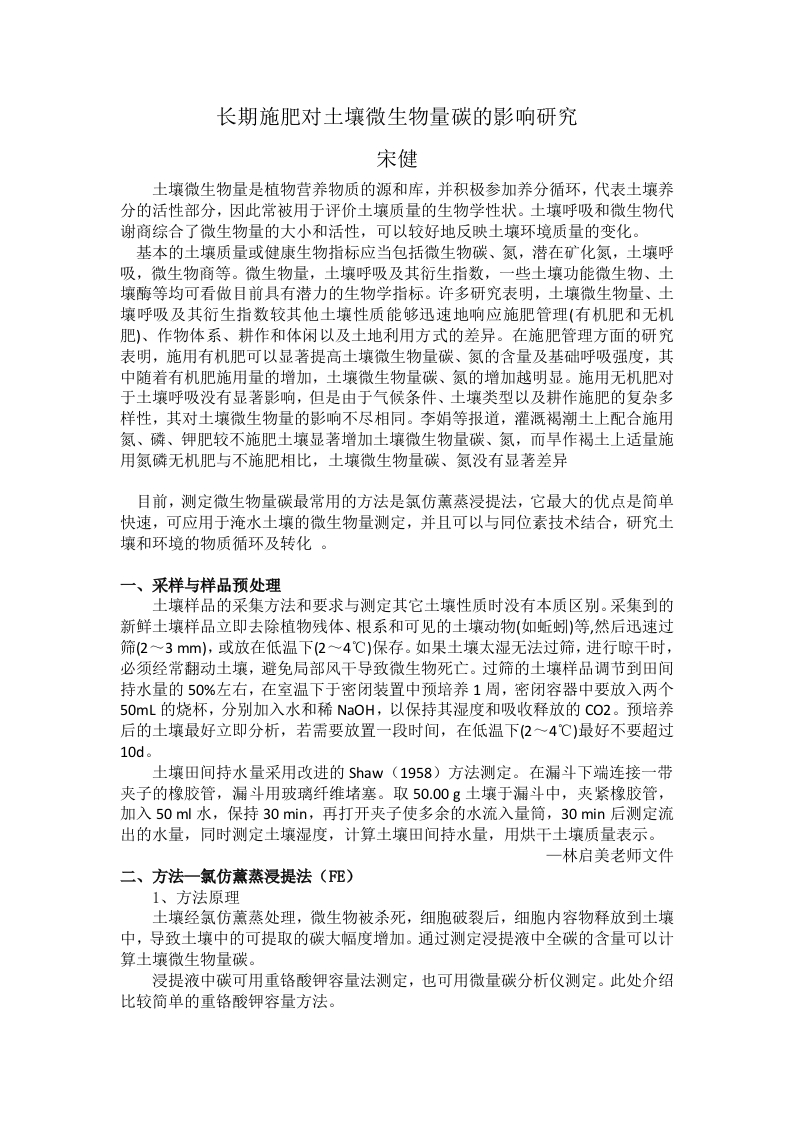 长期施肥对土壤微生物量碳的影响研究宋健土壤微生物量是植物营养物质的源和库,并积极参加养分循环,代表土壤养分的活性部分,因此常被用于评价土壤质量的生物学性状。土壤呼吸和微生物代谢商综合了微生物量的大小和活性,可以较好地反映土壤环境质量的变化。基本的土壤质量或健康生物指标应当包括微生物碳、氮,潜在矿化氮,土壤呼吸,微生物商等。微生物量,土壤呼吸及其衍生指数,一些土壤功能微生物、土壤酶等均可看做目前具有潜力的生物学指标。许多研究表明,土壤微生物量、土壤呼吸及其衍生指数较其他土壤性质能够迅速地响应施肥管理(有机肥和无机肥)、作物体系、耕作和体闲以及土地利用方式的差异。在施肥管理方面的研究表明,施用有机肥可以显著提高土壤微生物量碳、氮的含量及基础呼吸强度,其中随着有机肥施用量的增加,土壤微生物量碳、氮的增加越明显。施用无机肥对于土壤呼吸没有显著影响,但是由于气候条件、土壤类型以及耕作施肥的复杂多样性,其对土壤微生物量的影响不尽相同。李娟等报道,灌溉褐潮土上配合施用氮、磷、钾肥较不施肥土壤显著增加土壤微生物量碳、氮,而旱作褐土上适量施用氮磷无机肥与不施肥相比,土壤微生物量碳、氮没有显著差异目前,测定微生物量碳最常用的方法是氯仿薰蒸浸提法,它最大的优点是简单快速,可应用于淹水土壤的微生物量测定,并且可以与同位素技术结合,研究土壤和环境的物质循环及转化。一、采样与样品预处理土壤样品的采集方法和要求与测定其它土壤性质时没有本质区别。采集到的新鲜土壤样品立即去除植物残体、根系和可见的土壤动物(如蚯蚓)等,然后迅速过筛(2~3mm),或放在低温下(2~4℃)保存。如果土壤太湿无法过筛,进行晾干时,必须经常翻动土壤,避免局部风干导致微生物死亡。过筛的土壤样品调节到田间持水量的50%左右,在室温下于密闭装置中预培养1周,密闭容器中要放入两个50mL的烧杯,分别加入水和稀NaOH,以保持其湿度和吸收释放的Co2。预培养后的土壤最好立即分析,若需要放置一段时间,在低温下(2一4℃)最好不要超过10d。土壤田间持水量采用改进的Shaw(1958)方法测定。在漏斗下端连接一带夹子的橡胶管,漏斗用玻璃纤维堵塞。取50.00g土壤于漏斗中,夹紧橡胶管,加入50ml水,保持30min,再打开夹子使多余的水流入量简,30min后测定流出的水量,同时测定土壤湿度,计算土壤田间持水量,用烘干土壤质量表示。一林启美老师文件二、方法一氯仿薰蒸浸提法(FE)1、方法原理土壤经氯仿薰蒸处理,微生物被杀死,细胞破裂后,细胞内容物释放到土壤中,导致土壤中的可提取的碳大幅度增加。通过测定浸提液中全碳的含量可以计算土壤微生物量碳。浸提液中碳可用重铬酸钾容量法测定,也可用微量碳分析仪测定。此处介绍比较简单的重铬酸钾容量方法。2、仪器及设备培养箱:真空干燥器:真空泵;往复式振荡机(速率200rev/min):冰柜:磷酸浴。3、试剂1.无乙醇氯仿:量取500mL氯仿于1000mL的分液漏斗中,加入50mL硫酸溶液[(H2S04)=5%],充分摇匀,弃除上层硫酸溶液,如此进行3次。再加入50mL去离子水,同上摇匀,弃去上部的水分,如此进行5次。得到纯氯仿存放在棕色瓶中,并加入约20g无水K2C03,在冰箱的冷藏室中保存备用。(试剂浓硫酸(H2S04)=9598%,稀释19倍)2.硫钾溶液[c(K2S04)=0. 5 mol・L-1]:取硫酸钾(K2S04,化学纯)87.10g,加热溶于去离子水中,稀释至1L。(需加热溶解)3.重铬酸钾[c(1/6K2Cr207)=0.2000mo1·L-1]:称取经130摄氏度烘干2~3h的重铬酸钾(K2Cr207分析纯)9.8110g,溶于1000mL的去离子水中。4.重准液:[c(1/6K2Cr207)=0.1000mol・L-1]:称取经130oC烘干2~3h的重铬酸钾(K2Cr207,分析纯)4.9055g,溶于1000mL的去离子水中。5.邻啡罗啉指示剂:称取邻啡罗啉指示剂[C12H8N2·H20,分析纯]1.49g,溶于含有0.70gFeS04·7H20的100mL去离子水中,密闭保存于棕色瓶中。6.硫酸铁液[c(FeS04)=0.05 mol・L-1]:硫酸铁(FeS04・7H20)约13.9005g,溶解于600~800mL去离子水中,加浓硫酸(化学纯)20mL,搅拌均匀,定容至1000mL,于棕色瓶中保存。此溶液不稳定,需在用时每天标定其浓度。7.硫酸亚铁溶液浓度的标定:吸取重铬酸钾标准溶液5.00mL,放入100mL三角瓶中,加水约20mL,加浓硫酸5mL和邻啡罗啉指示剂2滴,用FeS04溶液滴定,根据FeS04溶液的消耗量即可计算FeS04溶液的准确浓度。硫酸亚铁溶液标定方法:吸取0.1000mo1L-1(1/6K2Cr207)标准溶液(试剂4)5.0m1,放入150m1三角瓶中,加浓硫酸5m1和邻啡罗啉指示剂2滴,用硫酸亚铁溶液滴定,滴至溶液由蓝绿色变为棕红色即为终点。根据滴到终点消耗的硫酸亚铁溶液量计算其准确浓度,即C2=(C1×V1)/V2。式中:C1一重铬酸钾标准溶液浓度(0.1000mo1L-1)C2一硫酸亚铁标准溶液浓度(mo1L-1);V1一吸取的重铬酸钾标准溶液体积(5m1):V2一滴到终点时消耗硫酸亚铁溶液体积(m1)三、操作步骤3.1薰蒸称取相当于20.0g烘干土重的湿润土壤3份,分别放在约100mL的烧杯中,一起放入同一干燥器中,干燥器底部放置小烧杯盛装少量的水以保持湿度,同时放入一个装有50mLNa0H溶液和一个装有约50mL的无乙醇氯仿的小烧杯(根据干燥器的大小可以增加氯仿的用量,同时加入少量的直径约为0.5mm的碎瓷片),用少量凡士林密封干燥器,用真空泵抽气至氯仿沸腾并保持至少2mi。关闭干燥器的阀门,在25oC的黑暗条件下放置24h。打开阀门,如果没有空气流动的声音,表示干燥器漏气,应重新称样进行薰蒸处理。当干燥器不