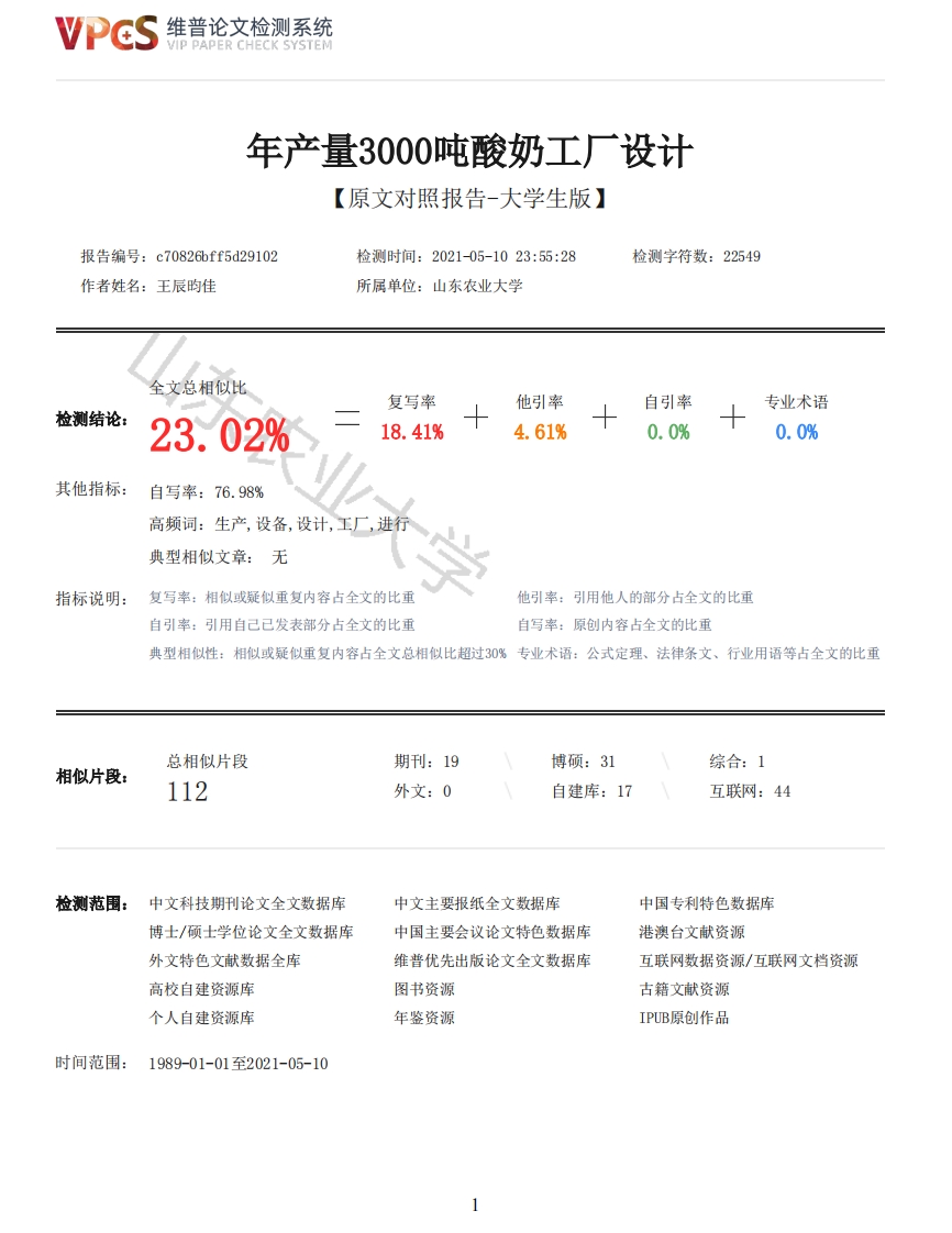 维普论文检测系统VIP PAPER CHECK SYSTEM年产量3000吨酸奶工厂设计【原文对照报告-大学生版】报告编号:c70826bff5d29102检测时间:2021-05-1023:55:28检测字符数:22549作者姓名:王辰昀佳所属单位:山东农业大学全文总相似比复写率他引率自引率专业术语检测结论:23.02%18.41%4.61%0.0%0.0%其他指标:自写率:76.98%高频词:生产,设备,设计,工厂,进行典型相似文章:无指标说明:复写率:相似或疑似重复内容占全文的比重他引率:引用他人的部分占全文的比重自引率:引用自己已发表部分占全文的比重自写率:原创内容占全文的比重典型相似性:相似或疑似重复内容占全文总相似比超过30%专业术语:公式定理、法律条文、行业用语等占全文的比重总相似片段期刊:19博硕:31综合:1相似片段:112外文:0自建库:17互联网:44检测范围:中文科技期刊论文全文数据库中文主要报纸全文数据库中国专利特色数据库博士/硕士学位论文全文数据库中国主要会议论文特色数据库港澳台文献资源外文特色文献数据全库维普优先出版论文全文数据库互联网数据资源/互联网文档资源高校自建资源库图书资源古籍文献资源个人自建资源库年鉴资源IPUB原创作品时间范围:1989-01-01至2021-05-10维普论文检测系统VIP PAPER CHECK SYSTEM原文对照颜色标注说明:■自写片段■复写片段(相似或疑似重复)口引用片段(引用)■专业术语(公式定理、法律条文、行业用语等)山东农业大学毕业论文学院食品科学与工程届次2021届学生姓名王辰昀佳题目:年产3000吨酸奶工厂设计专业班级食品科学与工程专业2班学号20174290指导教师黄明明(讲师)2020年6月1日目录摘要11绪论21.1酸乳介绍21.2酸乳的营养价值21.3酸乳的前景21.4设计依据21.5设计依据跟原则31.6设计内容32厂址选择33生产方案与工艺设计53.1产品方案53.2工艺流程[5]83.3操作要点83.4各产品年生产量84工艺衡算及设备选型84.1物料衡算84.2设备选型94.3热量计算125企业组织与劳动编制135.1企业组织135.2生产制度132维普论文检测系统VIP PAPER CHECK SYSTEM5.3劳动定员[10]136辅助设施建设156.1辅助设施分类156.2主要辅助部门157总平面设计157.1总平面设计原则[11]157.2厂区建设面积[12]167.3厂房及车间平面布置图178水、电、汽的供给178.1供水178.2供电179水、电、汽的估算189.1用汽估算189.2用水估算189.3用电估算1810环境保护1810.1工业三废1810.2废水1910.3废气1910.4废渣1911经济核算1911.1固定资产19东农业大学11.2经营费用估算2111.3投资回收期分析2212设计总结22参考文献23附图24致谢30DirectorySummary 11 Introductiony 21.1 Lactate Introductiony 21.2 Nutritional value of yoghurt 21.3 Prospects for yoghurt 21.4 Design implications and innovations 21.5 Design Basis and Principle 31.6 Design content 32 Site selection 33 Production plan and process design 53.1 Product programme 53.2 Process 83.3 OPINION 83.4 Annual production of products 84 Process balance and equipment selection 84.1 Material balance 84.2 Type of equipment 94.3 Heat calculations 123