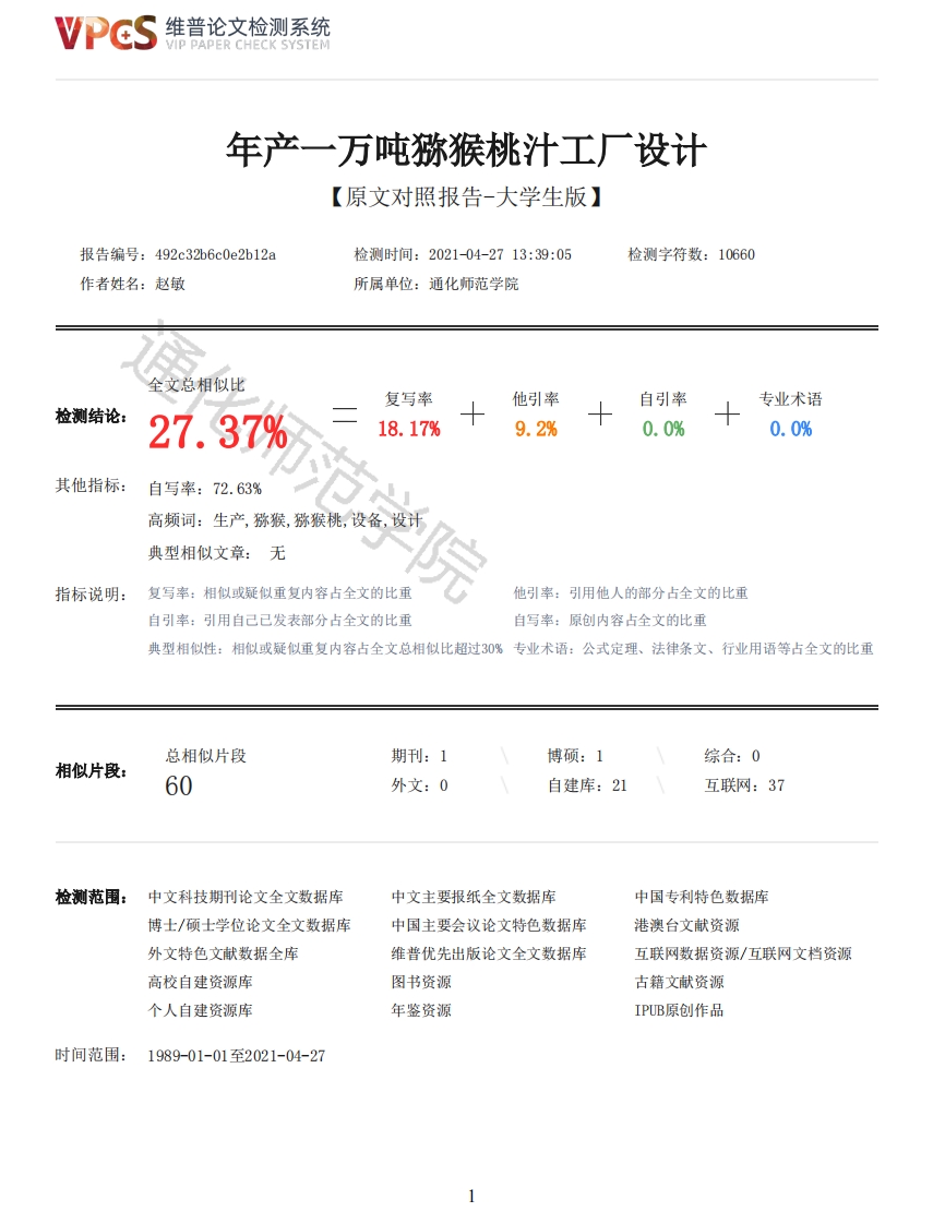 维普论文检测系统VIP PAPER CHECK SYSTEM年产一万吨猕猴桃汁工厂设计【原文对照报告-大学生版】报告编号:492c32b6c0e2b12a检测时间:2021-04-2713:39:05检测字符数:10660作者姓名:赵敏所属单位:通化师范学院全文总相似比复写率他引率自引率专业术语检测结论:27.37%18.17%9.2%0.0%0.0%其他指标:自写率:72.63%高频词:生产,猕猴,猕猴桃,设备,设计典型相似文章:无指标说明:复写率:相似或疑似重复内容占全文的比重他引率:引用他人的部分占全文的比重自引率:引用自己已发表部分占全文的比重自写率:原创内容占全文的比重典型相似性:相似或疑似重复内容占全文总相似比超过30%专业术语:公式定理、法律条文、行业用语等占全文的比重总相似片段期刊:1博硕:1综合:0相似片段:60外文:0自建库:21互联网:37检测范围:中文科技期刊论文全文数据库中文主要报纸全文数据库中国专利特色数据库博士/硕士学位论文全文数据库中国主要会议论文特色数据库港澳台文献资源外文特色文献数据全库维普优先出版论文全文数据库互联网数据资源/互联网文档资源高校自建资源库图书资源古籍文献资源个人自建资源库年鉴资源IPUB原创作品时间范围:1989-01-01至2021-04-27维普论文检测系统VIP PAPER CHECK SYSTEM原文对照颜色标注说明:■自写片段■复写片段(相似或疑似重复)口引用片段(引用)■专业术语(公式定理、法律条文、行业用语等)通化师范学1958A通化师范学院本科生毕业论文(2021届)题目年产10000吨猕猴桃汁工厂设计学院食品科学与工程学院专业食品质量与安全班级1702作者姓名赵敏学号201715050127指导教师崔艳艳职称助理实验师学位硕士论文成绩2020年4月目录中文摘要1中文关键词1英文摘要1英文关键词11概述11.1中国果汁发展概况12厂址的选择32.1厂地情况32.2厂址33产品生产工艺设计33.1产品方案以及班产量的确定33.2生产工艺流程42维普论文检测系统VIP PAPER CHECK SYSTEM4物料衡算44.1物料衡算依据44.2猕猴桃汁的物料衡算55设备选型65.1设备选型的原则66水、电衡算96.1水衡算96.2电衡算97总平面的设计117.1总平面图的设计规划117.2全厂平面设计118人员配置139总结与展望14致谢14参考文献:15年产10000吨猕猴桃汁工厂设计食品科学与工程学院1702班赵敏摘要:项目总用地面积39666.49平方米(折合约59.47亩),土地综合利用率100.00%:猕猴桃果汁项目投资建议书项目净用地面积39666.49平方米,建筑的物基底占地面积为19991.91平方米,总建筑面积51169.77平方米,其中:规划建设主体工程35473.16平方米,项目规划绿化面积2963.20平方米.项目建设遵循“合理和集约用地”的原则,按照猕猴桃果汁行业生产规范和要求进行科学设计、合理布局,符合规划建设要求.生产所需的设备进行选型.通过各个方面的分析与理论估算为猕猴桃汁的加工生产提供实际参考依据.关键词:猕猴桃:果汁:生产:工厂设计Design of 10000 tons kiwifruit juice factoryCollege of Food Science and Engineering 1702 Class ZHAO MinAbstract:The total land area of the project is 39666.49 square meters (equivalent to about59.47 mu),The comprehensive utilization rate of land is 100.00%;Kiwifruit juice project investmentproposal project net land area of 39666.49 square meters,The floor area of the building is 19991.91square meters,Total floor area 51169.77 square meters,Among them,planning and construction of themain project 35473.16 square meters,Project planning greening area of 2963.20 square meters.Project construction follows the principle of rational and intensive land use,Scientific design andrational layout according to the production specifications and requirements of kiwifruit juiceindustry,Meet the requirements of planning and construction.Type selection of equipment requiredfor production.Through the analysis and theoretical estimation of various aspects,it provides apractical reference for the processing and production of kiwifruit juice.Key words:Polygonatum odoratum;Juice:Production:Factory design.1概述1.1中国果汁发展概况果汁类饮料有着非常良好的市场应用前景。原料的产量比较有限,这在很大的程度上制约了产品的市场的覆盖率[1],因此这也是大公司大企业则是不愿参加到其中的原因。国外没有我国这样的特色水果品种(世界上只有新西兰有一定数量的不同品种,其他国家不同品种产量极小)。1.1.2猕猴桃汁简介猕猴桃的口味在众多水果类中较突出,甘甜爽口,富含的营养元素也较全面。榨汁后的猕猴桃具有促消化、美肤、调节血压等功效[2]。1、猕猴桃汁中含有丰富的膳食纤维食用,可以促进消化,同时还有防止便秘的功能。此外,猕猴桃汁含有的蛋白酶和木瓜蛋白酶具有促进消化的作用[3]。2、猕猴桃汁中含有丰富的维生素C、维生素E、茄红素等也有一定抗氧化作用。1.1.3项目依据及发展趋势3