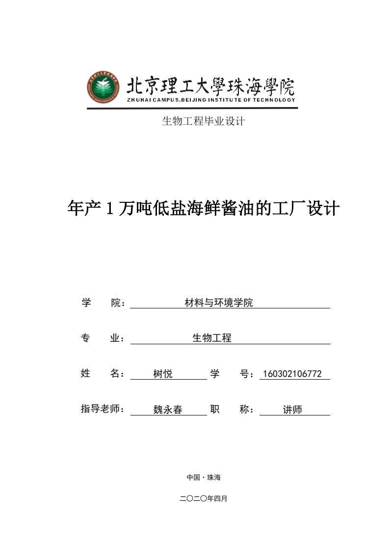 北京理工大學珠海學院ZHUHAI CAMPUS.BEIJING INSTITUTE OF TECHNOLOGY生物工程毕业设计年产1万吨低盐海鲜酱油的工厂设计学院:材料与环境学院专业:生物工程姓名:树悦学号:160302106772指导老师:魏永春职称:讲师诚信承诺书本人郑重承诺:本人承诺呈交的毕业设计《年产1万吨低盐海鲜酱油的工厂设计》是在指导教师的指导下,独立开展研究取得的成果,文中引用他人的观点和材料,均在文后按顺序列出其参考文献,计算使用的数据真实可靠。本人签名:日期:年月日摘要酱油是我们日常生活中必不可少的调味品,酱油可以给我们的食物调味还含有丰富的氨基酸。由于经济和人们生活水平的提高,人们对生活要求也越来越高,特别是对食物的要求,那么根据人们对调味品的需求以及对于酱油的发展趋势的分析,确定了本设计为低盐海鲜酱油的产品方案。本毕业设计的定位是设计一间年产量为1万吨的低盐海鲜酱油工厂,制造原料有豆粕,小麦及麸皮等,工艺为低盐固态发酵,发酵完成后需要配兑加入例如防腐剂等的食品添加剂,再分装,完成酱油的制作。低盐海鲜酱油的生产工艺大体可以分为五大工序:原料处理、制曲、发酵、原油配兑与成品酱油。本设计对成品海鲜酱油进行工艺流程,物料衡算,工厂布置以及三废处理等进行设计。关键词:低盐,制曲,发酵,工艺流程,酿造酱油,低盐固态发酵,食品添加剂,氨基酸