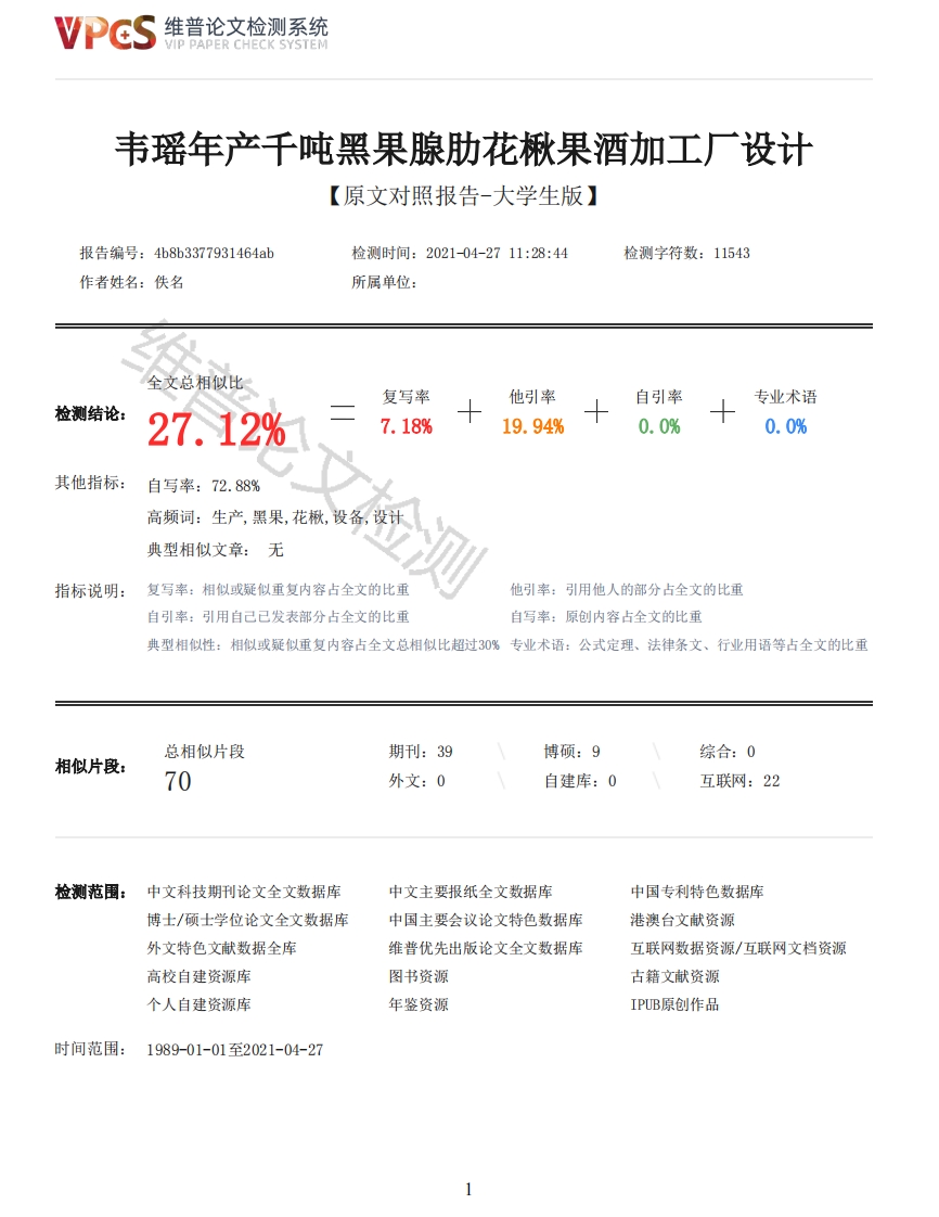 维普论文检测系统VIP PAPER CHECK SYSTEM韦瑶年产千吨黑果腺肋花揪果酒加工厂设计【原文对照报告-大学生版】报告编号:468b3377931464ab检测时间:2021-04-2711:28:44检测字符数:11543作者姓名:佚名所属单位:全文总相似比复写率他引率自引率专业术语检测结论:27.12%7.18%19.94%0.0%0.0%其他指标:自写率:72.88%高频词:生产,黑果,花楸,设备,设计典型相似文章:无指标说明:复写率:相似或疑似重复内容占全文的比重他引率:引用他人的部分占全文的比重自引率:引用自己已发表部分占全文的比重自写率:原创内容占全文的比重典型相似性:相似或疑似重复内容占全文总相似比超过30%专业术语:公式定理、法律条文、行业用语等占全文的比重总相似片段期刊:39博硕:9综合:0相似片段:70外文:0自建库:0互联网:22检测范围:中文科技期刊论文全文数据库中文主要报纸全文数据库中国专利特色数据库博士/硕士学位论文全文数据库中国主要会议论文特色数据库港澳台文献资源外文特色文献数据全库维普优先出版论文全文数据库互联网数据资源/互联网文档资源高校自建资源库图书资源古籍文献资源个人自建资源库年鉴资源IPUB原创作品时间范围:1989-01-01至2021-04-27维普论文检测系统VIP PAPER CHECK SYSTEM原文对照颜色标注说明:■自写片段■复写片段(相似或疑似重复)口引用片段(引用)■专业术语(公式定理、法律条文、行业用语等)195B通化师范学院本科生毕业论文(2021届)题目年产千吨黑果腺肋花楸果酒加工厂设计学院食品科学与工程学院专业食品科学与工程班级1705作者姓名韦瑶学号201715090316指导教师孙海涛职称教授学位博士论文成绩2021年5月目录中文摘要1中文关键词1英文摘要1英文关键词11概述11.1黑果腺肋花楸简介11.2黑果腺肋花楸的营养价值11.3果酒的发展前景21.4黑果腺肋花楸果酒工厂的设计意义21.5设计原则依据22厂址选择32.1选址原则32.2选址范围和原因33产品方案32维普论文检测系统VIP PAPER CHECK SYSTEM3.1工艺流程33.2工艺说明33.3感官、理化、安全指标54物料衡算64.1物料衡算依据64.2黑果腺肋花楸果酒的物料衡算65设备选型76劳务计算77公共系统设计87.1用电用水87.2厂区管路系统97.3通风97.4全厂卫生的规范98厂区平面设计、车间平面设计及设备布置109基本建设概算及技术经济分析10参考文献11附录13年产千吨黑果腺肋花楸果酒加工厂设计食品科学与工程学院1705班韦瑶摘要:黑果腺肋花楸作为一种新兴野生小浆果,其富含极高的营养价值,对人的健康非常有益.本文以黑果腺肋花楸为主要对象,基于其特点制成果酒,并进行年产干吨的工厂设计.首先,了解黑果腺肋花楸的发展前景和建设酒厂的可行性确定工艺流程:其次确定厂区地址的选择,总布局设计,车间设计,主要装置的计算和选择.通过物料的衡算方法来确定所需原料的消耗量、车间必须需要花费的耗水量、耗电量等:最后,进行基本建设概算及技术经济分析.关键词:黑果腺肋花楸:果酒:设计,Design of 1000t/a Aronia melanocarpa Wine FactoryCollege of Food Science and Engineering 1705 Class WEI YaoAbstract:As a new kind of small wild berry,Aronia melanocarpa is rich in high nutritionalvalue,which is very beneficial to people's health.In this article,Aronia melanocarpa as the mainobject,based on its characteristics made of fruit wine,and the annual output of 1000 tons offactory design;First of all,to understand the development prospects of Aronia melanocarpa and thefeasibility of building a winery,determine the process.Secondly,the selection of plant location,general layout design,workshop design,calculation and selection of main devices are determined.The consumption of raw materials,water consumption and power consumption that workshop must spendare determined by material balance method;Finally,Capital construction budget and technical andeconomic analysis.Key words:Aronia melanocarpa;fruit wine;design.1概述1.1黑果腺肋花楸简介黑果腺肋花楸(Aronia melanocarpa),原产地是北美东部与加拿大东部.简称黑果,又称野樱莓、不老莓,分为红色、紫色、黑色属等品种.腺肋花楸属灌木,落叶阔叶灌木,灌木丛高度可达2~3m,现有近百年的种植历史.从20世纪90年代起,我国先后从国外许多地引区进十余个品种,在新疆、辽宁等地均有栽培,现吉林省种植规模位于我国前列.1.2黑果腺肋花楸的营养价值黑果腺肋花楸果实集食用、观赏、生态、药用价值多用途为一体,在我国市场有着不可估量的发展前景[1-2].黑果腺肋楸果实中含有不同于其他植物的丰富的生物活性物质,国内外研究者对其活性物质的种类和功能进行广泛研究,得知黑果腺肋花楸中含有蛋白质、有机酸、丰富的多酚类物质、碳水化合物和维生素等物质,且多酚类物质3