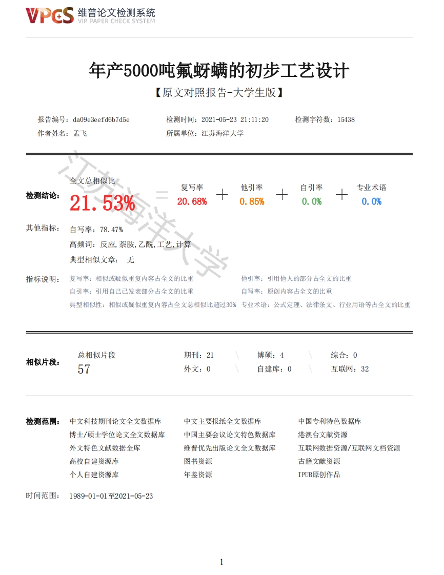维普论文检测系统VIP PAPER CHECK SYSTEM年产5000吨氟蚜螨的初步工艺设计【原文对照报告-大学生版】报告编号:da09e3eefd6b7d5e检测时间:2021-05-2321:11:20检测字符数:15438作者姓名:孟飞所属单位:江苏海洋大学全文总相似比复写率他引率自引率专业术语检测结论:21.53%20.68%0.85%0.0%0.0%其他指标:自写率:78.47%高频词:反应,萘胺,乙酰,工艺,计算典型相似文章:无指标说明:复写率:相似或疑似重复内容占全文的比重他引率:引用他人的部分占全文的比重自引率:引用自己已发表部分占全文的比重自写率:原创内容占全文的比重典型相似性:相似或疑似重复内容占全文总相似比超过30%专业术语:公式定理、法律条文、行业用语等占全文的比重总相似片段期刊:21博硕:4综合:0相似片段:57外文:0自建库:0互联网:32检测范围:中文科技期刊论文全文数据库中文主要报纸全文数据库中国专利特色数据库博士/硕士学位论文全文数据库中国主要会议论文特色数据库港澳台文献资源外文特色文献数据全库维普优先出版论文全文数据库互联网数据资源/互联网文档资源高校自建资源库图书资源古籍文献资源个人自建资源库年鉴资源IPUB原创作品时间范围:1989-01-01至2021-05-23维普论文检测系统VIP PAPER CHECK SYSTEM原文对照颜色标注说明:■自写片段■复写片段(相似或疑似重复)口引用片段(引用)■专业术语(公式定理、法律条文、行业用语等)JIANGSU OCEAN UNIVERSITY本科毕业设计(论文)年产5000吨氟蚜螨的初步工艺设计Preliminary Process Design of Annual Production of 5,000 tons of Nissol学院:化学工程学院专业班级:化学工程与工艺化工172学生姓名:孟飞学号:2017121547指导教师:赵跃强(副教授)2021年5月毕业设计(论文)中文摘要年产5000吨氟蚜螨的初步工艺设计摘要:氟蚜螨现如今不仅对杀虫剂已产生抗性的虫类有了比较高的活性,而且对柑桔和苹果等具有着色美观的作用。是果树和棉田红蜘蛛等埔类“克星。氟蚜螨从合成上看,其原料易得,且工艺不复杂、易于工业化:从药效上来看,可与市场上已有的杀虫剂相比,且原料成本明显较低,氟蚜螨是一种有前途的品种。它的制法制法1-萘胺与氯乙酰氯反应得1-氯乙酰萘胺。1-氯乙酰萘胺与硫酸二甲酯反应得N-氯乙酰基-N-甲基-1-萘胺,用氟化钾氟化后得氟蚜螨。关键词:氟蚜螨:取代反应:工艺设计毕业设计(论文)外文摘要Preliminary Process Design of Annual Production of 5,000 tons of NissolAbstract:The aphid mite not only has high activity to the insects which have resistance to the2维普论文检测系统VIP PAPER CHECK SYSTEMexisting insecticides.Moreover,it has the function of coloring and beautifying for oranges andapples.It is the "Nemesis"of the red spider in the fruit trees and cotton fields.In terms ofsynthesis,the raw materials are easy to obtain,the process is not complicated,and it is easy toindustrialize.Compared with the existing insecticides in the market,the cost of raw materials is obviouslylower,so it is a promising variety.1-chloroacetylnaphthylamine was prepared by the reaction of 1-naphthylamine with chloroacetyl chloride.N-chloroacetyl-n-methyl-1-naphthylamine was synthesized bythe reaction of 1-chloroacetyl-naphthylamine with dimethyl sulfate and fluorinated with potassiumfluoride.Keywords:nissol;substitution reaction;process design目录1绪论11.1工艺路线评述11.2本设计的意义12工艺流程选择和设计计算12.1邻苯二甲酸二丁酯的实验室合成方法12.2工艺过程模拟22.3物料衡算72.4热量衡算15大学3设备尺寸计算及选型183.1主要设备计算183.2管路计算193.3泵的计算与选型203.4过滤机的选型213.5主要设备一览表214产品年产量、原料消耗及公用工程224.1产品年产量224.2原料消耗定额224.3公用工程225三废处理225.1废气225.2废水235.3废渣236经济衡评估236.1生产装置投资236.2产品成本概算256.3固定成本概算256.4技术经济分析26结论27致谢28参考文献29附录一能量衡算一览表30附录二Aspen Plus模拟计算结果汇总表311绪论3