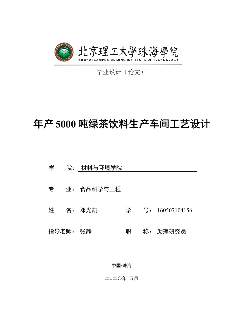 北京理工大學珠海學院毕业设计(论文)年产5000吨绿茶饮料生产车间工艺设计学院:材料与环境学院专业:食品科学与工程姓名:邓光凯学号:160507104156指导老师:张静职称:助理研究员中国珠海北京理工大学珠海学院2020本科生毕业设计诚信承诺书本人郑重承诺:本人承诺呈交的毕业设计《年产5000吨绿茶饮料生产车间工艺设计》是在指导教师的指导下,独立开展研究取得的成果,文中引用他人的观点和材料,均在文后按顺序列出其参考文献,设计使用的数据真实可靠。本人签名:邓光凯日期:2020年5月1日北京理工大学珠海学院2020本科生毕业设计年产5000吨绿茶饮料生产车间工艺设计摘要绿茶是我国主要茶类之一,是未经发酵制成的茶,保留了鲜叶的天然物质,含有丰富的茶多酚、儿茶素、叶绿素、咖啡碱、氨基酸、维生素等营养成分。本设计是年产5000吨绿茶饮料生产车间工艺设计,设计对绿茶饮料浸提工艺方式进行研究和比对,通过选用合适的浸提方式,优化改良了绿茶饮料的生产工艺,确定了设计路线。通过物料衡算对产品进行设备选型。并对全厂进行平面规划设计,合理化安排生产,绘制了对应的设备流程图、工厂平面图以及车间布置图。最后对成本和收益进行了估算。关键词:绿茶饮料:浸提:工厂设计