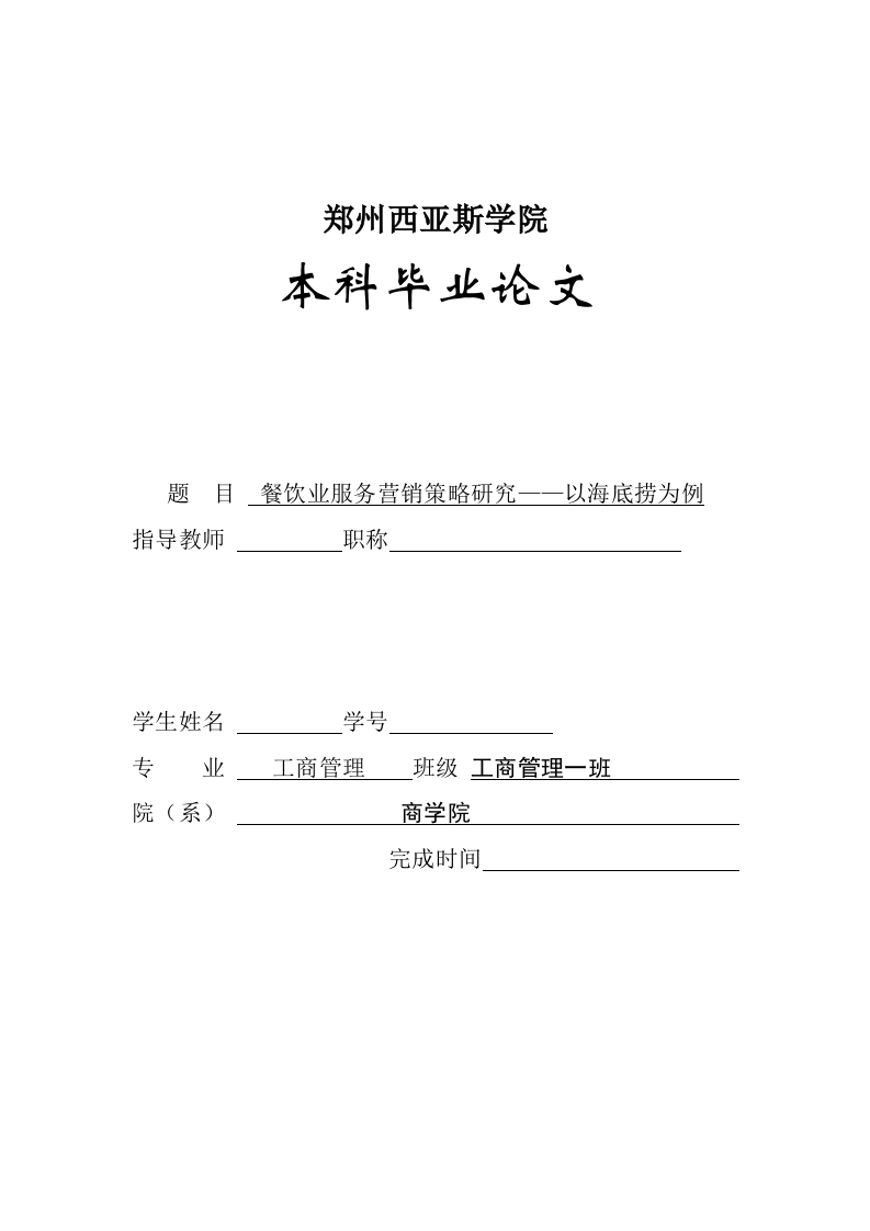 郑州西亚斯学院本科毕业论文题目餐饮业服务营销策略研究一一以海底捞为例指导教师职称学生姓名学号专业工商管理班级工商管理一班院(系)商学院完成时间餐饮业服务营销策略研究一以“海底捞”为例摘要随着我国经济的稳健发展,人民的生活质量也逐渐提高,人们的追求也日益增加。餐饮行业作为我们老话中“吃穿住行”中的“吃”,是人民群众日常生活中触手可及的。与餐饮业所提供的产品相比,餐饮行业的服务营销也是至关重要的。海底捞作为餐饮行业的领头羊,不仅门店众多,影响力也比较大,在日常的生活中消费者也愿意去探讨在海底捞吃饭的话题。海底捞最令人称道的是它独特的服务体系,它能在最大程度满足顾客的基础上,为顾客提供人性化的服务。在市场竞争愈发激烈的今天,海底捞若想保持优势、继续发展,服务营销则显得尤为重要。本文以“海底捞”为例,结合STP、期望确认等相关理论,分析内外环境下,“海底捞”在服务营销方面所面临的的问题,并针对问题提出解决方案。关键词:海底捞服务营销;消费者行为Research on Service Marketing Strategy of Catering IndustryTake "Haidilao"as an exampleABSTRACTHaidilao,as one with the rising consumption level of mostconsumers,consumers ha.ve higher and higher requirements forservice quality.Catering industry as an important part of theservice industry,the quality of service directly determinesthe status of enterprises in the eyes of consumersf therepresentatives of the catering industry,not only has nearlya thousand chain stores,but also the experience of consumerseating in Haidilao is also one of the favorite topics in socialapplication software.Its unique feature is that it has a uniqueservice marketing system,pays attention to consumers'preferences and needs,and provides humanized and personalizedservices.In today's increasingly fierce market competition,if Haidilao wants to maintain its advantages and continue todevelop,service marketing is particularly important.This paper takes "Haidilao"as an example,combined with STPtheory,analyzes the problems faced by "Haidilao"in servicemarketing under the internal and external environment.