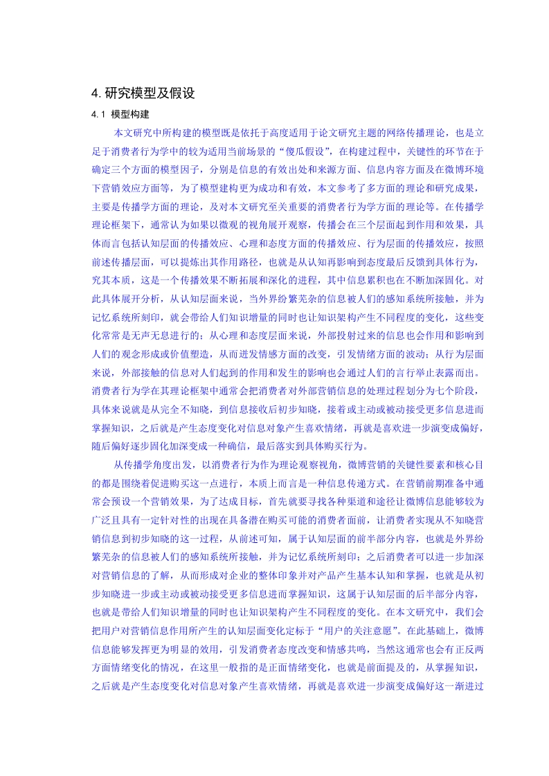 4.研究模型及假设4.1模型构建本文研究中所构建的模型既是依托于高度适用于论文研究主题的网络传播理论,也是立足于消费者行为学中的较为适用当前场景的“傻瓜假设”,在构建过程中,关键性的环节在于确定三个方面的模型因子,分别是信总的有效出处和来源方面、信息内容方面及在微博环境下营销效应方面等,为了模型建构更为成功和有效,本文参考了多方面的理论和研究成果,主要是传播学方面的理论,及对本文研究至关重要的消费者行为学方面的理论等。在传播学理论框架下,通常认为如果以微观的视角展开观察,传播会在三个层面起到作用和效果,具体而言包括认知层面的传播效应、心理和态度方面的传播效应、行为层面的传播效应,按照前述传播层面,可以提炼出其作用路径,也就是从认知再影响到态度最后反馈到具体行为,究其本质,这是一个传播效果不断拓展和深化的进程,其中信息累积也在不断加深固化。对此具体展开分析,从认知层面来说,当外界纷繁芜杂的信总被人们的感知系统所接触,并为记忆系统所刻印,就会带给人们知识增量的同时也让知识架构产生不同程度的变化,这些变化常常是无声无息进行的:从心理和态度层面来说,外部投射过来的信息也会作用和影响到人们的观念形成或价值塑造,从而迸发情感方面的改变,引发情绪方面的波动:从行为层面来说,外部接触的信息对人们起到的作用和发生的影响也会通过人们的言行举止表露而出。消费者行为学在其理论框架中通常会把消费者对外部营销信息的处理过程划分为七个阶段,具体来说就是从完全不知晓,到信息接收后初步知晓,接着或主动或被动接受更多信息进而掌握知识,之后就是产生态度变化对信息对象产生喜欢情绪,再就是喜欢进一步演变成偏好,随后偏好逐步固化加深变成一种确信,最后落实到具体购买行为。从传播学角度出发,以消费者行为作为理论观察视角,微博营销的关键性要素和核心目的都是围绕着促进购买这一点进行,本质上而言是一种信总传递方式。在营销前期准备中通常会预设一个营销效果,为了达成目标,首先就要寻找各种渠道和途径让微博信息能够较为广泛且具有一定针对性的出现在具备潜在购买可能的消费者面前,让消费者实现从不知晓营销信息到初步知晓的这一过程,从前述可知,属于认知层面的前半部分内容,也就是外界纷繁芜杂的信总被人们的感知系统所接触,并为记忆系统所刻印:之后消费者可以进一步加深对营销信息的了解,从而形成对企业的整体印象并对产品产生基本认知和掌握,也就是从初步知晓进一步或主动或被动接受更多信息进而掌握知识,这属于认知层面的后半部分内容,也就是带给人们知识增量的同时也让知识架构产生不同程度的变化。在本文研究中,我们会把用户对营销信息作用所产生的认知层面变化定标于“用户的关注意愿”。在此基础上,微博信息能够发挥更为明显的效用,引发消费者态度改变和情感共鸣,当然这通常也会有正反两方面情绪变化的情况,在这里一般指的是正面情绪变化,也就是前面提及的,从掌握知识,之后就是产生态度变化对信息对象产生喜欢情绪,再就是喜欢进一步演变成偏好这一渐进过程,本文将营销信总作用于消费者态度层面所引发的变化定标于“用户的分享意愿”。更进一步的,微博信息最终所能够产生的最符合预期的效应就是消费者实际购买行为,也就是前文所述,从偏好逐步固化加深变成一种确信,最后落实到具体购买行为这一过程,本文将营销信总作用于消费者行为层面所引发的变化定标于“用户的消费意愿”。综上所述可知,基于微博营销所预期要产生的效果一共设置和选择了三个不同指标,也就是前面进行详细阐述的用户受到营销信总吸引而产生的关注意愿、用户对营销信息和产品的分享意愿、用户在营销信总推动和作用下的购买意愿等。由于信息来源相对而言较为简单且直观,因此本文将之单列为指标项,并未对此展开详细论述。上个世纪九十年代中期,特劳特出版了其引人关注的重要论著《定位新论》,在其间以当前人脑科学成果为基础展开研究,指出市场中的消费者存在着5个具有普遍性和一般性意义的心理因素,具体而言就是大脑并非无限的而是具备有效性、大脑通常喜爱秩序憎恨混乱、大脑因为各种客观或主观因素具有不可靠性、一旦建立认知框架则大脑再难改变、具有从众性让大脑需要焦点等。基于前述理论而构建的消费者“傻瓜假设”也因为理论与实践的高度融合成为经典消费行为学理论之一,其具体内容参见图4-1,本文研究中择取了其中与课题内容更具相关性的第2条,第5条,以及第6条,并在这三者基础上确定了相对应的指标,分别是信总内容需要具备相关性,与此同时还需要具备观赏性,另外为了更深刻还需要具备原创性,同时基于微博所固有的特性,还额外添加来针对性指标,也即利益性。4.感性直觉九先理性居后所以传应从感觉入手所以,传潘应差异求新7从众跟随以保安全所以,传潘应重视意见领袖图41消费者“傻瓜假设”综上所述,本文围绕着信总内容展开深入探讨并从不同视角出发确定与之相关的四个不同指标事项,也就是内容需要具备原创性、同时内容之间还需要一定相关性、基于微博特性还需要相应的利益性,最后还需要更具吸引力的观赏性:另外,基于微博营