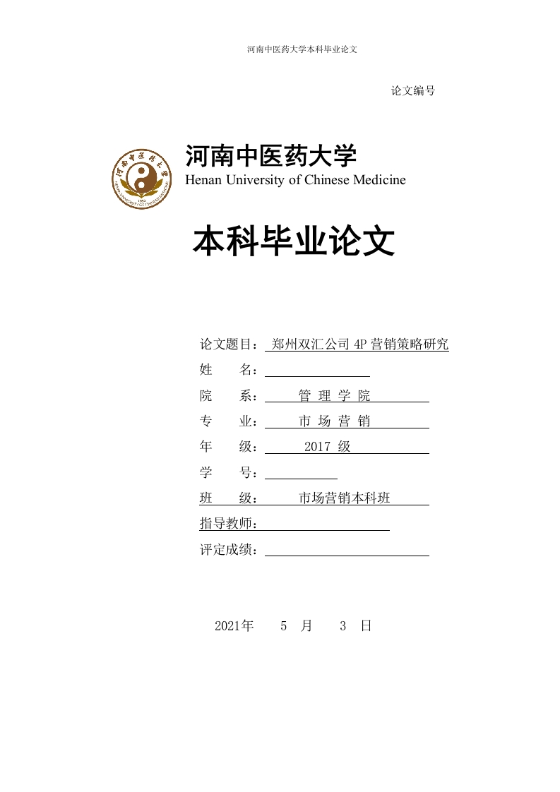 河南中医药大学本科毕业论文论文编号河南中医药大学Henan University of Chinese Medicine本科毕业论文论文题目:郑州双汇公司4P营销策略研究姓名:院系管理学院专业:市场营销年级:2017级学号:班级:市场营销本科班指导教师:评定成绩:2021年5月3日河南中医药大学本料毕业论文毕业设计(论文)诚信声明书本人声明:我将提交的毕业论文(设计)《是我在指导教师指导下独立研究、写作的成果,论文中所引用他人的无论以何种方式发布的文字、研究成果,均在论文中加以说明:有关教师、同学和其他人员对本文的写作、修订提出过并为我在论文中加以采纳的意见、建议,均已在我的致谢辞中加以说明并深致谢意。论文作者(签字)时间:年月日指导教师已阅(签字)时间:年月日河南中医药大学本科毕业论文目录郑州双汇公司4p营销策略研究.I摘要.第一章绪论1.1研究背景与意义.…1.2研究思路与方法2第二章相关理论基础.2.14P理论32.2STP理论.33第三章双汇集团概况以及营销环境分析53.1公司概况53.2公司营销环境分析.3.3双汇集团SW0T分析…6第四章双汇集团4P营销策略现状84.1产品策略现状4.2价格策略现状94.3渠道策略现状…4.4促销策略现状…第五章4P营销策略应对措施145.1产品策略应对措施.145.2价格策略应对措施…145.3渠道策略应对措施145.4促销策略应对措施15第六章双汇集团4P营销策略保障措施。166.1先进的技术工艺和设备确保生产高质量的产品166.2管理和人才优势…第七章结论与展望主要参考文献及资料.…18
