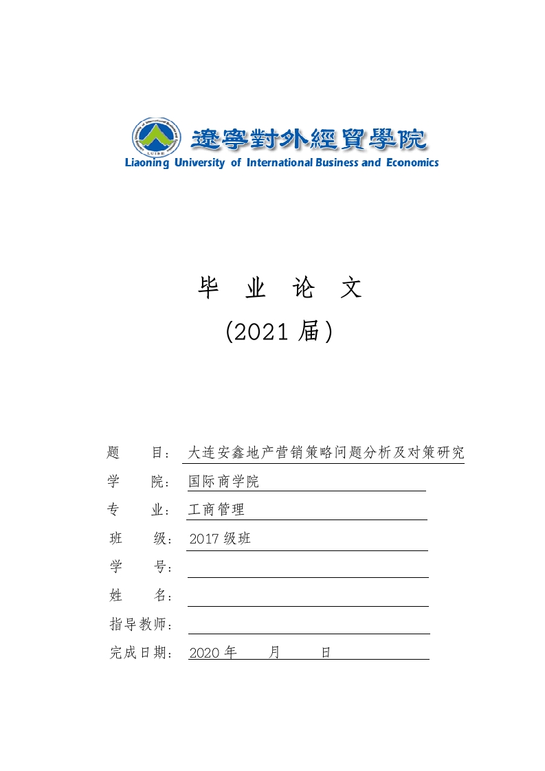人遼寧對外經貿學院Liaoning University of International Business and Economics毕业论文(2021届)目:大连安鑫地产营销策略问题分析及对策研究学院:国际商学院专业:工商管理班级:2017级班学号:姓名:指导教师:完成日期:2020年月日辽宁对外经贸学院毕业论文毕业论文诚信声明书本人声明:我将提交的毕业论文《大连安鑫地产营销策略问题分析及对策研究》是我在指导教师指导下独立研究、写作的成果,论文中所引用他人的无论以何种方式发布的文字、研究成果,均在论文中加以说明;有关教师、同学和其他人员对本文的写作、修订提出过并为我在论文中加以采纳的意见、建议,均已在我的致谢辞中加以说明并深致谢意。论文作者:(签字)时间:年月日指导教师:(签字)时间:年月日毕业论文版权使用授权书本毕业论文《大连安鑫地产营销策略问题分析及对策研究》是本人在校期间所完成学业的组成部分,是在辽宁对外经贸学院教师的指导下完成的,因此,本人特授权对辽宁对外经贸学院可将本毕业论文的全部或部分内容编入有关书籍、数据库保存,可采用复制、印刷、网页制作等方式将论文文本和经过编辑、批注等处理的论文文本提供给读者查阅、参考,可向有关学术部门和国家有关教育主管部门呈送复印件和电子文档。本毕业论文无论做何种处理,必须尊重本人的著作权,署明本人姓名。论文作者:(签字)时间:年月日指导教师:(签字)时间:年月日目录中文摘要(关键词)英文摘要(关镀词)前言…