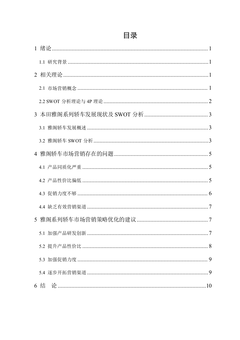 目录11.1研究背景2相关理论,2】市场营销概念…2.2SWOT分析理论与4P理论..23本田雅阁系列轿车发展现状及SWOT分析33.1雅阁轿车发展概述33.2雅阁轿车SWOT分析.…34雅阁轿车市场营销存在的问题4.1产品同质化严重…4.2产品性价比偏低.4.3促销力度不够.4.4缺乏有效营销渠道…>5雅阁系列轿车市场营销策略优化的建议75.1加强产品研发创新.…5.2提升产品性价比.…85.3加强促销力度5.4逐步开拓营销渠道96结论广州本田雅阁系列轿车市场营销策略优化黄康武摘要:中国经济已经保持了近40年的持续高速发展,特别是近十年,虽然发展速度有所下降,但经济总量不断增加且仍然有较高的稳定发展速度。中国人民在这个环境中,生活水平越来越高物质生活越来越丰富,同时消费能力和对生活品质的要求也在不断提高。随着消费能力提高和对生活品质追求的提高,对家用汽车的需求也在不断增长。中国人口众多,世界各国的世界品牌瞄准了中国这个无限的市场,纷纷入驻中国。本田雅阁轿车也发现了中国市场的潜力,近几年,中国的中高端汽车市场竞争越来越激烈,本田雅阁轿车的品牌竞争力、销售业绩和市场占有率等都有所下降,因此就有必要对它的市场营销现状和问题进行深入分析,并找出最优的解决方案。本文以本田雅阁轿车作为具体研究对象,利用SWOT分析法和4P分析,对本田雅阁系列轿车的营销情况进行分析,并在此基础上找到本田雅阁轿车市场营销的不足,继而提出优化建议。Marketing Strategy Optimization of GACHonda Accord Series SedanByHuang KangwuApril,2020Abstract:China's economy has maintained sustained and rapid development for nearly 40years,especially in the past ten years.Although the rate of development has declined,thetotal economic volume has continued to increase and still has a high and stabledevelopment rate.In this environment,the Chinese people's living standards are gettinghigher and higher,and their material lives are becoming more and more abundant.At thesame time,their consumption power and quality of life are constantly increasing.With theincrease of income level and the improvement of quality of life,the demand of Chinesepeople for household cars is also increasing.China has a large population,and worldbrands from all over the world have aimed at China,an unlimited market,and have settledin China.Honda Accord sedan has also discovered the potential of the Chinese market.Inrecent years,China's mid-to-high-end automobile market has become increasinglycompetitive.Honda Accord sedan's brand competitiveness,sales performance and marketshare have all declined.It is necessary to conduct an in-depth analysis of its marketingstatus and problems,and find the optimal solution.This article takes the Honda Accordsedan as a specific research object,uses SWOT analysis and 4P analysis to analyze themarketing situation of the Honda Accord sedan,and based on this,finds the lack ofmarketing of the Honda Accord sedan,and then proposes optimization suggestions.Keywords:Honda;marketing strategy;SWOT analysis
