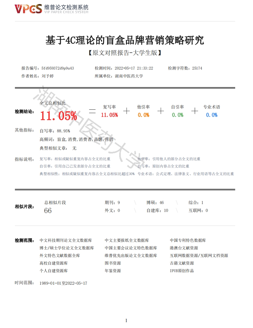 维普论文检测系统VIP PAPER CHECK SYSTEM基于4C理论的盲盒品牌营销策略研究【原文对照报告-大学生版】报告编号:5fd959372d9p9u43检测时间:2022-05-1721:33:22检测字符数:25174作者姓名:刘子婷所属单位:湖南中医药大学全文总相似比复写率他引率自引率专业术语检测结论:11.05%11.05%0.0%0.0%0.0%其他指标:自写率:88.95%高频词:言盒,消费,消费者,品牌,营销典型相似文章:无指标说明:复写率:相似或疑似重复内容占全文的比重引用他人的部分占全文的比重自引率:引用自己已发表部分占全文的比重自写率:原创内容占全文的比重典型相似性:相似或疑似重复内容占全文总相似比超过30%专业术语:公式定理、法律条文、行业用语等占全文的比重总相似片段期刊:9博硕:46综合:1相似片段:66外文:0自建库:10互联网:0检测范围:中文科技期刊论文全文数据库中文主要报纸全文数据库中国专利特色数据库博士/硕士学位论文全文数据库中国主要会议论文特色数据库港澳台文献资源外文特色文献数据全库维普优先出版论文全文数据库互联网数据资源/互联网文档资源高校自建资源库图书资源古籍文献资源个人自建资源库年鉴资源IPUB原创作品时间范围:1989-01-01至2022-05-17维普论文检测系统VIP PAPER CHECK SYSTEM原文对照颜色标注说明:■自写片段■复写片段(相似或疑似重复)口引用片段(引用)■专业术语(公式定理、法律条文、行业用语等)湖南中医药大学毕业论文学号201801060212姓名刘予婷专业市场营销专业所在学院人文与管理学院指导老师刘平良二零二二年五月二十八日药大学题目:基于4C理论的盲盒品牌营销策略研究学位论文作者声明本人郑重声明:所呈交的学位论文是本人在指导老师的指导下独立进行研究所取得的研究成果。除了文中特别加以标注引用的内容外,本论文不包括任何其他个人或集体已经发表或撰写的成果作品。本人完全了解有关保障、使用学位论文的规定,同意学校保留并向有关学位论文管理机构送交论文的复印件和电子版。同意省级优秀学位论文评选机构将本学位论文通过影印、缩印、扫描等方式进行保存、摘编或汇编:同意本论文被编入有关数据库进行检索和查阅。本学位论文内容不涉及国家机密。论文题目:作者单位:湖南中医药大学学院级专业作者签名:年月日摘要近几年来,随着人们经济实力的提升和消费水平的升级,物质高度的丰富,盲盒的营销方式也被各类商家运用,不同类型的盲盒产品层出不穷,与不同的产品出现了不同程度的结合,掀起了一股“盲盒热”,这种风潮不亚于年轻人“炒鞋”“炒裙子”的热度。“言盒+”的营销模式催生了如考古盲盒、文具盲盒、美妆盲盒、零食盲盒等,虽然言盒不再局限于与玩具结合,但是言盒品牌里玩具类盲盒产品还是占了大头,中国专门的盲盒品牌被人们所熟知,如盲盒品牌PoP MART(泡泡玛特)开创了“中国盲盒第一股”,不断制造出了爆款产品,使盲盒营销不断风靡。随后,不同类型具有不同特点的其他新生盲盒品牌也相继出现。本文通过查阅以及整合大量文献资料,结合问卷调查方法以及数据分析,在对当今盲盒大市场以及几大盲盒品牌营销策略及其现状,结合市场营销相关理论,分析出不同盲盒品牌营销效果与消费者之间的关联,同时,作为年轻消费群体中的一员,同时作为市场营销专业的一名学生,所以笔者基于4C营销理论去研究盲盒品牌的营销策略,更了解当今的消费者,也能够在了解不同品牌现有营销策略之下给他们提供良性持续发展的思路,给予一些针对性2维普论文检测系统VIP PAPER CHECK SYSTEM意见。论文的研究成果是对4c理论的在盲盒市场上的应用和具体化,能够给盲盒相关营销研究增添一些色彩,笔者经洞察市场发展动态和分析调查成果,认为对未来的盲盒进一步发展具有指导性意义和实践价值。关键词:言盒品牌:4C理论:营销策略AbstractIn recent years,with the improve of people's economic strength and the upgrading of consumptionlevel,the rich material height,blind box of marketing has been all kinds of businesses use,different types of blind box products emerge in endlessly,and the combination of different productsappeared different degree,open a wave "blind box hot",a trend as young people "Fried"shoe "Friedskirt"."Blind box +marketing model has given rise to such as archaeological blind box,stationeryblind box,beauty makeup blind box,snack foods,such as blind box while blind box is no longerconfined to combine with the toy,but blind box brand toys in blind box products still accounted fora big head,Chinese special blind box brand is well known,such as blind box brand PoP MART (bubbleof matt)created the "China blind box of the first",Continuously produced a popular product,sothat blind box marketing is constantly popular.Subsequently,different types of other new blind boxbrands with different characteristics have also emerged.In this paper,through consulting and integration of a large number of literature material,questionnaire survey method and data analysis,in today's blind box big markets,as well as severalbig blind box brand marketing strategy and its status quo,combined with marketing related theory,analysis the different blind box of brand marketing effect and the link between the consumer,at thesame time,as a member of the young consumer groups,At the same time as a marketing professional astudent,but as a consumer can't enough reason,able to withstand the charm of various marketingmethods,so the author based on 4 c marketing theory to study the blind box of brand marketingstrategy,