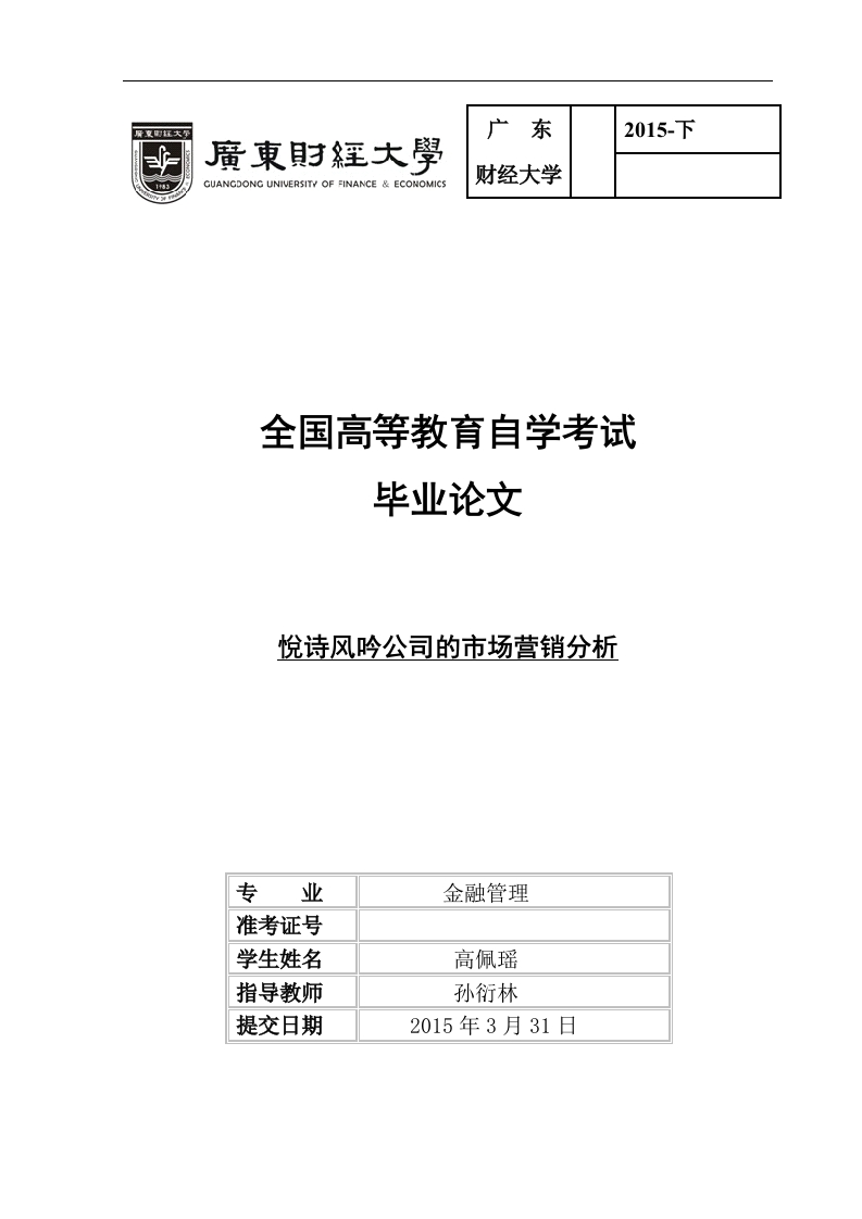 广东2015-下GUANGDONG UNIVERSITY OF FINANCE ECONOMICS财经大学全国高等教育自学考试毕业论文悅诗风吟公司的市场营销分析专业金融管理准考证号学生姓名高佩瑶指导教师孙衍林提交日期2015年3月31日毕业论文(设计)成绩评定表毕业论文(设计)指导教师评语及成绩成绩指导教师签名年月日毕业论文(设计)复评教师评语及成绩成绩复评教师签名年月日毕业论文(设计)答辩评语及成绩成绩答辩委员会主席签名年月日毕业论文(设计)总成绩院(系)负责人签名年月内容摘要本文首先对中国化妆品市场营销状况和爱莱莉太平洋公司的情况作了一个介绍,然后对悦诗风吟在中国所面临的行业环境与竞争结构进行了简要描述。其次通过资料收集与实地考察的办法结合营销策略的理论知识对悦诗风吟在中国市场的营销市场与品牌策略作了简单介绍与分析,从而提出一套较为适合悦诗风吟化妆品品牌进行制度创新和改进经营管理状况的对策措施。论文重点在于结合悦诗风吟化妆品品牌在中国的销售的案例分析,研究悦诗风吟品牌在经营管理体制中存在的缺陷,针对这些缺陷提出具体的改进措施,以便其适应市场、社会的发展和需求。关键词:悦诗风吟,市场营销,化妆品市场现状