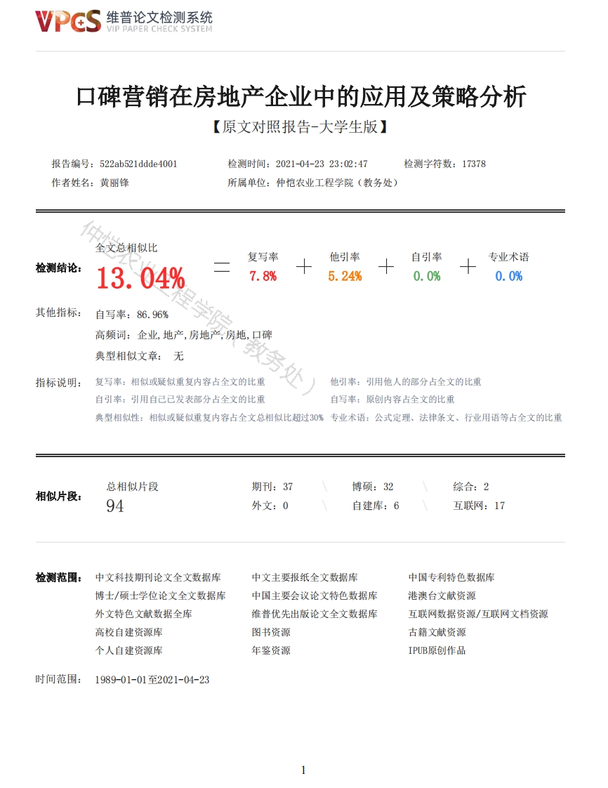 维普论文检测系统/IP PAPER CHECK SYSTEM口碑营销在房地产企业中的应用及策略分析【原文对照报告-大学生版】报告编号:522ab521ddde4001检测时间:2021-04-2323:02:47检测字符数:17378作者姓名:黄丽锋所属单位:仲恺农业工程学院(教务处)全文总相似比复写率他引率自引率专业术语检测结论:13.04%7.8%5.24%0.0%0.0%其他指标:自写率:86.96%高频词:企业,地产,房地产,房地,口碑典型相似文章:无指标说明:复写率:相似或疑似重复内容占全文的比重他引率:引用他人的部分占全文的比重自引率:引用自己已发表部分占全文的比重自写率:原创内容占全文的比重典型相似性:相似或疑似重复内容占全文总相似比超过30%专业术语:公式定理、法律条文、行业用语等占全文的比重总相似片段期刊:37博硕:32综合:2相似片段:94外文:0自建库:6互联网:17检测范围:中文科技期刊论文全文数据库中文主要报纸全文数据库中国专利特色数据库博士/硕士学位论文全文数据库中国主要会议论文特色数据库港澳台文献资源外文特色文献数据全库维普优先出版论文全文数据库互联网数据资源/互联网文档资源高校自建资源库图书资源古籍文献资源个人自建资源库年鉴资源IPUB原创作品时间范围:1989-01-01至2021-04-23维普论文检测系统VIP PAPER CHECK SYSTEM原文对照颜色标注说明:■自写片段■复写片段(相似或疑似重复)口引用片段(引用)■专业术语(公式定理、法律条文、行业用语等)仲恺农业工程学院毕业论文口碑营销在房地产企业中的应用及策略分姓名黄丽锋院(系)管理学院专业班级市场营销171班学号201710934114指导教师金树松(校外)郭欣职称/职务经济师讲师论文答辩日期2021年XX月XX日仲恺农业工程学院教务处制The application and strategy analysis of word-of-mouth marketing in real estate enterprisesHuang LifengCollege of ManagementZhongkai University of Agriculture and EngineeringGuangzhou,ChinaSupervisor:Economist Jin Shusong(Extramural Tutor)Lecturer.Guo Xin学生承诺书本人郑重承诺:所呈交的毕业论文是本人在导师的指导下独立进行研究所取得的成果。除了文中已用特别标志加以标记的引述内容之外,本论文不含有任何其他个人或集体已经发表或撰写的研究成果。对本文研究做出过重要贡献的个人和集体,均已在文中以明确的方式标明。若在毕业文集的各项检查、评比中被发现有抄袭、剽窃或其他的违规行为,本人愿按学校有关规定接受处理,并承担相应的法律责任。学生(签名):年月日摘要房地产作为我国重要的经济产业,在我国快速发展中起了带头作用。近年大量楼盘不断涌入市场,供大于需,房地产价格居高不下,销售速度减慢,房地产企业的资金回笼急剧下降。曾经传统的广告策略、线下楼盘销售策略2维普论文检测系统VIP PAPER CHECK SYSTEM的效果日益下降,尤其是在消费者与企业之间的信息面失衡的情况下,研究口碑营销在房地产企业的应用及策略具有重要的意义。本文首先分析口碑营销的内涵及房地产企业开展口碑营销的必要性,其次分析房地产企业现行的口碑营销策略,指出其中存在的问题。最后,以顾客需求为导向,进行恰当的口碑营销策略优化,并根据顾客接受渠道的转变开始定制新的口碑营销策略。关键词:口碑营销传播消费者意见领袖AbstractReal estate,as an important economic industry in China,plays a leading role in the rapiddevelopment of our country.In recent years,a large number of real estate projects have beenpouring into the market,the supply exceeds the demand,the real estate price remains high,thesales speed slows down,and the capital return of real estate enterprises drops sharply.The effectof traditional advertising strategy and offline sales strategy is declining,especially in the caseof information imbalance between consumers and enterprises.It is of great significance to study theapplication and strategy of word-of-mouth marketing in real estate enterprises.This paper firstanalyzes the connotation of word-of-mouth marketing and the necessity of real estate enterprises tocarry out word-of-mouth marketing,then analyzes the current word-of-mouth marketing strategy ofreal estate enterprises,and points out the existing problems.Finally,we optimize the marketingstrategy of word-of-mouth based on customer demand,and start to customize the new marketingstrategy according to the change of customer acceptance channel.Key words:word-of-mouth marketing:spread:consumer:Opinion leaders目录1前言12理论分析22.1口碑营销的内涵2教务处)2.2房地产企业开展口碑营销的必要性分析22.2.1有利于增强消费者信任22.2.2有利于提高沟通效率22.2.3有利于挖掘潜在客户32.2.4有利于塑造忠诚度33我国房地产企业现有口碑营销策略分析33.1我国房地产企业口碑营销实施概况33.2存在问题43.2.1缺乏有效的投诉机制43.2.2不能平衡产品和服务的重要性53.2.3活动营销的转化率低53.2.4缺乏人才留存机制53.2.5沟通缺乏有效整合63.2.6缺乏意见领袖引导63.2.7缺乏危机预警系统74我国房地产企业口碑营销优化策略分析74.1建立和完善投诉机制74.2优化服务和产品全面质量管理并行84.3精心策划活动,增加消费者好感度94.4建立合理的激励体系,提高员工忠诚度104.5整合沟通,扩大品牌影响力114.6充分发挥意见领袖的舆论引导作用124.7经常性监测环境,及时发现负面口碑135结束语133