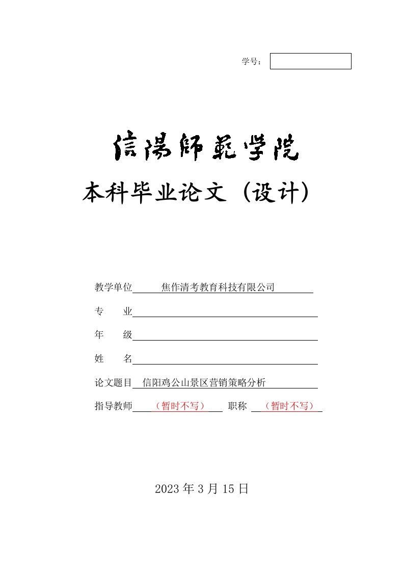 学号:本科毕业论文(设计)教学单位焦作清考教育科技有限公司专业年级姓名论文题目信阳鸡公山景区营销策略分析指导教师(暂时不写)职称(暂时不写)2023年3月15日目录摘要Abstract…一、绪论2(一)研究的背景和意义1.研究背景22.研究意义3(二)文献综述1.国外文献综述2.国内文献综述43.文献述评.…4(三)研究的内容和方法1.研究内容52.研究方法二、相关概念及理论(一)市场营销的概念5(二)4P营销理论…5三、信阳鸡公山景区营销策略现状分析.6(一)信阳鸡公山景区简介(二)信阳鸡公山景区营销策略61.产品策略方面62.价格策略方面73.渠道策略方面74.促销策略方面8(三)信阳鸡公山景区营销中存在的问题1产品不够丰富,服务体验不佳2.价格较高,定价不灵活.93.营销渠道单一,团队合作性不高94.促销投入不足.…四、信阳鸡公山景区营销策略优化建议(一)丰富产品类型1.开发景区内部活动VR内容.112.丰富娱乐设施项目12(二)实施灵活的产品定价策略1推行套票联票,创新门票方式…122.区别淡旺季、户籍地的票价机制…(三)加强渠道建设…1.发挥传统媒体结合新媒体双渠道市场营销效能132.完善自有媒体结合电商联合推广模式13(四)加强联合促销,建立促销机制…14结论5参考文献17