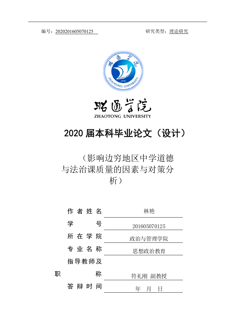 编号:2020201605070125研究类型:理论研究ZHAOTONG UNIVERSITY2020届本科毕业论文(设计)(影响边穷地区中学道德与法治课质量的因素与对策分析)作者姓名林艳学号201605070125所在学院政治与管理学院专业名称思想政治教育指导教师及职称符礼刚副教授答辩时间年月日毕业论文(设计)诚信承诺书中文题目:影响边穷地区中学道德与法治课质量的因素与对策分析外文题目:Analysis of Factors Affecting the Quality of Moral and Rule of Law Courses inMiddle Schools in Border and Poor Areas and Countermeasures姓名林艳学院政治与管理学院专业思想政治教育班级2016级思政本科班学号201605070125学生承诺我承诺在毕业论文(设计)活动中遵守学校有关规定,恪守学术规范,本人毕业论文(设计)内容除特别注明和引用外,均为本人观点,不存在剽窃、抄袭他人学术成果,伪造、篡改实验数据的情况。如有违规行为,我愿承担一切责任,接受学校的处理。学生(签名):年月日指导教师承诺我承诺在指导学生毕业论文(设计)活动中遵守学校有关规定,恪守学术道德规范,经过本人核查,该生毕业论文(设计)内容除特别注明和引用外,均为该生本人观点,不存在剽窃、抄袭他人学术成果,伪造、篡改实验数据的现象。指导教师(签名):年月日目录前言…(一)研究背景(二)研究目的和方法一、初中道德与法治课教学现状调查问卷分析..7(二)初中道德与法治课教学现状问题分析9(一)学科专业化的硬件弱(师量少)、软件(专职缺)不足...9(二)、政治教师专业素质有待提高....(四)道德与法治教学资源开发不足(五)师生关系紧张,职业道德潜藏危机...(六)反形式主义不彻底…三、提高道德与法治课质量的对策探寻.....(一)提高对道德与法治学科的重视度.·.·..13(二)提高政治教师的专业素养和执教能力..15..16(五)与时俱进,改善教学形式.....16(六)建立和睦的师生关系.·(七)反对形式主义,落实德育教育四、结语…20