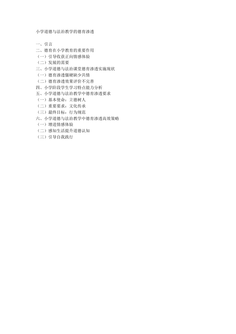 小学道德与法治教学的德育渗透一、引言二、德育在小学教育的重要作用(一)引导收获正向情感体验(二)发展的需要三、小学道德与法治课堂德育渗透实施现状(一)德育渗透僵硬缺少共情(二)德育渗透效果评价不完善四、小学阶段学生学习特点能力分析五、小学道德与法治教学中德育渗透要求(一)基本使命:立德树人(二)重要要求:文化传承(三)最终目标:行为规范六、小学道德与法治教学中德育渗透高效策略(一)增进情感体验(二)感知生活提升道德认知(三)引导自我践行