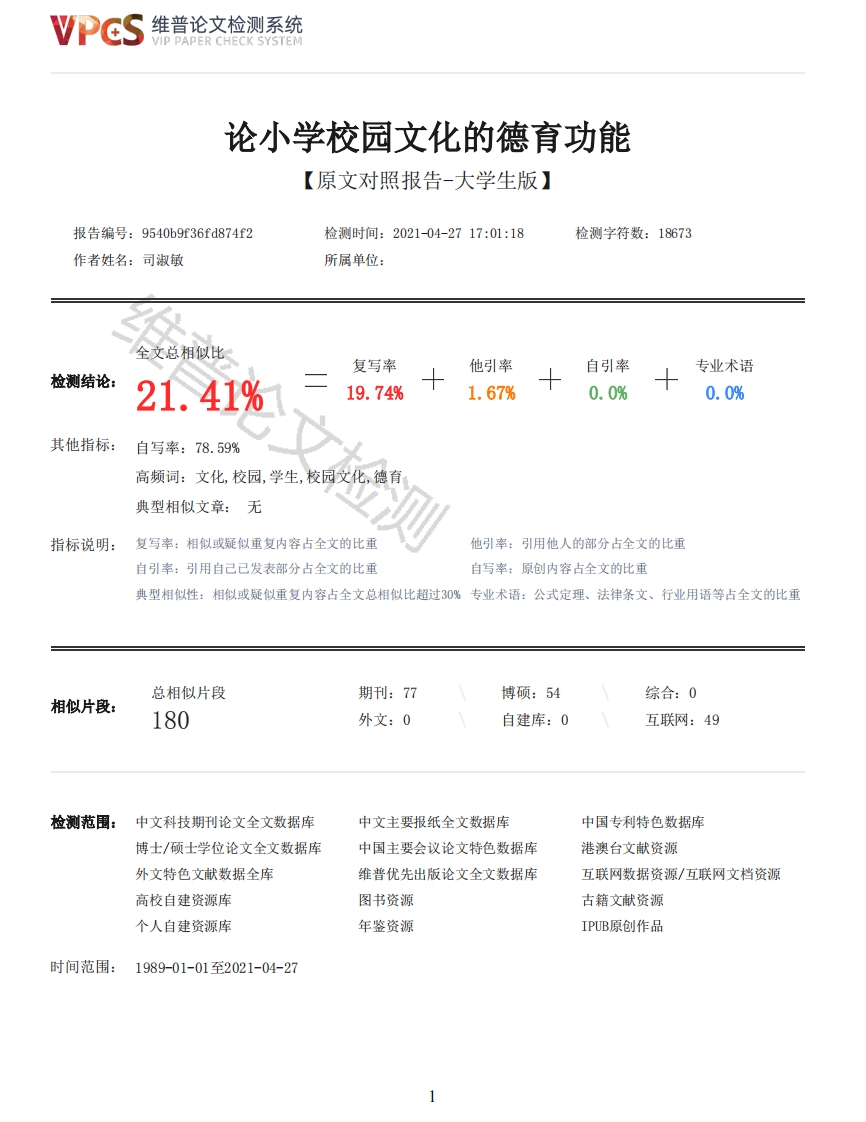 维普论文检测系统/IP PAPER CHECK SYSTEM论小学校园文化的德育功能【原文对照报告-大学生版】报告编号:9540b9f36fd874f2检测时间:2021-04-2717:01:18检测字符数:18673作者姓名:司淑敏所属单位:全文总相似比复写率他引率自引率专业术语检测结论:21.41%19.74%1.67%0.0%0.0%其他指标:自写率:78.59%高频词:文化,校园,学生,校园文化,德育典型相似文章:无指标说明:复写率:相似或疑似重复内容占全文的比重他引率:引用他人的部分占全文的比重自引率:引用自己已发表部分占全文的比重自写率:原创内容占全文的比重典型相似性:相似或疑似重复内容占全文总相似比超过30%专业术语:公式定理、法律条文、行业用语等占全文的比重总相似片段期刊:77博硕:54综合:0相似片段:180外文:0自建库:0互联网:49检测范围:中文科技期刊论文全文数据库中文主要报纸全文数据库中国专利特色数据库博士/硕士学位论文全文数据库中国主要会议论文特色数据库港澳台文献资源外文特色文献数据全库维普优先出版论文全文数据库互联网数据资源/互联网文档资源高校自建资源库图书资源古籍文献资源个人自建资源库年鉴资源IPUB原创作品时间范围:1989-01-01至2021-04-27维普论文检测系统VIP PAPER CHECK SYSTEM原文对照颜色标注说明:■自写片段■复写片段(相似或疑似重复)引用片段(引用)■专业术语(公式定理、法律条文、行业用语等)摘要德育是小学生全面发展的重要教育内容。小学校园文化,作为社会先进文化的重要组成部分。渗透在师生日常工作学习的方方面面,在培养学生思想道德修养这一方面发挥着润物细无声的效果。随着经济全球化,文化也出现了多元化的趋势。这使得我国学校德育工作面临着更多的机遇和挑战。探究小学校园文化的德育功能,对于提升德育质量培养时代新人,发挥校园文化的教育作用,提升校园环境的教育具有重要的现实意义。在此背景下,研究了小学校园文化的德育功能实现过程中的问题,针对当前校园文化德育功能发挥不充分的问题,利用文献资料法和经验总结法从小学校园文化与德育功能相关的概念、小学校园文化德育功能发挥进行探究,发现了小学校园文化德育发挥过程中存在的具体问题,分别是德育意识淡薄、德育内容滞后教育形式单调、小学校园文化环境缺失、垃圾信息监管存在空缺。探究出小学校园文化德育功能发挥过程中存在问题的原因,这些原因包括学校重视程度相对不足,多元文化的冲击,德育工作者的教育形式单调。针对小学校园文化德育功能实现过程中的问题提出了营造良好的校园文化环境、完善校园文化活动体系、加强教师自身道德建设、加强对校园文化的管理和引导几点对策。关键词:小学;校园文化:德育功能AbstractMoral education is an important part of primary school students'all-round development.Primaryschool campus culture,as an important part of social advanced culture.It permeates all aspects ofteachers and students'daily work and study,and plays a silent effect in cultivating students'Ideological and moral cultivation.With the development of economic globalization,the trend ofcultural diversity has emerged.This makes our school moral education face more opportunities andchallenges.To explore the moral education function of primary school campus culture is of greatpractical significance to improve the quality of moral education,cultivate new people of the times,give play to the educational role of campus culture,and improve the education of campusenvironment.In this context,this paper studies the problems in the process of realizing the moraleducation function of the primary school campus culture.In view of the insufficient play of themoral education function of the current campus culture,this paper uses the methods of literaturereview and experience summary to explore the related concepts of the primary school campus cultureand the moral education function of the primary school campus culture,and finds some problems inthe process of playing the moral education function of the primary school campus culture Thespecific problems are the weak awareness of moral education,the lagging content of moral education,the monotonous form of education,the lack of cultural environment in primary school campus,and thevacancy of garbage information supervision.This paper explores the reasons for the problemsexisting in the process of playing the moral education function of primary school campus culture,including the relative lack of attention of schools,the impact of multiculturalism,and themonotonous education form of moral educators.In view of the problems in the process of realizing2维普论文检测系统VIP PAPER CHECK SYSTEMthe moral education function of primary school campus culture,this paper puts forward somecountermeasures,such as creating a good campus cultural environment,improving the system of campuscultural activities,strengthening the moral construction of teachers themselves,and strengtheningthe management and guidance of campus culture.Key words:primary school;campus culture;moral education function目录一、引言5(一)研究背景5(二)研究意义5二、小学校园文化与德育功能5(一)校园文化概述51.文化62.3.校园文化构成与特点74.校园文化的作用8(二)德育功能的概述92.德育功能9三、小学校园文化德育功能发挥存在的问题和致因11(一)小学校园文化德育功能发挥存在的问题111.德育111.德育意识淡薄122.小学校园文化环境缺乏133.德育内容滞后,教育形式单调144.垃圾信息监管存在空缺14(二)小学校园文化德育功能发挥存在问题致因141.学校重视程度相对不足142.多
