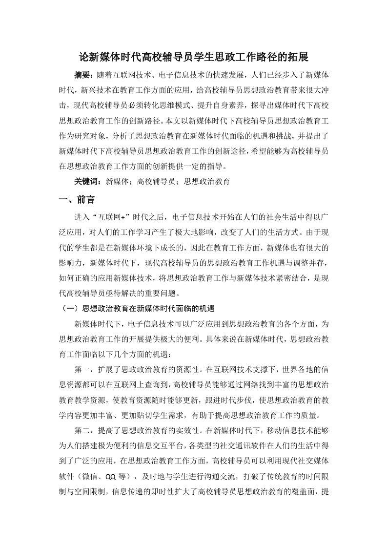 论新媒体时代高校辅导员学生思政工作路径的拓展摘要:随着互联网技术、电子信息技术的快速发展,人们已经步入了新媒体时代,新兴技术在教育工作方面的应用,给高校辅导员思想政治教育带来很大冲击,现代高校辅导员必须转化思维模式、提升自身素养,探寻出媒体时代下高校思想政治教育工作的创新路径。本文以新媒体时代下高校辅导员思想政治教育工作为研究对象,分析了思想政治教育在新媒体时代面临的机遇和挑战,并提出了新媒体时代下高校辅导员思想政治教育工作的创新途径,希望能够为高校辅导员在思想政治教育工作方面的创新提供一定的指导。关键词:新媒体:高校辅导员;思想政治教育一、前言进入“互联网+”时代之后,电子信息技术开始在人们的社会生活中得以广泛应用,对人们的工作学习产生了极大地影响,改变了人们的生活方式。由于现代的学生都是在新媒体环境下成长的,因此在教育工作方面,新媒体也有很大的影响力,新媒体时代下,现代高校辅导员的思想政治教育工作机遇与调整并存,如何正确的应用新媒体技术,将思想政治教育工作与新媒体技术紧密结合,是现代高校辅导员亟待解决的重要问题。(一)思想政治教育在新媒体时代面临的机遇新媒体时代下,电子信息技术可以广泛应用到思想政治教育的各个方面,为思想政治教育工作的开展提供极大的便利。具体来说在新媒体时代,思想政治教育工作面临以下几个方面的机遇:第一,扩展了思政政治教育的资源性。在互联网技术支撑下,世界各地的信息资源都可以在互联网上查询到,高校辅导员能够通过网络找到丰富的思想政治教育教学资源,使教育资源随时能够更新,跟进时代步伐,使思想政治教育的教学内容更加丰富、更加贴切学生需求,有助于提高思想政治教育工作的质量。第二,提高了思想政治教育的实效性。在新媒体时代下,移动信息技术能够为人们搭建极为便利的信息交互平台,各类型的社交通讯软件在人们的生活中得到了广泛的应用,在思想政治教育工作方面,高校辅导员可以利用现代社交媒体软件(微信、QQ等),及时地与学生进行沟通交流,打破了传统教育的时间限制与空间限制,信息传递的即时性扩大了高校辅导员思想政治教育的覆盖面,提高了辅导员思想政治教育的实效性。(二)思想政治教育在新媒体时代面临的挑战新媒体时代下,高校辅导员的思想政治教育工作同样面临着很多挑战,具体来说包括以下几个方面:第一,在新媒体时代下,互联网为人们提供了一个平等的信息获取和交互平台,这样学生和辅导员之间在信息获取和学习方面地位逐渐变得平等,在过去,辅导员能够掌握最新的教育教学资源,因此学生只能够从辅导员那里找寻解决问题的方法,获取自己想要的信息。但在新媒体时代下,学生能够通过网络查询到自己需要的教育信息,辅导员与学生之间变成了共同学习的状态,因此高校辅导员必须适应角色的转换,对教学方法做出有效的调整。第二,新媒体技术的快速发展使得高校辅导员必须提高自身的网络数字信息技术,只有掌握了这些技术,才能够在思想政治教育工作实践中进行新媒体技术与教学相结合的创新。此外高校辅导员还需具备新媒体思维,新媒体的开放性、平等性等,使大学生民主意识和平等观念增强,高校辅导员必须对此作出调整,在工作中需要更加注重学生的个性化发展需求。二、新媒体时代下高校辅导员思想政治教育工作的拓展途径(一)坚持以人为本,深化思想政治教育工作中的民主观念在新媒体时代,学生的独立意识增强,传统的教育观念已经难以为现代学生所接受,学生会对以往那种强制性的教育管理模式产生很强的抵触心理,因此,高校辅导员必须要在教育观念方面进行创新,坚持以人为本,重视学生的个性化发展。高校辅导员需要与学生建立起平等民主的关系,增强学生对自身的信任,以此提高自己对学生的影响力,通过隐性的引导,使思想政治教育中的观念潜移默化的传递给学生。在思想政治教育工作中坚持以人为本、贯彻民主观念,需要从多方面入手,在教育内容选择上,要集中学生的意见,充分考虑学生的需求来制定教育工作内容;教学方法上要做到因材施教,注重对学生个性化的发挥:在学生意见表达方面,要为学生打造开放、自由、平等的交流平台,让学生能够自主地表达自己的观点。总而言之,在思想政治教育工作中真正做到坚持以人为本,最根本上仍是要由高校辅导员落实的,因此高校辅导员自身必须强化民主观念,才能在工作中落实到实处。(二)运用新谋体,拓展辅导员思想政治教育的领域在新媒体时代下,辅导员的思想政治教育工作不单单局限在课堂上,在网络领域有很大的拓展空间。高校辅导员可以通过加强建设学校的网站论坛,在校园的官方网站上多发布一些思想政治教育相关的资讯内容,加强对校园网站的监管力度,引导学生在论坛上进行思想政治教育相关的有益探讨。此外,高校辅导员还可以有效利用移动信息技术,在一些社交媒体网络软件上发布思想政治教育相关的教育资讯,比如开设微信公众号、微博账户等,学生可以通过这些社交媒体网络软件获取最新的思想政治教育学习资源。高校辅导员可以组建QQ群、微信群等,给学生构建起思想政治学习探讨平台,辅导员还可以与群内的学生进行一对一的交流,来了解每名学生的