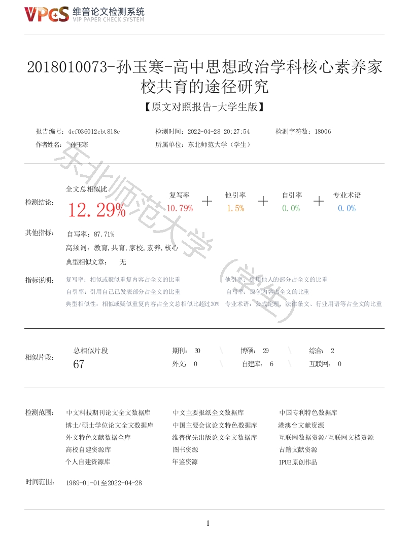 维普论文检测系统VIP PAPER CHECK SYSTEM2018010073-孙玉寒-高中思想政治学科核心素养家校共育的途径研究【原文对照报告-大学生版】报告编号:4cf036012cbt818e检测时间:2022-04-2820:27:54检测字符数:18006作者姓名:孙玉寒所属单位:东北师范大学(学生)全文总相似比他引率自引率专业术语检测结论:12.29%其他指标:自写率:87.71%范大学复写率10.79%1.5%0.0%0.0%高频词:教育,共育,家校,素养,核心典型相似文章:无指标说明:复写率:相似或疑似重复内容占全文的比重自引率:引用自己已发表部分占全文的比重典型相似性:相似或疑似重复内容占全文总相似比超过3%专业术语:公式定理,法律条文、行业用语等占全文的比重总相似片段综合:2相似片段:67外文:0自建库:6互联网:0检测范围:中文科技期刊论文全文数据库中文主要报纸全文数据库中因专利特色数据库博士/硕士学位论文全文数据库中国主要会议论文特色数据库港澳台文献资源外文特色文献数据全库维普优先出版论文全文数据库互联网数据资源/互联网文档资源高校自建资源库图书资源古籍文献资源个人自建资源库年鉴资源IPUB原创作品时间范围:198901-01至2022-04-281VPCS维普论文检测系统VIP PAPER CHECK SYSTEM原文对照颜色标注说明:自写片段■复写片段(相似或疑似重复)口引用片段(引用)■专业术语(公式定理、法律条文、行业用语等)学校代码:10200学号:2018010073本科毕业论文高中思想政治学科核心素养家校共育的策略研究Research on the strategy of home school co education of the core quality of Ideological andpolitical discipline in Senior High School学生姓名:孙玉寒指导教师:孙堂厚所在学院:政法学院所学专业:思想政治教育(公费师范)专业东北师范大学2022年4月摘要高中思想政治学科核心素养是思想政治学科落实立德树人根本任务的重要体现,在新的教育改革阶段仍有许多问题亟待解决。本文从家校共育角度探讨思想政治学科核心素养培育的新途径,并从家庭教育、学校教育、家校合作等角度阐述其必要性和重要性,主要在阅读文献、访谈调查的基础上,寻找归纳高中思想政治学科核心素养家校共育存在的问题,深入剖析高中生核心素养家校共育存在问题的原因,并有针对性地提出高中思想政治学科核心素养家校共育的具体策略,提升家校共育的效用。关键词:高中思想政治学科核心素养:家校共育:优化策略AbstractThe core quality of Ideological and political discipline in senior high school is an importantembodiment of the fundamental task of Building Morality and cultivating people.There are still many2VPGS维普论文检测系统VIP PAPER CHECK SYSTEMproblems to be solved in the new stage of educational reform.This paper attempts to explore a newway to cultivate the core literacy of Ideological and political discipline from the perspective ofhome school co education,and expounds its necessity and importance from the perspectives of familyeducation,school education and home school cooperation.On the basis of reading literature,interview and investigation,this paper analyzes the problems existing in the home school coeducation of the core literacy of Ideological and Political Science in senior high school,deeplyanalyzes the influencing factors of using home school cooperation to cultivate the core literacy ofsenior high school students,and puts forward the specific strategies of home school co education ofthe core literacy of Ideological and Political Science in senior high school.Key:Core literacy of Ideological and political discipline in Senior High School:Home school coEducation:Optimization strategy目录摘要··Abstract·(一)研究的目的与意义(二)核心概念界定·····1.思想政治学科核心素养概念的界定2.家校共育概念的界定·······(三)国内外相关研究综述····1.国内研究现状········2.国外研究现状6(四)研究思路与研究方法···2.研究方法二高中思想政治学科核心素养家校共育的必要性与重要性(一)家校社协同育人的重要环节········(二)思想政治学科核心素养培育的有力支撑·····8(三)优化家庭教育的重要途径···········…(四)缓解家校矛盾推进家校共育工作的有效途径三高中思想政治学科核心素养家校共育中存在的问题····10(一)学校与家长共育意识较低,家校共育缺乏有力支持····10(二)家校共育目的偏离,对思政学科核心素养培育重视不足·····11(三)家校职责划分不清,家校共育效果大打折扣·····················11