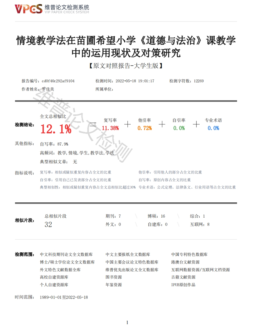 维普论文检测系统VIP PAPER CHECK SYSTEM情境教学法在苗圃希望小学《道德与法治》课教学中的运用现状及对策研究【原文对照报告-大学生版】报告编号:cd0f40c292af9104检测时间:2022-05-1819:01:17检测字符数:12269作者姓名:罗佳美所属单位:全文总相似比复写率他引率自引率专业术语检测结论:12.1%11.38%0.72%0.0%0.0%其他指标:自写率:87.9%高频词:教学,情境,学生,教学法,学法典型相似文章:无指标说明:复写率:相似或疑似重复内容占全文的比重他引率:引用他人的部分占全文的比重自引率:引用自己已发表部分占全文的比重自写率:原创内容占全文的比重典型相似性:相似或疑似重复内容占全文总相似比超过0%专业术语:公式定理、法律条文、行业用语等占全文的比重总相似片段期刊:7博硕:16综合:1相似片段:32外文:0自建库:0互联网:8检测范围:中文科技期刊论文全文数据库中文主要报纸全文数据库中国专利特色数据库博士/硕士学位论文全文数据库中国主要会议论文特色数据库港澳台文献资源外文特色文献数据全库维普优先出版论文全文数据库互联网数据资源/互联网文档资源高校自建资源库图书资源古籍文献资源个人自建资源库年鉴资源IPUB原创作品时间范围:1989-01-01至2022-05-18维普论文检测系统VIP PAPER CHECK SYSTEM原文对照颜色标注说明:■自写片段■复写片段(相似或疑似重复)■引用片段(引用)■专业术语(公式定理、法律条文、行业用语等)楚雄师范学院本科毕业论文(设计)题目:情境教学法在苗圃希望小学《道德与法治》课教学中的运用现状及对策研究系(院):马克思主义学院专业:思想政治教育学号:20181121231学生姓名:罗佳美指导教师:杨丽梅职称:论文字数:完成日期:2022年5月目录..IV关键词····IV1一、情境教学法概述(一)情境教学法的基本概念..12.情境教学法···········1(二)情境教学法运用于《道德与法治》课的重要性··1.有助于培养学生的学习兴趣··············2维普论文检测系统VIP PAPER CHECK SYSTEM2.有助于学生理解所学知识23.有助于情感态度与价值观目标的实现······························2二、情境教学法在苗圃希望小学《道德与法治》课中运用存在的问题及原因分析······2(一)情境教学法在苗圃希望小学《道德与法治》课教学中的运用现状···········22.《道德与法治》课中情境教学法的运用现状分析·······················2(二)情境教学法在苗圃希望小学《道德与法治》课教学中运用存在的问题·········41.学校对情境教学法的重视程度不够·······························42.教师对情境教学法的运用存在问题······3.学生对情境教学法的态度存在问题························(三)情境教学法在苗圃希望小学《道德与法治》课中运用存在问题的原因分析······62.教师自身专业认识与能力水平的制约···:···三、情境教学法在苗圃希望小学《道德与法治课》教学中运用的对策及建议·········7(一)学校层面·········2.学校应给教师提供更多相关培训和学习机会····1.教师要不断学习提高自身运用情境教学的能力···2.教师要善于运用多媒体技术进行教学····(三)学生层面············1.学生要转变学习态度·····2.学生要改变学习方法···四、结语··········参考文献·······附录一··附录二致谢····3