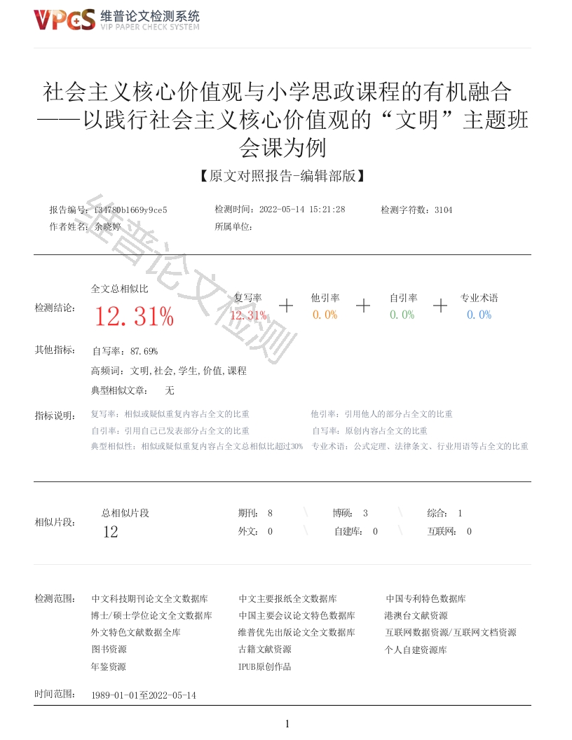 维普论文检测系统VIP PAPER CHECK SYSTEM社会主义核心价值观与小学思政课程的有机融合以践行社会主义核心价值观的“文明”主题班会课为例【原文对照报告-编辑部版】报告编号:f34780b1669y9ce5检测时间:2022-05-1415:21:28检测字符数:3101所属单位:全文总相似比复写率他引率自引率专业术语检测结论:12.31%12.31%0.0%0.0%0.0%其他指标:自写率:87.69%高频词:文明,社会,学生,价值,课程典型相似文章:无指标说明:复写率:相似或疑似重复内容占全文的比重他引率:引用他人的部分占全文的比重自引率:引用自己己发表部分占全文的比重自写率:原创内容占全文的比重典型相似性:相似或疑似重复内容占全文总相似比超过3%专业术语:公式定理、法律条文、行业用语等占全文的比重总相似片段期刊:8综合:1相似片段:12外文:0自建库:0互联网:0检测范围:中文科技期刊论文全文数据库中文主要报纸全文数据库中因专利特色数据库博士/硕士学位论文全文数据库中因主要会议论文特色数据库港澳台文献资源外文特色文献数据全库维普优先出版论文全文数据库互联网数据资源/互联网文档资源图书资源古籍文献资源个人自建资源库年鉴资源IPUB原创作品时间范围:198901-01至2022-05-14VPCS维普论文检测系统VIP PAPER CHECK SYSTEM原文对照颜色标注说明:■自写片段■复写片段(相似或疑似重复)引用片段用入■专业术语(公式定理、法律条文、行业用语等)社会主义核心价值观与小学思政课程的有机融合以践行社会主义核心价值观的“文明”主题班会课为例【摘要】社会主义核心价值观教育与小学思政课程的教育目标有相似之处,都致力于培养学生的综合能力,促进学生的全面发展。因此在小学思政课程中可与社会主义核心价值观有机融合,落实立德树人的教育目标。本文在小学思政课程里融合社会主义核心价值观中的“文明”,探索社会主义核心价值观与小学思政课程有机融合的教学方法。【关键词】文明主题班会课社会主义核心价值观小学思政课程思政课程是新时代中落实新课标立德树人根本任务的核心课程之一,思政课程包括道德与法治课与班队活动课,本文以班队活动课中的主题班会课为例阐述社会主义核心价值观与小学思政课程的有机融合。儿童、青少年的价值取向决定了整个社会未来的价值取向,小学教育可以看作是弘扬和孕育社会主义核心价值观的摇篮。社会主义核心价值观与小学思政课程的有机融合,不仅是通过思政课程促进学生个体内化社会主义核心价值观,也促进学生依照社会主义核心价值观培养出正确的行为和习惯,最终利于个人和社会发展。一、社会主义核心价值观的“大”与小学思政课程的“小”融合社会主义核心价值观很“大”,分别从国家、社会、公民个人三个层面提出社会主义核心价值观的价值目标、价值取向和价值准则。包含12个词,共24个字,每个词后面又具有很多丰富内涵,单是社会主义核心价值观中的“文明”就包含了物质文明、政治文明、精神文明、社会文明、生态文明五个系统。小学的思政课程不是束之高阁的高谈阔论,它是很接地气的,是以儿童社会生活为基础的,所以小学的思政课程从不是大的理论宣讲,而是落实在每一节课里的“小活动”。当然,社会主义核心价值观中的文明是站在国家高度所指向的价值目标,它不等同于我们在校园里常说的文明行为。因此在文明主题班会课中,要明确这个关键点,不能只讲学生校园认为的常见文明行为,否则就矮化了社会主义核心价值观中的“文明”。因此把社会主义核心价值观的“大”与小学思政课程的“小”融合就要发挥教师的教学智慧,要了解所教年级的学情和所教班级的班情后,结合社会主义核心价值观的文明内涵进行教学设计,采取丰富多样的教学形式,让思政课程活起来,使学生在学习中自觉践行社会主义核心价值观,一点一滴潜移默化对学生进行精神熏陶。二、“大文明”与“小行为”融合在中山市第二届中小学主题班会课教学比赛中一到三年级的主题是“文明”,对于6-9岁的学生讲社会主义核心价值观的“文明”不能照本宣科,生搬硬套地解释定义。笔者有幸参加镇班会课比赛的初赛,在比赛现场的班会课可以分成“由大及小”和“以小见大”两个角度进行教学设计,从现场学生的课堂反馈来看,很明显用“以小见大”的角度切入进行“文明”主题班会的课堂更贴合这个年龄段的学生认知水平。小学低年级学生社会经验少,知识及能力极其有限,但思维敏捷度高,引导学生关注身边的一个个文明“小行2维普论文检测系统VIP PAPER CHECK SYSTEM为”,认识到个人的文明行为影响着城市文明发展。老生常谈的“文明”在学校的各项班级评比和常规教育中屡见不鲜,怎样能在思政课程上吸引学生听课学习的目光呢?或许换一种呈现方式就能激起学生的学习热情与兴趣,为此笔者在文明主题班会课中设计了“我来分类扔垃圾”的触屏游戏体验,听到配音求救信息后,学生课堂上参与多种形式的活动帮助处理各种物品的求救:蒙层特效下帮桌子擦干净、移动特效下劝说同学不要践踏草地、移动特效下把蝌蚪放回大自然,在信息化的技术手段辅助下学生更直观实在地学习到要爱护环境。还通过情景模拟体验核酸检测,学生角色扮演、全班观察学习,通过动漫视频引发学生思考与讨论:生活中排好队的同时