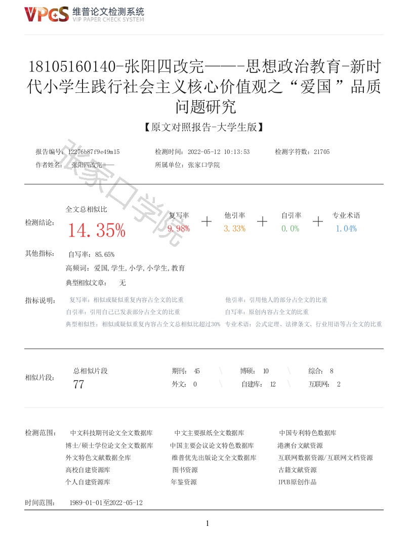 维普论文检测系统VIP PAPER CHECK SYSTEM18105160140-张阳四改完——思想政治教育-新时代小学生践行社会主义核心价值观之“爱国”品质问题研究【原文对照报告-大学生版】报告编号:12276b87f9e49m15检测时间:2022-05-1210:13:53检测字符数:21705作者姓名:张阳四改完所属单位:张家口学院全文总相似比学复写率他引率自引率专业术语检测结论:14.35%.98%3.33%0.0%1.04%其他指标:自写率:85.65%高频词:爱国,学生,小学,小学生,教育典型相似文章:无指标说明:复写率:相似或疑似重复内容占全文的比重他引率:引用他人的部分占全文的比重自引率:引用自己已发表部分占全文的比重自写率:原创内容占全文的此重典型相似性:相似或疑似重复内容占全文总相似比超过3%专业术语:公式定理、法律条文、行业用语等占全文的比重总相似片段博硕:10综合:8相似片段:77外文:0互联网:2检测范围:中文科技期刊论文全文数据库中文主要报纸全文数据库中因专利特色数据库博士/硕士学位论文全文数据库中国主要会议论文特色数据库港澳台文献资源外文特色文献数据全库维普优先出版论文全文数据库互联网数据资源/互联网文档资源高校自建资源库图书资源古籍文献资源个人自建资源库年鉴资源IPB原创作品时间范围:198901-01至202205-121维普论文检测系统VIP PAPER CHECK SYSTEM原文对照颜色标注说明:■自写片段■复写片段(相似或疑似重复)■引用片段(引用)■专业术语(公式定理、法律涤文、行业用语等)ZHANGJIAKOU UNIVERSITY新时代小学生践行社会主义核心价值观之“爱国”品质问题研究姓名张阻学号18105160140学院文法学院专业思想政治教直指导教师张然燕二零二二年四月十八日学年设计(论文)原创性声明本人所提交的学年设计(论文)《大学生理性爱国问题研究》,是在张然燕导师的指导下,独立进行研究工作维普论文检测系统VIP PAPER CHECK SYSTEM所取得的原创性成果。除文中己经注明引用的内容外,本论文不包含任何其他个人或集体己经发表或撰写过的研究成果。对本文的研究做出重要贡献的个人和集体,均己在文中标明。本声明的法律后果由本人承担。论文作者(签名):指导教师确认(签名):年月日年月日学年设计(论文)版权使用授权书本学年设计(论文)作者完全了解张家口学院有权保留并向国家有关部门或机构送交学年设计(论文)的复印件和磁盘,允许论文被查阅和借阅。本人授权张家口学院可以将学年设计(论文)的全部或部分内容编入有关数据库进行检索,可以采用影印、缩印或其它复制手段保存、汇编学年设计(论文)。保密的学年设计(论文)在年解密后适用本授权书。论文作者(签名):指导教师(签名):年月日年月日摘要爱国是社会主义核心价值观的重要内容,是全党全社会都必须提倡遵循的精神品格,是中国人民世世代代的传家宝。中国历史悠悠千年,正是中华儿女对爱国主义的坚持、实践和传承,中华民族才能在饱经磨难的历史上一次次站起来、富起来、强起来,从而进入不可逆转的中华民族伟大复兴的新时代。爱国主义是千百年来巩固起来的对自己祖国的一种最深厚的感情,是一种高尚的情感,是人民的崇高美德。新时代对小学生的爱国素养提出了新的要求,爱国主义教育成为小学教育的重要环节,在全民弘扬爱国主义精神的背景下,小学生群体成为开展爱国主义教育的重要目标群体[21]。本研究通过归纳法、文献研究法、案例分析法和因果分析法等研究方法对新时代小学生践行社会主义核心价值观中的“爱国”品质进行探究,本次研究的主要内容是结合新时代的背景,找出现实生活及教育中,小学生在爱国方面存在的积极表现和不足之处,从多个角度分析,然后根据这些不足之处挖掘其背后的原因,最后,给出针对性的建议和策略,从而帮助小学生群体树立正确的世界观、人生观、价值观和道德观[8],培养小学生的爱国主义情怀,为将来小学生成长、成才以及为国家做贡献打下坚实的基础。关键词:新时代:小学生:爱国:教育ABSTRACTPatriotism is an important part of the socialist core values,a spiritual character that thewhole Party and society must promote and follow,and an heirloom of the Chinese people fromgeneration to generation.China has a long history for thousands of years.It is the persistence,practice and inheritance of patriotism by the Chinese people that enable the Chinese nation to standup,become rich and strong again and again in the history of suffering,so as to enter anirreversible new era of the great rejuvenation of the Chinese nation.Patriotism is one of the mostprofound feelings for one's motherland,which has been consolidated for thousands of years.It is anoble emotion and a noble virtue of the people.The new era has put forward new requirements for thepatriotic quality of primary school students.Patriotism education has become an important link inprimary school education.Under the background of carrying forward the spirit of patriotism by thewhole people,primary school students have become an important target group for patriotismeducation.This study explores the quality of patriotism"in the practice of socialist core valuesby primary school students in the new era through induction,literature research,case analysis andcausal analysis.The main content of this study is to find out the positive current situation anddeficiencies of primary school students in patriotism in real life and education in combination withthe background of the new era,and analyze them from multiple angles,Then,according to thesedeficiencies,dig deep i