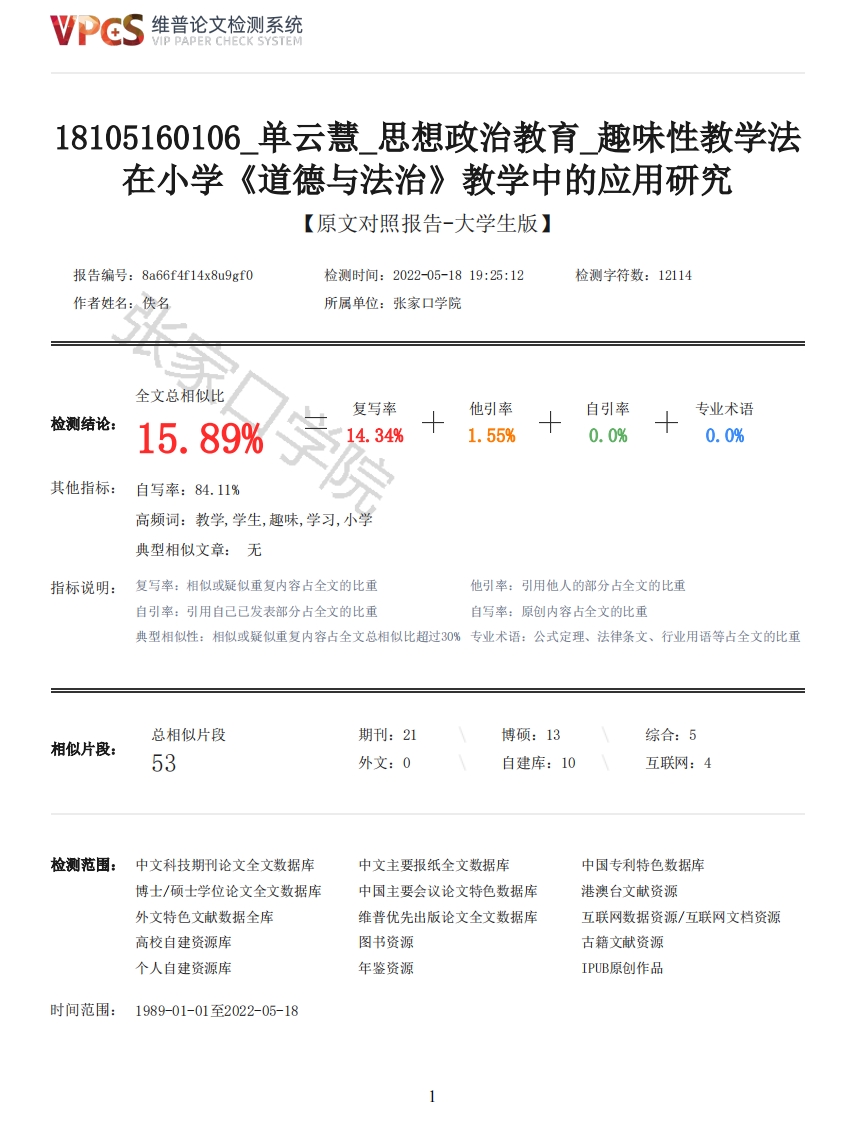 维普论文检测系统VIP PAPER CHECK SYSTEM18105160106单云慧思想政治教育趣味性教学法在小学《道德与法治》教学中的应用研究【原文对照报告-大学生版】报告编号:8a66f4f14x8u9gf0检测时间:2022-05-1819:25:12检测字符数:12114作者姓名:佚名所属单位:张家口学院全文总相似比复写率他引率自引率专业术语检测结论:15.89%14.34%1.55%0.0%0.0%其他指标:自写率:84.11%高频词:教学,学生,趣味,学习,小学典型相似文章:无指标说明:复写率:相似或疑似重复内容占全文的比重他引率:引用他人的部分占全文的比重自引率:引用自己已发表部分占全文的比重自写率:原创内容占全文的比重典型相似性:相似或疑似重复内容占全文总相似比超过0%专业术语:公式定理、法律条文、行业用语等占全文的比重总相似片段期刊:21博硕:13综合:5相似片段:53外文:0自建库:10互联网:4检测范围:中文科技期刊论文全文数据库中文主要报纸全文数据库中国专利特色数据库博士/硕士学位论文全文数据库中国主要会议论文特色数据库港澳台文献资源外文特色文献数据全库维普优先出版论文全文数据库互联网数据资源/互联网文档资源高校自建资源库图书资源古籍文献资源个人自建资源库年鉴资源IPUB原创作品时间范围:1989-01-01至2022-05-18维普论文检测系统VIP PAPER CHECK SYSTEM原文对照颜色标注说明:■自写片段■复写片段(相似或疑似重复)■引用片段(引用)■专业术语(公式定理、法律条文、行业用语等)ZHANGJIAKOU UNIVERSITY本科毕业设计(论文)趣味性教学法在小学《道德与法治》教学_一一中的应用研究一姓名单云慧学号18105160106学院文法学院专业思想政治教育指导教师冯春年月日毕业设计(论文)原创性声明本人所提交的毕业设计(论文),是在导师的指导下,独立进行研究工作所取得的原创性成果。除文中已经注明引用的内容外,本论文不包含任何其他个人或集体已经发表或撰写过的研究成果。对本文的研究做出重要贡献的个人和集体,均已在文中标明。本声明的法律后果由本人承担。论文作者(签名):指导教师确认(签名):年月日年月日毕业设计(论文)版权使用授权书本毕业设计(论文)作者完全了解张家口学院有权保留并向国家有关部门或机构送交毕业设计(论文)的复印件和磁盘,允许论文被查阅和借阅。本人授权张家口学院可以将毕业设计(论文)的全部或部分内容编入有关数据库进行检索,可以采用影印、缩印或其它复制手段保存、汇编毕业设计(论文)。保密的毕业设计(论文)在年解密后适用本授权书。论文作者(签名):指导教师(签名):年月日年月日2维普论文检测系统VIP PAPER CHECK SYSTEM摘要小学生的学习过程中兴趣是不可或缺的一部分,对学习感兴趣才能更好的提高学习效率。小学生的学习效果也受教学方法的影响,由此可见,趣味性与教学方法结合起来在小学道德与法治教学中就有了一定的研究价值。小学道德与法治教学中已经开始采用趣味性教学法,却依旧有着不足的地方,为了找到在小学道德与法治教学中应用趣味性教学法的更好的策略,本论文以小学道德与法治教学中趣味性教学方法为研究对象,运用多种研究方法,分析趣味性教学法的理论依据,研究小学道法课中如何应用趣味性教学法,从而分析如何在小学道德与法治教学各环节中应用趣味性教学法的策略。本论文通过研究分析得出趣味性教学法在小学道德与法治教学中的应用的局限来自学生、教师等多方面,对此本论文分别在小学道德与法治教学中的导入、导学以及课堂总结环节针对不同情况研究得出相应的应用策略。趣味性教学法应用要针对不同环节采用不同的方式,从而使小学道德与法治教学工作能够更好的开展,让小学生能够在轻松愉悦的氛围中,以积极的态度更好的成长。通过本论文的研究为小学道德与法治教学提供借鉴方法,为教师更好的开展教学提供帮助,让教师能够更好的使用趣味性教学法促进学生的发展。关键词:趣味性:小学道德与法治:教学法:ABSTRACTPrimary school students'interest is an indispensable part in the learning process.Only whenthey are interested in learning can they better improve their learning efficiency.The learningeffect of primary school students is also affected by teaching methods.Therefore,the combinationof interest and teaching methods has a certain research value in the teaching of morality and ruleof law in primary school.The interesting teaching method has been adopted in the teaching ofmorality and rule of law in primary school,but there are still some deficiencies.In order to finda better strategy to apply the interesting teaching method in the teaching of morality and rule oflaw in primary school,this paper takes the interesting teaching method in the teaching of moralityand rule of law in primary school as the research object,uses a variety of research methods,analyzes the theoretical basis of the interesting teaching method,and studies how to apply theinteresting teaching method in the teaching of Taoism in primary school,So as to analyze thestrategy of how to apply the interesting teaching method in the teaching of morality and rule of lawin primary school.Through research and analysis,this paper concludes that the limitations of the application ofinteresting teaching method in primary school moral and rule of law teaching come from students,teachers and other aspects.For this,this paper studies and obtains the corresponding applicationstrategies according to different situations in the introduction,guidance and classroom summary ofprimary school 
