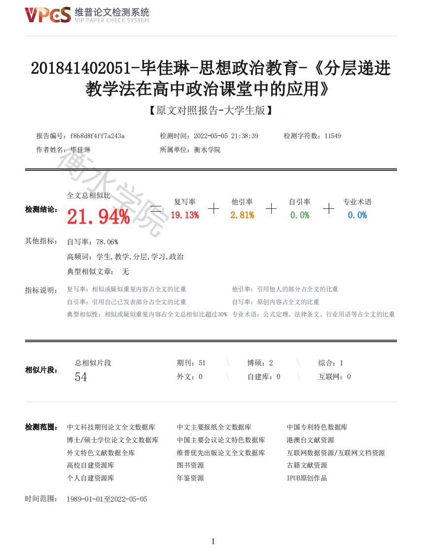维普论文检测系统VIP PAPER CHECK SYSTEM201841402051-毕佳琳-思想政治教育-《分层递进教学法在高中政治课堂中的应用》【原文对照报告-大学生版】报告编号:f8b8d8f4ff7a243a检测时间:2022-05-0521:38:39检测字符数:11549作者姓名:毕佳琳所属单位:衡水学院全文总相似比复写率他引率自引率专业术语检测结论:21.94%19.13%2.81%0.0%0.0%其他指标:自写率:78.06%高频词:学生,教学,分层,学习,政治典型相似文章:无指标说明:复写率:相似或疑似重复内容占全文的比重他引率:引用他人的部分占全文的比重自引率:引用自己已发表部分占全文的比重自写率:原创内容占全文的比重典型相似性:相似或疑似重复内容占全文总相似比超过0%专业术语:公式定理、法律条文、行业用语等占全文的比重总相似片段期刊:51博硕:2综合:1相似片段:54外文:0自建库:0互联网:0检测范围:中文科技期刊论文全文数据库中文主要报纸全文数据库中国专利特色数据库博士/硕士学位论文全文数据库中国主要会议论文特色数据库港澳台文献资源外文特色文献数据全库维普优先出版论文全文数据库互联网数据资源/互联网文档资源高校自建资源库图书资源古籍文献资源个人自建资源库年鉴资源IPUB原创作品时间范围:1989-01-01至2022-05-05维普论文检测系统VIP PAPER CHECK SYSTEM原文对照颜色标注说明:■自写片段■复写片段(相似或疑似重复)口引用片段(引用)■专业术语(公式定理、法律条文、行业用语等)学士学位论文分层递进教学法在高中政治课堂中的应用姓名毕佳琳学号201841402051院系马克思主义学院专业思想政治教育指导教师王景妍二零二二年五月五日学位论文原创性声明笔者所提交的学位论文《分层递进教学法在高中政治课堂中的应用》是在导师的指导下,独立进行研究工作所取得的原创性成果。除文中已经注明引用的内容外,本研究不包含任何其他个人或集体已经发表或撰写过的研究成果。对本文的研究做出重要贡献的个人和集体,均已在文中标明。本声明的法律后果由笔者承担。论文作者(签名):毕佳琳指导教师确认(签名):王景妍2022年5月5日2022年5月5日学位论文版权使用授权书本学位论文作者完全了解衡水学院有权保留并向国家有关部门或机构送交学位论文的复印件和磁盘,允许论文被查阅和借阅。笔者授权衡水学院可以将学位论文的全部或部分内容编入有关数据库进行检索,可以采用影印、缩印或其它复制手段保存、汇编学位论文。论文作者(签名):毕佳琳指导教师(签名):王景妍2022年5月5日2022年5月5日摘要政治课程是我国中学教育课程中非常重要的组成部分,它可以帮助学生建立基本社会观念、哲学观念,促进学生认识社会主义核心价值观。所以,政治课程应该受到较高程度的关注,特别是高中的政治课程。分层递进式教学2维普论文检测系统VIP PAPER CHECK SYSTEM是提倡素质教育以来被广泛支持的一种教学方法,主要是指根据学科特征,进行差异化教学。本研究则是以分层递进式的教学方法为核心,将其应用到高中政治课程的教学实践中去。本研究一共有四部分,第一部分是绪论,从本研究的研究的目的和意义两方面来写。第二部分是分层递进教学方法的概述,从分层递进教学方法的内含和原则两方面来写。第三部分是分层递进教学方法在高中政治课堂中应用的必要性,分析了当前高中政治课堂的现状以及分层递进教学方法应用于高中政治课堂的必要性。第四部分是分层递进教学方法的应用,从其应用过程和应用效果两方面进行阐述。关键词:分层递进教学方法:高中政治课堂:应用ABSTRACTPolitics course is a very important part of middle school education curriculum in China.It canhelp students establish basic social concepts and philosophical concepts,and promote students tounderstand socialist core values.Therefore,political curriculum should be paid more attention to,especially the political curriculum in senior high school.Hierarchical and progressive teaching isa teaching method widely supported since the promotion of quality-oriented education.It mainlyrefers to differentiated teaching according to the characteristics of subjects.This research isbased on the hierarchical and progressive teaching method,which is applied to the teaching practiceof high school politics curriculum.There are four parts in this study.The first part is theintroduction,which is written from the purpose and significance of this study.The second part isthe overview of hierarchical progressive teaching methods,written from two aspects of the contentand principles of hierarchical progressive teaching methods.The third part is the necessity ofapplying hierarchical progressive teaching method in high school politics class,analyzing thecurrent situation of high school politics class and the necessity of applying hierarchicalprogressive teaching method in high school politics class.The fourth part is the application ofhierarchical progressive teaching method,from its application process and application effect of twoaspects.Keywords:Hierarchical and progressive teaching methods:High school politics classroom:Application目录第1章绪论········11.2研究的意义·······第2章分层递进教学方法的概述···2.1分层递进教学方法的内含······第3章分层递进教学方法在高中政治课堂中应用的必要性3.1高中政治课堂的现状········第4章分层递进教学方法的应用·····4.1应用过程···············4.1.1分层掌握学生情况,明确教学目标······64.1.2分层备课,为分层授课