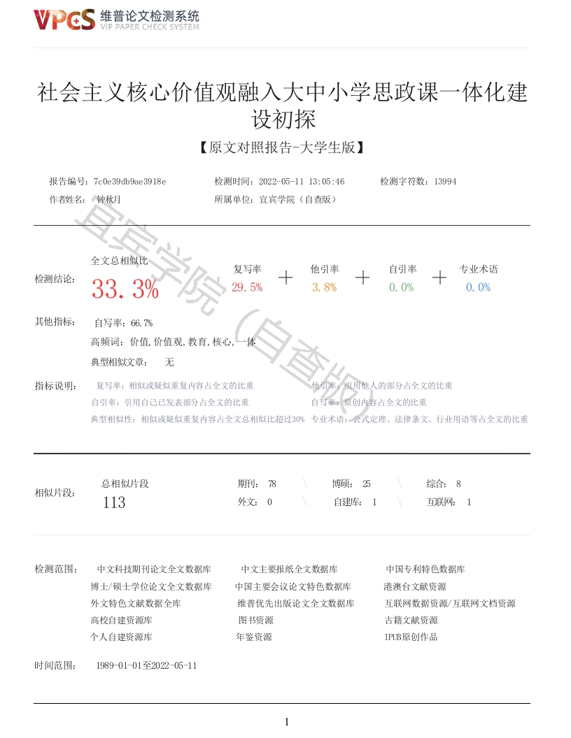 维普论文检测系统VIP PAPER CHECK SYSTEM社会主义核心价值观融入大中小学思政课一体化建设初探【原文对照报告-大学生版】报告编号:7c0e39db9ae3918e检测时间:2022-05-1113:05:46检测字符数:13994作者姓名:钟秋月所属单位:宜宾学院(自查版)检测结论:院写率他引率自引率专业术语33.3%29.5%3.8%0.0%0.0%其他指标:自写率:66.7%高频词:价值,价值观,教育,核心,典型相似文章:无指标说明:复写率:相似或疑似重复内容占全文的比重他率:别用他人的部分占全文的比重自引率:引用自己已发表部分占全文的比重自写率:原创内容占全文的此重典型相似性:相似或疑似重复内容占全文总相似比超过3%专业术语:公式定理、法律条文、行业用语等占全文的比重总相似片段综合:8相似片段:113外文:0互联网:1检测范围:中文科技期刊论文全文数据库中文主要报纸全文数据库中因专利特色数据库博士/硕士学位论文全文数据库中国主要会议论文特色数据库港澳台文献资源外文特色文献数据全库维普优先出版论文全文数据库互联网数据资源/互联网文档资源高校自建资源库图书资源古籍文献资源个人自建资源库年鉴资源IPB原创作品时间范围:198901-01至202205-111VPCS维普论文检测系统VIP PAPER CHECK SYSTEM原文对照颜色标注说明:自写片段■复写片段(相似或疑似重复)引用片段(引用)专业术语(公式定理、法律条文、行业用语等)YIBIN UNIVERSITY本科生毕业论文(设计)社会主义核心价值观融入大中小学思政课一体化建设初探学部(院)马克思主义学院专业思想政治教育学生姓名钟秋月学号180801047年级2018级指导教师1叶林职称副教授指导教师2职称2022年4月1日摘要社会主义核心价值观融入大中小学思政课一体化教学,既是在新时代进一步提升核心价值观培育效果的必然选择,也是勾画以核心价值观为圆心的“思政课同心圆”的客观要求。切实贯彻落实习总书记在学校思想政治理论课教师座谈会上的讲话精神,深入推进社会主义核心价值观融入大中小学思政课一体化建设意义重大,由于核心价值观教育的长期性和复杂性,还存在不同学段思政课教育教学的质量和效率等问题。为此要坚持一体化思维,研究体化内容,整合一体化资源,建立一体化平台,将社会主义核心价值观融入大中小学思政课一体化教学,以提升社会主义核心价值观的引领作用。关键词:社会主义核心价值观:大中小学:思政课一体化AbstractThe integration of socialist core values into ideological and political education in primary andmiddle schools is not only an inevitable choice to further enhance the effect of core valuescultivation in the new era,but also an objective requirement to sketch the "concentric circle ofideological and political education"with core values as the circle.It is of great significance to2VPGS维普论文检测系统VIP PAPER CHECK SYSTEMearnestly implement the spirit of the speech made by the General Secretary Xi at the symposium ofteachers for ideological and political theory courses at schools and further promote the integrationof socialist core values into ideological and political courses at universities,primary schools andmiddle schools.Due to the long-term nature and complexity of core values education,there are stillproblems concerning the quality and efficiency of ideological and political education and teachingin different sections.Therefore,we should insist on integrated thinking,study integrated content,integrate integrated resources,establish integrated platform,and integrate socialist core valuesinto ideological and political education in primary and secondary schools to enhance the leadingrole of socialist core values.Keywords:The core values of Chinese socialism:Primary and secondary schools:Integration ofIdeological and Political Courses目录摘要··Abstract(一)研究的背景···(二)国内外研究现状(三)选题的目的······(四)课题研究的意义·····(五)研究的内容及方法······一、社会主义核心价值观融入大中小学思政课一体化的重要性··(一)有利于培养担当民族复兴大任的时代新人(二)有利于满足各阶段学生接续性发展的需要(三)有利于推动大中小学思政课一体化建设·········二、社会主义核心价值观融入大中小学思政课一体化存在的问题·········(一)一体化思维建立不够突出·················(二)一体化内容递进不够明显····(三)一体化资源整合不够充分··········9(四)一体化平台建设不够完善············三、社会主义核心价值观融入大中小学思政课一体化建设的路径探究············9(一)坚持一体化思维是融入的先导···10(二)研究一体化内容是融入的基础···10(三)整合一体化资源是融入的重点11(四)建立一体化平台是融入的支撑···12