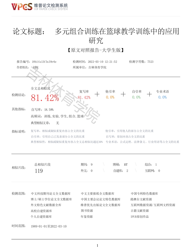 维普论文检测系统VIP PAPER CHECK SYSTEM论文标题:多元组合训练在篮球教学训练中的应用研究【原文对照报告-大学生版】报告编号:18 blfal3f3x39r6e检测时间:2022-03-1012:21:52检测字符数:7523作者姓名:刘炯所属单位:吉林体育学院全文总相似比他引率自引率专业术语检测结论:81.42%其他指标:自写率:18.58%育学院复写率81.42%0.0%0.0%0.0%高频词:训练,实验,学生,组合,篮球典型相似以文章:无指标说明:复写率:相似或疑似重复内容占全文的比重他引率:引用他人的部分占全文的比重自引率:引用自己已发表部分占全文的比重自写率:原创内容占全文的比重典型相似性:相似或疑似重复内容占全文总相似比超过3%专业术语:公式定理、法律条文、行业用语等占全文的比重总相似片段期刑:9博硕:107综合:1相似片段:119外文:0互联网:0检测范围:中文科技期刊论文全文数据库中文主要报纸全文数据库中因专利特色数据库博士/硕士学位论文全文数据库中国主要会议论文特色数据库港澳台文献资源外文特色文献数据全库维普优先出版论文全文数据库互联网数据资源/互联网文档资源高校自建资源库图书资源古籍文献资源个人自建资源库年鉴资源IPUB原创作品时间范围:198901-01至2022-03-101维普论文检测系统VIP PAPER CHECK SYSTEM原文对照颜色标注说明:自写片段■复写片段(相似或疑似重复)■引用片段(引用)■专业术语(公式定理、法律条文、行业用语等)JILIN SPORT UNIVERSITY本科毕业论文(设计)多元组合训练在篮球教学训练中的应用研究运动训练学院专业:运动训练年级/班级:2018级3班学生姓名:刘炯学号:201802010108指导教师:李婷婷2022年6月30日目录中文摘要英文摘要····2研究对象与方法2.1研究对象·····2.2研究方法3结果与分析······3.1多元组合法相关概念············3.2实验组和对照组身体素质测试比较结果与分析··2维普论文检测系统VIP PAPER CHECK SYSTEM3.3多元组合训练对篮球体能和基本技术测试的结果与分析4结论与建议4.1结论·····4.2建议·····参考文献10致谢···11摘要通过对实验组和对照组20名学生进行多元组合教学实验研究,通过测试学生身体素质、专项体能、基本技术等三个方面能力结果,多元组合训练在实验组中己经取得良好的效果,经研究发现,在实验后的学生对于蓝旗项目特点己经能记住,并确定为日后的篮球比赛中取得更好的成绩。关键词:多元组合:篮球教学,应用研究AbstractThrough the experimental study of multivariate combination teaching for 20 students in theexperimental group and the control group,and by testing the results of students'physical fitness,special physical ability and basic skills,it is found that multivariate combination training hasachieved good results in the experimental group.It is found that the students after the experimentcan remember the characteristics of the blue flag event,and it is determined that they will achievebetter results in the future basketball competition.Key words:multivariate combination:Basketball teaching:application research1前言篮球一直都是世界性的团体项目,每个国家都拥有自己的篮球国家队,篮球这种竞技项目也是具有大众化的特点,深受各年龄阶段民众的喜欢。从奥运会、世界杯、世锦赛等重大比赛中可以明显看出,一支篮球队伍只依靠技、战术优势赢得比赛胜利的情况早已不复存在,有些篮球队或者篮球运动员不能连续获得较好成绩的主要原因在于往返球的处理过程中,往往是因为专项体能的欠缺,导致运动员不能发挥应有的篮球技术,尤其是当两支篮球队的技、战术水平极其接近时,可以展现出专项体能的优势。在一节训练课中同时纳入影响运动成绩的多个因素、同时对多个机体系统进行训练的上课方式虽然对某个特定目标系统的刺激不如针对该训练目标进行单一训练的强度大,但其对于多个刺激系统的训练总和理论上来说要比单一特定训练的刺激总和大、且持续训练时间更长、总体负荷较大,同时这种综合训练课程的内容变化灵活,接受训练的运动员相比之下不易产生疲劳,内容及形式的丰富多样也会使得运动员的训练积极性有所提高,也有助于缓解运动员的神经与肌肉在训练中产生疲劳、避免承受训练的局部负荷过大甚至损伤的情况发生,从而使得训练课程能够获得事半功倍的功效。2研究对象与方法2.1研究对象选取吉林体育学院大三年级篮球专项班20人作为实验对象。2.2研究方法2.2.1文献资料法本文主要以中国知网、维普、全球学术快报等数据库中的文献作为资料来源,通过“多元组合训练”、“训练方法”、“篮球专项体能”、“体能训练”等关键词搜索相关文献,查询并引用了《学校体育学》、《运动训练学》等相关书籍,对本篇论文相关概念进行界定,为本篇论文的书写提供了充分的理论依据。2.2.2专家访谈法根据论文需要,首先根据《国家学生体质健康标准》、《球类运动篮球》、《普通高中体育与健康课程标准(2017版)》选取本次实验所需各项指标,再询问、咨询相关篮球教师、教练以及相关体育专家,确定相关测试指标。2.2.3实验法