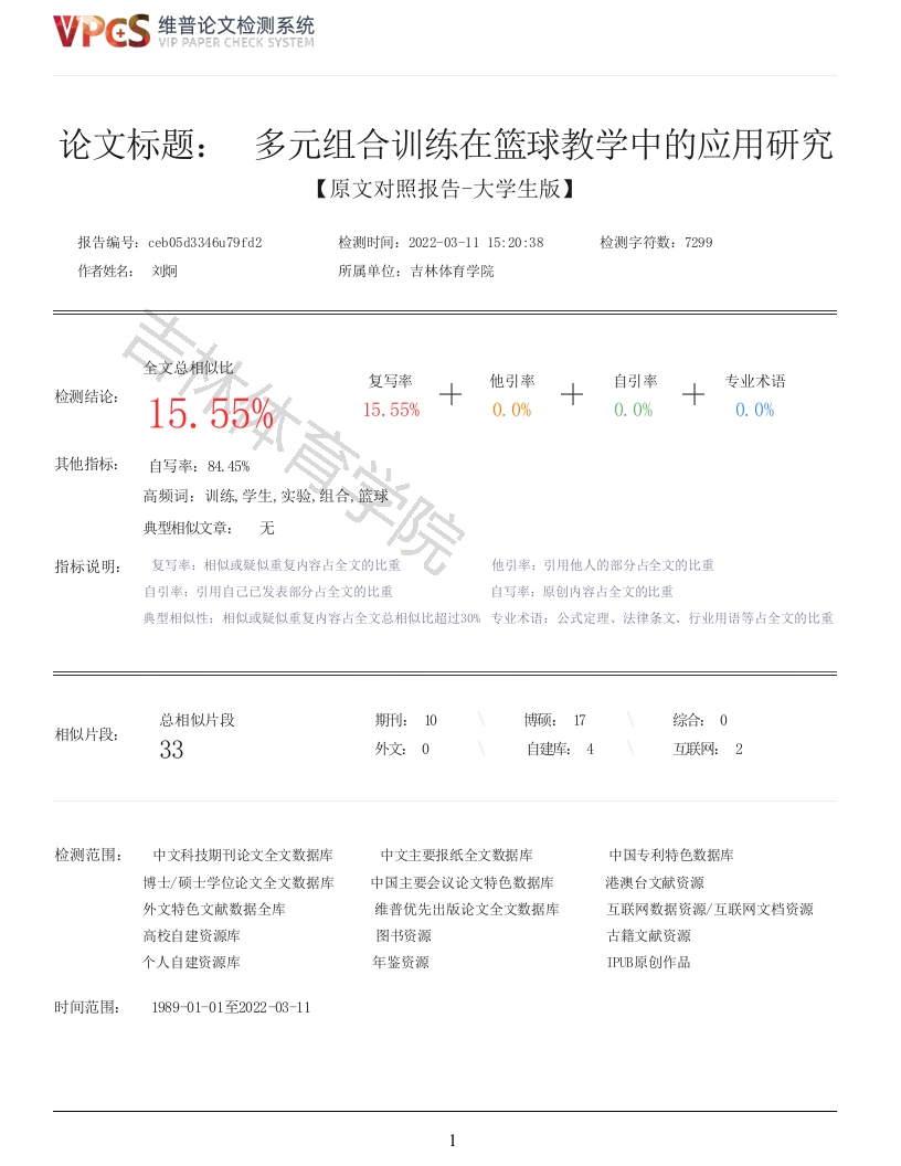 维普论文检测系统VIP PAPER CHECK SYSTEM论文标题:多元组合训练在篮球教学中的应用研究【原文对照报告-大学生版】报告编号:ceb05d3346u79fd2检测时间:2022-03-1115:20:38检测字符数:7299作者姓名:刘炯所属单位:吉林体育学院全文总相似比复写率他引率自引率专业术语检测结论:15.55%15.55%0.0%0.0%0.0%其他指标:自写率:84.45%高频词:训练,学生,实验,组合,篮球典型相似文章:无指标说明:复写率:相似或疑似重复内容占全文的比重他引率:引用他人的部分占全文的比重自引率:引用自己已发表部分占全文的比重自写率:原创内容占全文的比重典型相似性:相似或疑似重复内容占全文总相似比超过3%专业术语:公式定理、法律条文、行业用语等占全文的比重总相似片段期刑:10综合:0相似片段:33外文:0自建库:4互联网:2检测范围:中文科技期刊论文全文数据库中文主要报纸全文数据库中因专利特色数据库博士/硕士学位论文全文数据库中因主要会议论文特色数据库港澳台文献资源外文特色文献数据全库维普优先出版论文全文数据库互联网数据资源/互联网文档资源高校自建资源库图书资源古籍文献资源个人自建资源库年鉴资源IPB原创作品时间范围:198901-01至202203-111维普论文检测系统VIP PAPER CHECK SYSTEM原文对照颜色标注说明:■自写片段■复写片段(相似或疑似重复)口引用片段(引用)专业术语(公式定理、法律条文、行业用语等)吉林体JILIN SPORT UNIVERSITY本科毕业论文(设计)多元组合训练在篮球教学训练中的应用研学院/中心:学院运动训练学院专业:运动训练年级/班级:2018级3班学生姓名:刘炯学号:201802010108指导师:李婷婷2022年6月30日目录中文摘要····英文摘要2研究对象与方法2.1研究对象·····2.2研究方法····3结果与分析·····3.1多元组合法相关概念·······3.2实验组和对照组身体素质测试比较结果与分析···3.3多元组合训练对篮球体能和基本技术测试的结果与分析2维普论文检测系统VIP PAPER CHECK SYSTEM4.1结论・・4.2建议・9参考文献···10致谢····摘要通过对对照组和实验组的20名学生进行多元组合教学实验研究,通过对学生身体素质、专项体能和基础技术的测试结果,多元组合训练在实验组中己经取得良好的效果,经研究发现,在实验后的学生对于蓝旗项目特点己经能记住,并确定为日后的篮球比赛中取得更好的成绩。关键词:多元组合:篮球教学:应用研究AbstractThrough the experimental study of multivariate combination teaching for 20 students in theexperimental group and the control group,and by testing the results of students'physical fitness,special physical ability and basic skills,it is found that multivariate combination training hasachieved good results in the experimental group.It is found that the students after the experimentcan remember the characteristics of the blue flag event,and it is determined that they will achievebetter results in the future basketball competition.Key words:multivariate combination:Basketball teaching:application research1前言篮球一直都是世界性的团体项目,每个国家都拥有自己的篮球国家队,篮球这种竞技项目也是具有大众化的特点,深受各年龄阶段民众的喜欢。在国际上的各大赛事包括奥运会、世锦赛等都能够清楚地看到,篮球队伍单单凭借技术取胜的局面己经不复存在。大部分运动员、篮球队不能取得理想成绩的原因,主要是因为在反复运球的过程中,身体素质和专项体能比较欠缺,使得篮球运动员不能发挥应有的水平。特别是,在比赛中两个篮球队伍的技术水平接近的时候,可以展现出专项体能的优势。在一节训练课中同时纳入影响运动成绩的多个因素、同时对多个机体系统进行训练的上课方式。即使针对该训练目标进行单一训练的强度比对某个特定目标系统的刺激要大,不过从理论上讲,多个刺激系统的训练总和大于单一特定训练的训练总和,而且持续训练时间较长,总负荷较大。并且,这种综合训练课程的内容变化较为灵活,与训练有素的运动员相比,很少会感觉到疲劳,由于训练课程内容和形式的丰富多样,也就提高了运动员的训练积极性。有助于缓解运动员在训练中的神经和肌肉疲劳,避免训练中局部负荷过大甚至损伤,从而使得训练课程能够获得事半功倍的功效。2研究对象与方法2.1研究对象选取吉林体育学院大三年级篮球专项班20人作为实验对象。2.2研究方法2.2.1文献资料法本文在百度、中国知网、图书馆等查阅有关体育运动、篮球运动、多元组合训练法的大量文献,根据研究所需要的资料进行整理、总结,为本文的撰写莫定理论基础。2.2.2专家访谈法确定好测验的指标后,对篮球教练或相关体育专家进行访谈,目的是为了确定相关测试指标。2.2.3实验法在实验开始前,对实验对象的身体素质、专项体能和体型指标进行测试。之后,依据每个学生的测试结果,并结合学生个人的训练特点、运动水平、训练项目的要求等,合理、科学的安排并调整训练内容。实验内容包括:学生的体型(如身高、体重)、身体素质数据(肺活量、立定跳远、坐位体前屈)、专项体能(1分钟立卧撑、助跑摸高、10×15m折返跑、左右移动往返跑),篮球基本技术(传球、投球、带球速度),实验结束后分析各组之间的差异。3结果与分析