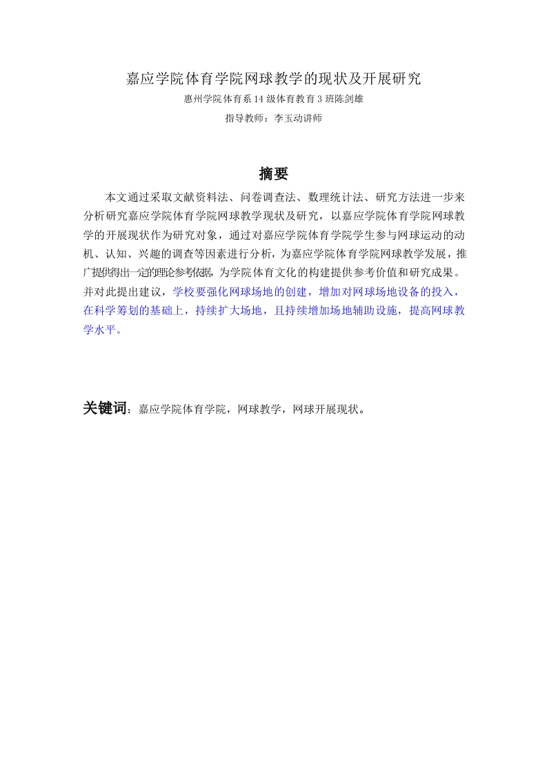 嘉应学院体育学院网球教学的现状及开展研究惠州学院体育系14级体育教育3班陈剑雄指导教师:李玉动讲师摘要本文通过采取文献资料法、问卷调查法、数理统计法、研究方法进一步来分析研究嘉应学院体育学院网球教学现状及研究,以嘉应学院体育学院网球教学的开展现状作为研究对象,通过对嘉应学院体育学院学生参与网球运动的动机、认知、兴趣的调查等因素进行分析,为嘉应学院体育学院网球教学发展,推广提供得出一定的理论参考依据,为学院体育文化的构建提供参考价值和研究成果。并对此提出建议,学校要强化网球场地的创建,增加对网球场地设备的投入,在科学筹划的基础上,持续扩大场地,且持续增加场地辅助设施,提高网球教学水平。关键词:嘉应学院体育学院,网球教学,网球开展现状。The present situation and research of tennisteaching in college of physical education of jiyingcollege.Huizhou college sports department,class 14,education 3,Chen jianxiong.Advisor:li yu-dong instructor.AbstractIn this paper,by adopting the literature material law,questionnaire survey method,mathematical statistics,research methods to analyze further research should be collegesports college tennis teaching and research,to jia should be the development of collegesports college tennis teaching present situation as the research object,through the fineshould college sports college tennis venue,equipment,teachers present situation,thecurriculum,teaching content analysis factors is analyzed,and the motivation of studentsto participate in sport,cognition,interest in other factors,such as survey analysis,for jiashould college sports college tennis teaching development,promotion to provide certaintheoretical reference basis,provide a reference for the construction of college sportsculture value and the research results.And put forward Suggestions to this,the schoolneed to strengthen the construction of tennis court,intensify investment in college tennisfacilities,on the premise of rational planning,to further broaden the tennis court,and asfar as possible perfect tennis auxiliary facilities,improve the quality of tennis teaching,Keywords:Jiyingcollegesportscollege,tennisteaching,tennisdevelopmentstatus.目录2研究对象与方法2.1研究对象...12.2研究方法...2.2.1文献资料法.2.2.2问卷调查法...2.2.3数理统计法.·3.1嘉应学院体育学院网球运动的场地,器材现状的分析..23.1.1嘉应学院体育学院网球场地现状3.1.2嘉应学院体育学院网球器材现状3.2嘉应学院体育学院网球运动的教学现状分析3.3嘉应学院体育学院学生参与网球运动的动机、认知、兴趣调查.·..43.5嘉应学院体育学院网球教学对策......4.1结论.4.2建议.5参考文献.76致谢8