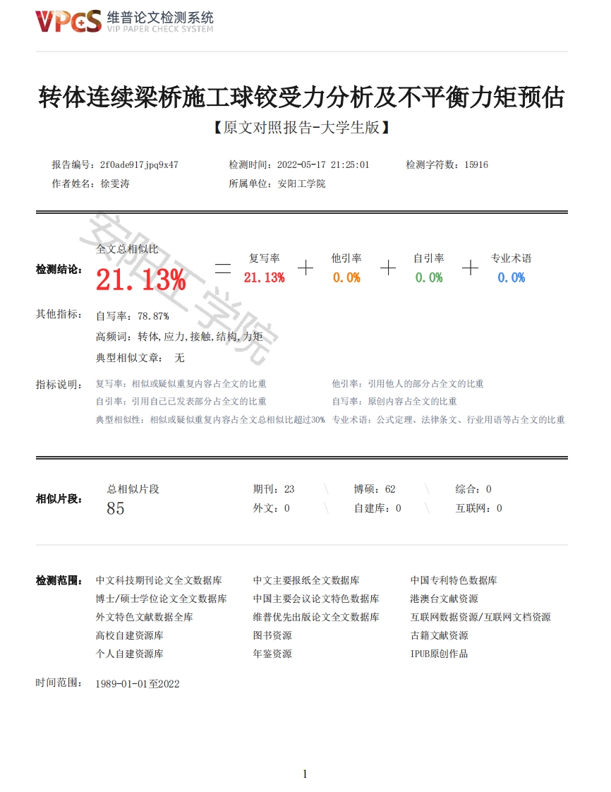 维普论文检测系统VIP PAPER CHECK SYSTEM转体连续梁桥施工球铰受力分析及不平衡力矩预估【原文对照报告-大学生版】报告编号:2f0ade917jpq9x47检测时间:2022-05-1721:25:01检测字符数:15916作者姓名:徐雯涛所属单位:安阳工学院全文总相似比复写率他引率自引率专业术语检测结论:21.13%21.13%0.0%0.0%0.0%其他指标:自写率:78.87%高频词:转体,应力,接触,结构,力矩典型相似文章:无指标说明:复写率:相似或疑似重复内容占全文的比重他引率:引用他人的部分占全文的比重自引率:引用自己已发表部分占全文的比重自写率:原创内容占全文的比重典型相似性:相似或疑似重复内容占全文总相似比超过30%专业术语:公式定理、法律条文、行业用语等占全文的比重总相似片段期刊:23博硕:62综合:0相似片段:85外文:0自建库:0互联网:0检测范围:中文科技期刊论文全文数据库中文主要报纸全文数据库中国专利特色数据库博士/硕士学位论文全文数据库中国主要会议论文特色数据库港澳台文献资源外文特色文献数据全库维普优先出版论文全文数据库互联网数据资源/互联网文档资源高校自建资源库图书资源古籍文献资源个人自建资源库年鉴资源IPUB原创作品时间范围:1989-01-01至2022维普论文检测系统VIP PAPER CHECK SYSTEM原文对照颜色标注说明:■自写片段■复写片段(相似或疑似重复)引用片段(引用)■专业术语(公式定理、法律条文、行业用语等)ANYANG INSTITUTE OF TECHNOLOGY本科毕业论文转体连续梁桥施工球铰受力分析及不平衡力矩预估Stress analysis and unbalanced moment prediction of sphericalhinge in construction of swivel continuous beam bridge学院名称:国际教育学院专业班级:土木工程(合作办学)18-2学生姓名:徐雯涛学号:18126140203指导教师姓名:刘龙指导教师职称:讲师2022年5月5日毕业设计(论文)原创性声明和使用授权说明原创性声明本人郑重承诺:所呈交的毕业设计(论文),是我个人在指导教师的指导下进行的研究工作及取得的成果。尽我所知,除文中特别加以标注和致谢的地方外,不包含其他人或组织已经发表或公布过的研究成果,也不包含我为获得安阳工学院及其它教育机构的学位或学历而使用过的材料。对本研究提供过帮助和做出过贡献的个人或集体,均已在文中作了明确的说明并表示了谢意。作者签名:指导教师签名:日期:日期:使用授权说明本人完全了解安阳工学院关于收集、保存、使用毕业设计(论文)的规定,即:按照学校要求提交毕业设计(论文)的印刷本和电子版本:学校有权保存毕业设计(论文)的印刷本和电子版,并提供目录检索与阅览服务:学校可以采用影印、缩印、数字化或其它复制手段保存论文:在不以赢利为目的前提下,学校可以公布论文的部分或全部内容。作者签名:日期:目录摘要······Abstract第1章引言12维普论文检测系统VIP PAPER CHECK SYSTEM1.1研究背景与研究意义11.2国内外转体施工研究现状・・・第2章转体球铰施工受力理论分析2.2转体结构接触面应力求解·····第3章转体球铰接触应力有限元分析·····3.1转体球铰竖向荷载作用下的非线性静力分析1120第4章转体连续梁桥施工不平衡力矩预估214.1转体桥梁不平衡力矩的测试方法··,···214.2转体结构不平衡力矩有限元模拟及与实际工程试验结果对比··2526结论······27参考文献·········28大学期间成果致谢·········转体连续梁桥施工球铰受力分析及不平衡力矩预估摘要:近年来,随着我国铁路基础设施的快速发展,桥梁在工程中的需求越来越多。在面对目前复杂的交通线路,平转法施工的技术能够极大程度的减小在工程施工时对临近交通线路的影响。本文主要以民航路跨线桥、民航东路道路桥梁工程主桥(95+162+95)m连续箱梁为背景。先对转体结构球铰接触应力分布规律进行理论分析,再利用ABAQUS建立转体结构有限元模型模拟计算转体球铰接触面应力分布规律及位移规律,并与理论分析结果进行对比,得到最符合实际应用的理论计算方法。通过ABAQUS建立转体结构有限元模型模拟球铰的不平衡力矩,并得出转体结构的不平衡力矩、摩阻力矩及偏心距,与实际称重试验结果进行对比,总结规律。本文得出的研究结果可为转体结构球铰应力分析及转体结构的不平衡力矩预估提供参考,具有重要现实意义。关键词:转体应力不平衡力矩Stress analysis and unbalanced moment prediction of spherical hinge inconstruction of swivel continuous beam bridgeAbstract:In recent years,with the rapid development of China's railway infrastructure,bridgesare in increasing demand in engineering.In the face of the current complex traffic lines,theconstruction technology of horizontal rotation method can greatly reduce the impact on the adjacenttraffic lines during the project construction.This paper mainly takes the Civil Aviation Road overpass bridge and the main bridge (95 16295)m continuous box girder of civil aviation East Road Bridge project as the background.Firstly,3