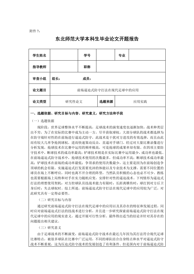 附件7:东北师范大学本科生毕业论文开题报告学生姓名学号专业指导教师职称审查小组组长:成员:论文题目前场逼迫式防守打法在现代足球中的应用论文类型研究性论文选题来源应用实践一、选题依据、研究目标与内容、研究意义,研究方法和手段(一)选题依据现阶段,世界足球整体水平不断提高,足球战术的演变速度也逐渐加快,战术种类层出不穷,为了在实际的比赛中成为主动一方,尽早获取球权,大部分球队的战术都选择为在防守端针对性的在前场进行逼迫式防守,此战术是干扰对方进攻的有效选择,而且由此而有较大几率争抢到球权,进而快速策动反击,直逼对手球门。经过对大量比赛录像进行分析发现,抢球技术在比赛中运用的频率极高,可是抢球的成果率却有限。在四项主要防守技术中,断球技术的成功率最高:铲球技术则是在实际比赛中运用最少,成功率也最低。在前场逼迫式防守战术中,抢球技术使用的次数最多,但成功率不高:断球技术成功率最高:铲球技术在前场的成功率最低:争顶求的使用次数最少,这主要是因为在前场创造争顶球的机会有限。实施逼迫式打发需要充沛的体能以及专业技术为支撑,需要不同位置的球员在场上不断呼应,同时也离不开合理的阵型,当然队员积极的心态也必不可少。教练也需要根据场上局势和对手在实力随机应变,安排针对性的逼迫战术。下列情形为逼迫式打法的理想使用契机:对方控球队员技战术能力有限时:长距离横传时:球打到对方后卫身后时:失去球权时。综上所述,前场逼迫式防守打法在现代足球中的应用较为广泛,对此研究具有一定得必要性。(二)研究目标与内容通过研究前场逼迫式防守打法在现代足球中的应用以及其存在的特征和发展过程,同时应对前场逼迫式打法的技战术进行分析,并且进一步研究探索前场逼迫式防守打法在现代足球中的应用的现实意义,通过开展可行性分析。最终得出适当的结论并针对其存在的问题提出相关建议。(三)研究意义由于足球战术的不断演变,前场逼迫式防守战术在最近几年因为其打法符合现代足球比赛特点,被很多球队在比赛中广泛运用,不同的球队结合自身特点和水平对逼迫式防守战术不断重视,这为压迫式防守战术的发展创造了有利条件。但是国内对于前场逼迫式防守战术的概念还没有达成共识:在国外则是存在对其理论研究不够深入的缺陷。所以,为了可以让逼迫式打法在比赛中得以运营和发展,就需要对现阶段足球比赛中的前场逼迫式防守战术进行分析和研究,为指导比赛提供理论支持。(四)研究方法与手段1研究方法1.1文献分析法笔者主要针对现阶段前场逼迫式防守战术的特点和问题进行研究,有针对性通过知网、图书馆等渠道查找相关资料。并通过研究和分析相关资料开拓前场逼迫式防守打法在现代足球中的应用的新思路。12案例分析法调查和研究相关案例,结合实际比赛案例分析进行前场逼迫式防守打法在现代足球中的应用研究的必要性。2研究手段以实际的比赛录像为研究对象,运用录像观察、数理统计法、实证研究发等调查方法从技战术、球员心理等方面展开调查,从而明确前场逼迫式防守打法在现代足球中的应用研究的必要性。二、论文提纲、进度安排(一)论文提纲摘要1前场逼迫式防守打法概念及特点1.1前场逼迫式防守打法的概念1.2前场逼迫式防守打法的特点2实际比赛中球队运用前场逼迫式打法特征的分析2.1运用前场逼迫式打法的必要条件22运用前场逼迫式打法的时刻2.3获得球权后的进攻3应对前场逼迫式打法的技战术分析3.1改变进攻点32改善技战术能力3.3充分利用守门员4结论和建议4.1结论4.2建议(二)进度安排2017年12月15日一12月31日:选题并完成开题报告,交由指导老师审阅2018年1月1日一2月15日:撰写论文第一稿交指导老师审阅,并进行修改。2018年2月15日一2月30日:撰写论文第二稿交指导老师审阅,并进行修改。2018年3月1日一3月15日:根据论文定稿格式要求,完成论文定稿。2018年3月16日一3月30日:将修改完的定稿打印出来交指导教师评阅.。2018年4月1日一4月15日:完成答辩提纲,准备毕业答辩。2018年4月16日一4月30日:进行答辩。三、参考文献[山王崇喜.球类运动足球M.高等教育出版社,2005.[2]全国体育院校教材委员会.现代足球M.人民教育出版社,2000.1.[3]谷明昌.现代足球运动M.北京体育大学出版社[4)廷斯邦斯博.足球比赛体系与战术打法M).人民体育出版社,2004.[5]比厄佩特僧.足球防守战术M).人民体育出版社,2004.[6]杨次榆.李秋良.世界足球防守发展演变趋势研究一一2004年欧洲杯防守情况分析[凹.成都体育学院学报,2005,04:56-59.[7)齐小平.足球逼迫式防守战术研究.成都体育学院学报,2006,0175-78.[8]唐峰.2000年欧洲足球锦标赛主要防守战术运用分析).北京体育大学学报,2001,02:264-266.[9]杨次榆.张伟.2009年欧洲足球联赛防守技术运用研究).成都体育学院学报,2010,0349-52.[10]麻雪田.王崇喜.现代足球运动高级教程M.高等教育出版社,2002.[11李凯夏.现代足球攻击性防守探讨).湖北科技体育,2005.24(4):521-523.[12]刘永林.从足球世界被防守演变特点看逼迫式防守打的产生和发展).辽宁科技体育,2015,(17):48-50.[13]徐金山.第18届世界杯足球赛前16名球队比赛攻守特征分析.上海体育学院学报,2006.06:30-63.[14]凌士银.当代欧洲足球强队在比赛中的防守行为研究).上海体育学院学报,2008