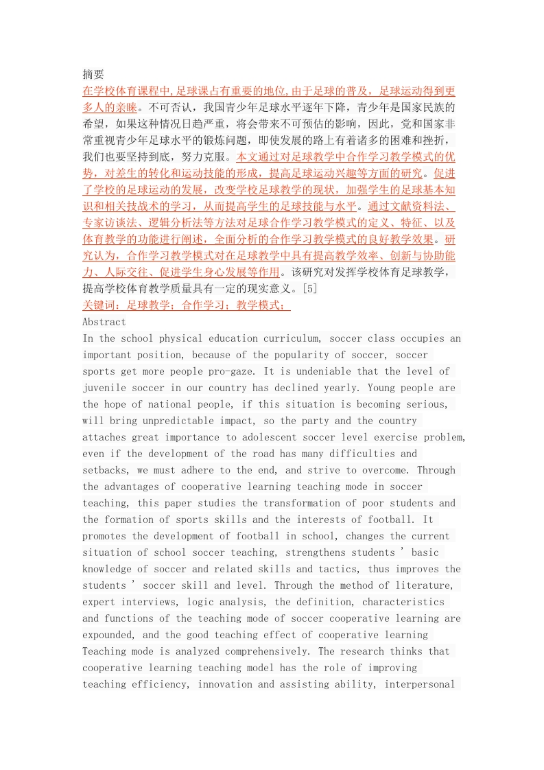 摘要在学校体育课程中,足球课占有重要的地位,由于足球的普及,足球运动得到更多人的亲睐。不可否认,我国青少年足球水平逐年下降,青少年是国家民族的希望,如果这种情况日趋严重,将会带来不可预估的影响,因此,党和国家非常重视青少年足球水平的锻炼问题,即使发展的路上有着诸多的困难和挫折,我们也要坚持到底,努力克服。本文通过对足球教学中合作学习教学模式的优势,对差生的转化和运动技能的形成,提高足球运动兴趣等方面的研究。促进了学校的足球运动的发展,改变学校足球教学的现状,加强学生的足球基本知识和相关技战术的学习,从而提高学生的足球技能与水平。通过文献资料法、专家访谈法、逻辑分析法等方法对足球合作学习教学模式的定义、特征、以及体育教学的功能进行阐述,全面分析的合作学习教学模式的良好教学效果。研究认为,合作学习教学模式对在足球教学中具有提高教学效率、创新与协助能力、人际交往、促进学生身心发展等作用。该研究对发挥学校体育足球教学,提高学校体育教学质量具有一定的现实意义。[5]关键词:足球教学:合作学习:教学模式:AbstractIn the school physical education curriculum,soccer class occupies animportant position,because of the popularity of soccer,soccersports get more people pro-gaze.It is undeniable that the level ofjuvenile soccer in our country has declined yearly.Young people arethe hope of national people,if this situation is becoming serious,will bring unpredictable impact,so the party and the countryattaches great importance to adolescent soccer level exercise problem,even if the development of the road has many difficulties andsetbacks,we must adhere to the end,and strive to overcome.Throughthe advantages of cooperative learning teaching mode in soccerteaching,this paper studies the transformation of poor students andthe formation of sports skills and the interests of football.Itpromotes the development of football in school,changes the currentsituation of school soccer teaching,strengthens students basicknowledge of soccer and related skills and tactics,thus improves thestudents soccer skill and level.Through the method of literature,expert interviews,logic analysis,the definition,characteristicsand functions of the teaching mode of soccer cooperative learning areexpounded,and the good teaching effect of cooperative learningTeaching mode is analyzed comprehensively.The research thinks thatcooperative learning teaching model has the role of improvingteaching efficiency,innovation and assisting ability,interpersonalintercourse and promoting students'physical and mental developmentin soccer teaching.This study has certain practical significance toplay the school sports soccer teaching,improve the school PEteaching quality.[5]Keywords:soccer teaching,cooperative learning;目录T0C\o"1-3”hz\u HYPERLINK\1”_Toc480982434”摘要2HYPERLINK\1”_Toc480982435”Abstract3HYPERLINK\1”ToC480982436”目录4HYPERLINK1”Toc480982437”前言5HYPERLINK\1”Toc480982438”1合作学习教学模式的概述5HYPERLINK\1”Toc480982439”1.1合作学习教学模式的定义5HYPERLINK\1”Toc480982440”1.2合作学习教学模式的特点与作用5HYPERLINK\1”ToC480982441”2合作学习教学模式的表现6HYPERLINK\1”Toc480982442”2.1合作学习教学模式的优势6HYPERLINK \1 Toc480982443"2.2足球教学中运用合作学习教学模式的原因分析6HYPERLINK \1"Toc480982444"2.3合作学习教学模式对于差生转化的优势7HYPERLINK \1 Toc480982445"3足球教学中合作学习教学模式的应用7HYPERLINK \1"Toc480982446"3.1足球教学中运用合作学习教学模式激发学生运动兴趣7HYPERLINK \1 Toc480982447"3.2足球教学中运用合作学习教学模式促进学生运动技能形成8HYPERLINK \1 Toc480982448*3.3足球教学中运用合作学习教学模式促进学校新课改的发展8HYPERLINK \1 Toc480982449"4足球教学中合作学习教学模式对足球教学的意义9HYPERLINK\1”Toc480982450”4.1加强师生互动,对学生进行因材施教9HYPERLINK\1”Toc480982451”4.2在足球的教学中,帮组学生更好的树立自信心9HYPERLINK \1 Toc480982452"4.3在足球的教学中,培养学生合作与竞争的能力9HYPERLINK \1 Toc480982453"4.4在足球的教学中,培养学生相互沟通与了解他人的能力10HYPERLINK\1”Toc480982454”4.5在足球的教学中,培养学生承受挫折和因难的能力11HYPERLINK\1”Toc480982455”5结论和建议11HYPERLINK\1”_Toc480982456”5.1结论11HYPERLINK1”Toc480982457”5.2建议12HYPERLINK\1”Toc480982458”参考文献13HYPERLINK1”Toc480982459”谢辞15前言现在是一个处处充满竞争的社会,没有适当的竞争能力可以说是无法生存,要想有竞争力就必须有自己的优势。对于教育工作者来说,培养学生的社会生存能力和沟通能力就是给学生锻炼竞争能力的机会。在足球课堂中,合作学习的教学方法让老师和学生成为了学习中的师生,课下的朋友。学生在学习中从被动变成主动,同时团结的意义也在学生心里有一定的认识。在平时的练习中,学生之间的交流和讨论比以前变的多起来了,在无形中提升了学生的沟通能力,同时也使教学质量更上一层楼。老师为了让学生更好的掌握技术动作取得较好的效果,不仅要对教材有很好的理解掌握,还要对教学方案下足功夫。一个合适的教学方法可以使教学效果有很大的提升。传统意义上的教学模式方法,存在一些老师想不到,学生个人无法完成的技术动作等问题。1合作学习教学模式的概述1.1合作学习教学模式的定义在所有教学方法里,都有好的部分和缺点,老师在教学过程中要灵活的运用教学方法,在足球教学中合作学习