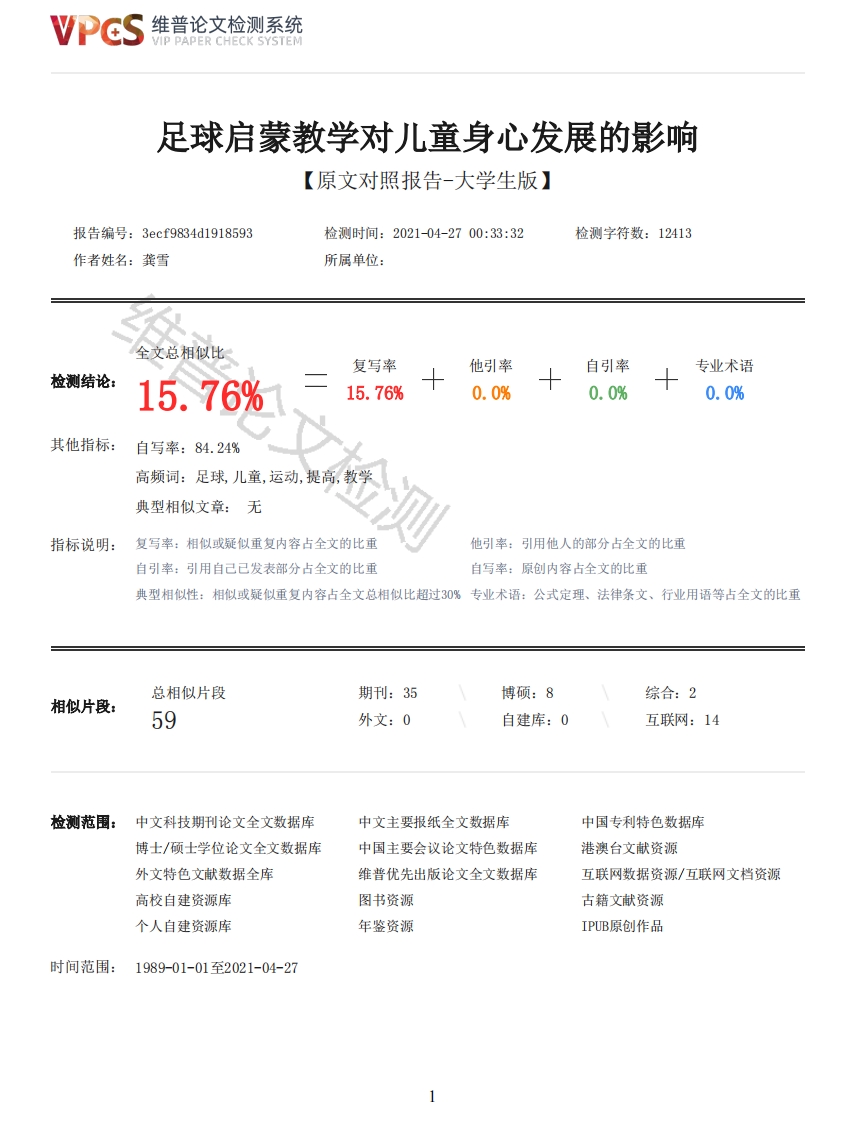 维普论文检测系统/IP PAPER CHECK SYSTEM足球启蒙教学对儿童身心发展的影响【原文对照报告-大学生版】报告编号:3ecf9834d1918593检测时间:2021-04-2700:33:32检测字符数:12413作者姓名:龚雪所属单位:全文总相似比复写率他引率自引率专业术语检测结论:15.76%15.76%0.0%0.0%0.0%其他指标:自写率:84.24%高频词:足球,儿童,运动,提高,教学典型相似文章:无指标说明:复写率:相似或疑似重复内容占全文的比重他引率:引用他人的部分占全文的比重自引率:引用自己已发表部分占全文的比重自写率:原创内容占全文的比重典型相似性:相似或疑似重复内容占全文总相似比超过30%专业术语:公式定理、法律条文、行业用语等占全文的比重总相似片段期刊:35博硕:8综合:2相似片段:59外文:0自建库:0互联网:14检测范围:中文科技期刊论文全文数据库中文主要报纸全文数据库中国专利特色数据库博士/硕士学位论文全文数据库中国主要会议论文特色数据库港澳台文献资源外文特色文献数据全库维普优先出版论文全文数据库互联网数据资源/互联网文档资源高校自建资源库图书资源古籍文献资源个人自建资源库年鉴资源IPUB原创作品时间范围:1989-01-01至2021-04-27维普论文检测系统VIP PAPER CHECK SYSTEM原文对照颜色标注说明:■自写片段■复写片段(相似或疑似重复)口引用片段(引用)■专业术语(公式定理、法律条文、行业用语等)INNER MONGOLIA NORMAL UNIVERSITY教育学院本科生毕业论文论文题目:足球启蒙教学对儿童身心发展的影响一一以成都搏胜足球俱乐部为例The Influence of Football Enlightenment Teaching on Children's Physical and MentalDevelopment--Take Chengdu Football Club as an example姓名:龚雪学号:20171106022专业:教育学班级:17级院系:教育学院指导教师:韩大林日期:2021年04月24日足球启蒙教学对儿童身心发展的影响一以成都搏胜足球俱乐部为例教育学院龚雪20171106022指导教师:韩大林老师【内容摘要】随着近几年校园足球在全国范围内的不断发展和推广,这为儿童足球启蒙教学的开展提供契机。这个阶段的儿童通过足球运动使身体、心理得到充分锻炼和提高,这将会对儿童未来身体发育与成长起到至关重要的作用。以儿童为主,开展多形式的足球活动和传播安全健康运动理念,引领更多的儿童积极主动地参与到足球运2维普论文检测系统VIP PAPER CHECK SYSTEM动中。本文以成都搏胜足球俱乐部为例,通过文献调查法、问卷调查法对其进行调查分析,真实反映足球启蒙教学对儿童身心发展影响。【关键词】足球启蒙教学,儿童,身心发展,影响The Influence of Football Enlightenment Teaching on Children 's Physical and Mental Development--Take Chengdu Football Club as an exampleGongxueAbstract:With the continuous development and promotion of campus football nationwide in recentyears,it provides an opportunity for the development of children 's football enlightenmentteaching.Children at this stage can fully exercise and improve their body and psychology throughfootball,which will play a vital role in children's future physical development and growth.Children-oriented,multi-form football activities and the dissemination of the concept of safe andhealthy sports lead more children to participate actively in football.Taking Chengdu PashengFootball Club as an example,this paper investigates and analyzes it through literature survey andquestionnaire survey,and truly reflects the influence of football enlightenment teaching onchildren 's physical and mental development.Key words:Football enlightenment teaching:Children:Physical and mental development;influence目录引言3(一)选题背景3(二)研究目的与意义31.研究目的32.研究意义3(三)基本概念41.足球启蒙教学42.身心发展4一、成都搏胜足球俱乐部概况4二、足球启蒙教学对儿童身心发展影响的调查及分析5(一)调查设计51.调查目的52.调查对象53.调查内容54.调查方案5(二)足球启蒙教学对儿童身心发展影响的调查结果61.足球启蒙教学对儿童身体的影响62.足球启蒙教学对儿童心理的影响6(三)足球启蒙教学对儿童身心发展影响的调查结果分析71.兴趣是启蒙学习中最有效的动力72.教师在儿童足球启蒙教学中的主导作用83.父母的体育态度与行为对其儿童体育参与起促进作用8三、结论与建议9(一)结论91.足球启蒙教学有利于儿童身体发展92.足球启蒙教学有利于儿童心理发展10(二)建议101.遵循儿童身心发展规律,让儿童快乐足球102.开展多形式足球活动,传播足球文化113.加强安全保障,提倡科学运动和健康运动理念113
