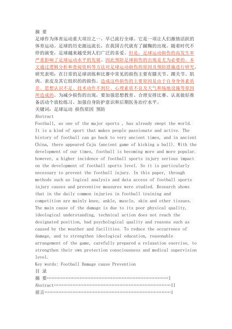 摘要足球作为体育运动重大项目之一,早已流行全球。它是一项让人们激情活跃的体育运动。足球的历史源远流长,在我国古代就有了蹴鞠的出现。随着时代不停的演变,足球越来越受到人们广泛的喜爱。但是,足球运动损伤的高发生率严重影响了足球运动水平的发展。因此预防足球损伤的出现是尤为必要的。本文通过逻辑分析和查阅资料等方法对足球运动损伤的原因及预防措施进行研究。研究表明:在日常的足球训练和比赛中常见的损伤主要有膝关节、踝关节、肌肉、表皮及其它组织的的损伤。造成这些损伤的主要原因是由于自身身体素质差、思想认识不足、技术动作不到位、心理素质不良及天气和场地设施等原因所造成的。为减少损伤的出现,要加强思想教育、合理安排比赛、认真做好准备活动个放松练习、加强自身防护意识和后期医务治疗水平。关键词:足球运动损伤原因预防AbstractFootball,as one of the major sports has already swept the world.It is a kind of sport that makes people passionate and active.Thehistory of football can go back to very ancient times,and in ancientChina,there appeared Cuju (ancient game of kicking a ball).With thedevelopment of our times,football is becoming more and more popular.however,a higher incidence of football sports injury serious impacton the development of football sports level.So it is particularlynecessary to prevent the football injury.In this paper,throughmethods such as logical analysis and data access of football sportsinjury causes and preventive measures were studied.Research showsthat in the daily common injuries in football training andcompetition are mainly knee,ankle,muscle,skin and other tissues.The main cause of the damage is due to its poor physical quality,ideological understanding,technical action does not reach thedesignated position,bad psychological quality and reasons such ascaused by the weather and facilities.To reduce the occurrence ofdamage,and to strengthen ideological education,reasonablearrangement of the game,carefully prepared a relaxation exercise,tostrengthen their own protection consciousness and medical supervisionlevel.Key words:Football Damage cause Prevention目录摘要…Abstract…II1足球运动常见的运动损伤…11.1踝关节扭伤…1.2膝关节损伤……21.3肌肉拉伤…1.4相互撞伤……31.5皮肤擦伤……31.6踢伤……31.7劳损引起的慢性损伤…42足球运动损伤的原因…42.1自身身体素质差,运动量过大…2.2思想认识不足,准备活动不充分2.3技术动作缺失或错误…2.4心理素质不良…2.5气象因素影响…2.6场地设施和服装不符合标准…62.7比赛中的不合理冲撞…73足球运动损伤的预防措施…73.1加强思想教育,了解运动损伤危害…83.2合理安排比赛和训练…73.3培养做准备活动和放松练习的习惯3.4加强自身防护意识……83.5加强医务监督和设备卫生…84结论…9前言足球作为世界上最受各界人土热爱,开展最广泛,影响力最高的体育运动项目之一,被称为“世界第一大球”和“世界第一运动”。足球运动也是普及最广泛的体育运动项且之二。从青少年到中老年,从业余爱好到专业竞技,足球运动在不同程度都受到广泛的热爱。伴随着足球运动的越来越发展,足球运动损伤的发生率也在不断增加。现在足球运动损伤已是成阻碍足球发展的主要问题。同时,如何预防足球运动损伤也是足球运动中的重要任务。因为足球损伤的发生给人们的日常生活及身心健康都会带来严重的影响。因此,探索足球运动损伤的成因,积极预防足球运动损伤的出现,比后期的治疗更为重要。1足球运动常见的运动损伤1.1膝关节损伤足球运动显著的对抗性原则发生最多的就是身体之间的相互碰撞与对抗。在此过程中,膝关节由冲撞引起的损伤也是足球常见的损伤之一。膝关节是人体结构最复杂的关节之一,由股骨(大腿骨)、胫骨(小腿骨)以及连接股四头肌和髌韧带的髌骨三块骨头组合而成。足球运动中的膝关节损伤主要是由外力碰撞所引起的骨骼损伤(髌骨骨折),其次是半月板撕裂,膝十字韧带撕断。膝关节损伤常见的症状主要是疼痛、屈伸困难。膝关节一旦发生损伤,不仅治疗困难,且恢复缓慢。1.2踝关节扭伤踝关节扭伤是足球运动最常见的损伤之一,踝关节由胫腓骨下端关节面与距骨滑车构成,故又名距骨小腿关节。踝关节是人类足部与腿部相连的部位,因此,在剧烈运动中,踝关节作为支撑每个肢体动作的关键部位所承受的身体压力是最大的。踝关节常见的损伤是由足部强力内翻所致,主要临床表现有水肿并伴有疼痛,随后可能会出现淤血。在出现踝关节损伤时,应立即停止运动,以避免增加出血量。处理方法:对踝关节进行冰敷从而阻止血管紧缩,避免进一步出血,随后应及时进行医护处理。1.3肌肉拉伤在足球运动中由于各种动作的需要,肌肉突然的收缩或者牵拉所引起的肌肉受损称为肌肉损伤。造成肌肉损伤的最主要原因是由于身体拉伤部位没有做好充分的准备活动,肌肉生理尚未达到剧烈活动所需要的状态,如果是肌纤维有部分断裂或者是完全断裂,那么大腿肌肉部位有明显的疼痛,伴随时间的推移疼痛有所好转,如果有继续运动时又会感觉疼痛明显。有可能症状还会加重。引发二次损伤。症状较轻可自行恢复,如果出现肌纤维断裂或者肌肉撕裂,应立即局部加压包扎并及时送医治疗。1.4相互撞伤在每一场比赛的开始直至结束的过程中,一直伴随队员的是身体之间的紧张对抗和争抢,以及快速地跑动。在