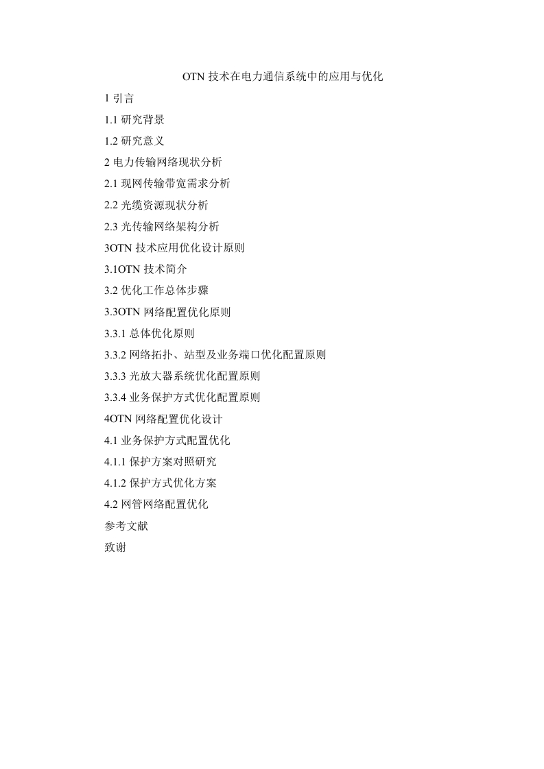 OTN技术在电力通信系统中的应用与优化1引言1.1研究背景1.2研究意义2电力传输网络现状分析2.1现网传输带宽需求分析2.2光缆资源现状分析2.3光传输网络架构分析3OTN技术应用优化设计原则3.1OTN技术简介3.2优化工作总体步骤3.3OTN网络配置优化原则3.3.1总体优化原则3.3.2网络拓扑、站型及业务端口优化配置原则3.3.3光放大器系统优化配置原则3.3.4业务保护方式优化配置原则4OTN网络配置优化设计4.1业务保护方式配置优化4.1.1保护方案对照研究4.1.2保护方式优化方案4.2网管网络配置优化参考文献致谢