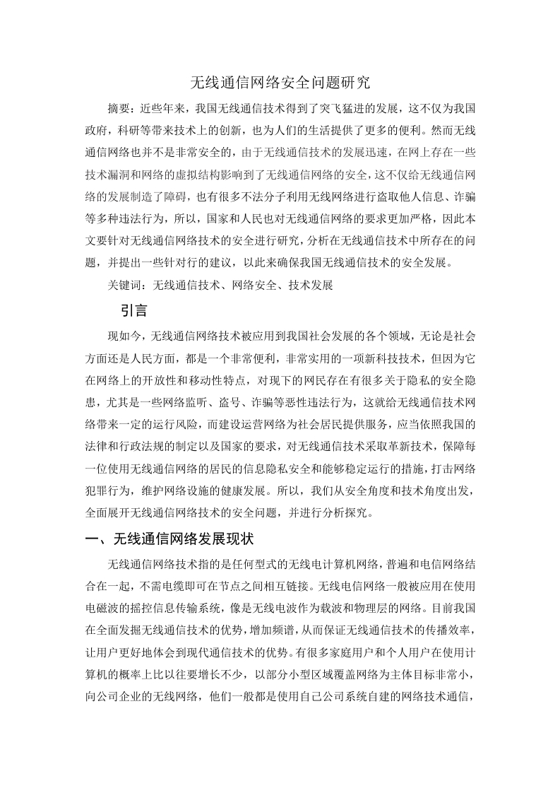 无线通信网络安全问题研究摘要:近些年来,我国无线通信技术得到了突飞猛进的发展,这不仅为我国政府,科研等带来技术上的创新,也为人们的生活提供了更多的便利。然而无线通信网络也并不是非常安全的,由于无线通信技术的发展迅速,在网上存在一些技术漏洞和网络的虚拟结构影响到了无线通信网络的安全,这不仅给无线通信网络的发展制造了障碍,也有很多不法分子利用无线网络进行盗取他人信息、诈骗等多种违法行为,所以,国家和人民也对无线通信网络的要求更加严格,因此本文要针对无线通信网络技术的安全进行研究,分析在无线通信技术中所存在的问题,并提出一些针对行的建议,以此来确保我国无线通信技术的安全发展。关键词:无线通信技术、网络安全、技术发展引言现如今,无线通信网络技术被应用到我国社会发展的各个领域,无论是社会方面还是人民方面,都是一个非常便利,非常实用的一项新科技技术,但因为它在网络上的开放性和移动性特点,对现下的网民存在有很多关于隐私的安全隐患,尤其是一些网络监听、盗号、诈骗等恶性违法行为,这就给无线通信技术网络带来一定的运行风险,而建设运营网络为社会居民提供服务,应当依照我国的法律和行政法规的制定以及国家的要求,对无线通信技术采取革新技术,保障每一位使用无线通信网络的居民的信息隐私安全和能够稳定运行的措施,打击网络犯罪行为,维护网络设施的健康发展。所以,我们从安全角度和技术角度出发,全面展开无线通信网络技术的安全问题,并进行分析探究。一、无线通信网络发展现状无线通信网络技术指的是任何型式的无线电计算机网络,普遍和电信网络结合在一起,不需电缆即可在节点之间相互链接。无线电信网络一般被应用在使用电磁波的摇控信息传输系统,像是无线电波作为载波和物理层的网络。目前我国在全面发掘无线通信技术的优势,增加频谱,从而保证无线通信技术的传播效率,让用户更好地体会到现代通信技术的优势。有很多家庭用户和个人用户在使用计算机的概率上比以往要增长不少,以部分小型区域覆盖网络为主体目标非常小,向公司企业的无线网络,他们一般都是使用自己公司系统自建的网络技术通信,所以有很多企业的网络技术与发展水平都参差不齐的,而以盈利性为目的去在很多商业集群、公益组织建立网络技术构架,这些网络是用户自己或者由系统集成商出资搭建的,这种免费的或者公益性的网络利用率很低,速率很慢。一些发达的先进城市,采用大面积覆盖网络的形式,进行各大运营商之间的统一部署和划分,这种设计和实施相对比较规范,但是真正能够普及到的地方还是很少。)二、关于无线通信网络存在的一些问题(一)不法分子网络攻击造成网络拥挤现在,网络技术日益革新,但是依旧很有很多不法份子对网络进行一些攻击犯罪行为,普通攻击是一般常见的攻击手段,不法分子会在无线网络区域里上截取大量的数据信息,然后再将这些网络数据信息放置一段时间,最后再重新发送给网络上信息的接收人。这样的攻击方式方式比较常见,它会在很大程度上延缓网络的传播效率,使网络通信信息不能及时更新,很多用户接收不到信息,造成网络拥挤和堵塞,或者造成区域网络信息混乱,一时难以恢复。这种攻击方式最大的弊端就是将网络用户的隐私信息泄露出去,无线通信网络覆盖面广,一旦有隐私泄露情况,就会很难修复。重传攻击会导致网络传播渠道的拥堵,也会使网络设备信息会出现瘫痪,所以,对于这一方面的攻击应该进行严厉打击,不能让犯罪分子再有可乘之机。(二)篡改网络用户信息信息篡改,对于无线网络来说是一个比较棘手的攻击手段,这种攻击手段在选择攻击者时要求很高,犯罪分子还是在无线网络区域截取大量的数据信息,然后对其中一些有价值的信息进行恶意篡改,最后再将这些篡改好的数据信息发送给接收者,这种篡改信息的恶劣手段一旦发生们将会更难恢复,它会直接导致无线通信网络信息传输传输的混乱,正常的合法用户不能再建立起网络连接,而犯罪分子的无限网络却被保护起来,篡改信息不仅给用户带来非常多的损失和很不利的使用网络环境,而且严重的影响到了无限通信网络的安全,是原有的稳定环境紊乱,不好修复,造成许多不可估量的损失。(三)假冒监听网络用户隐私还有许多的犯罪分子对网络用户隐私进行监听假冒的犯罪行为,通过监听用户的网络设备,来获取一些对自身有价值的信息,犯罪分子利用虚拟的网络通信技术,伪装成实体的网络通讯设备,对网络用户实时在线的监听手段,还冒用网络用户信息对其隐私进行对外泄露,在访问合法用户的无线网络通信系统之时,扰乱正常的控制中心和移动通信站之间的连接,打破无线网络的安全防线,使用无线控制中心的移动通讯数据连接,窃听或者盗取合法用户的身份信息,更有甚者直接冒充合法用户访问无线网络,进行非法利益获取,更严重的还会有犯罪分子掌握用户重要的信息后有敲诈勒索的恶劣行为。四三、针对无线通信安全网络的建议(一)加强网络信息加密的建设加强无线通信网络中信道加密技术能够有效的提高网络自身和接入设备的安全性,一般是利用无线信道的特性和接入方式来提高网络整体的安全性,利用信道多样的特点在服务入口端和设备自身端加设